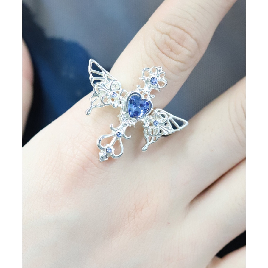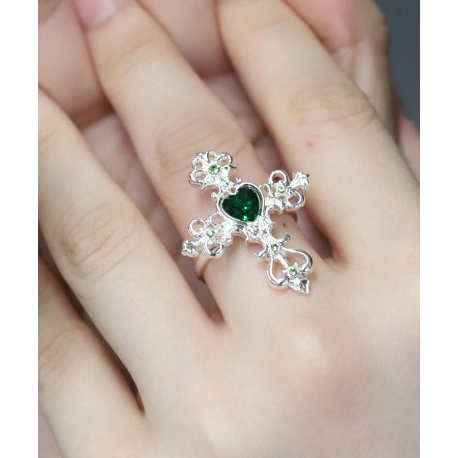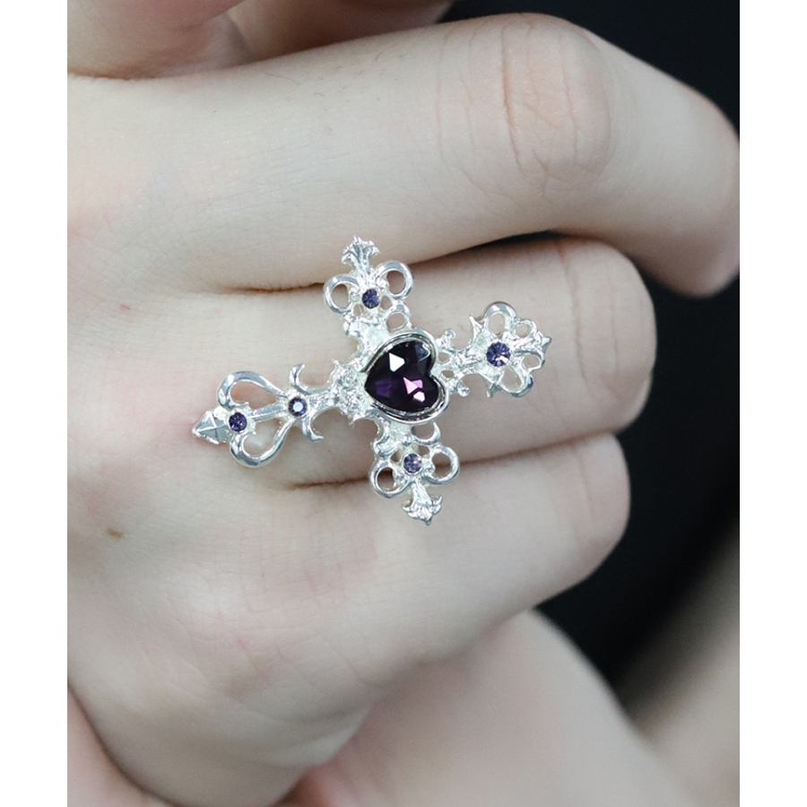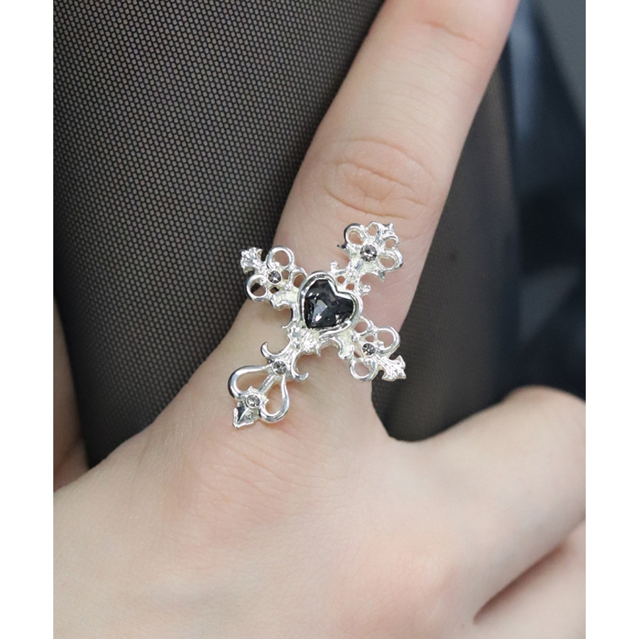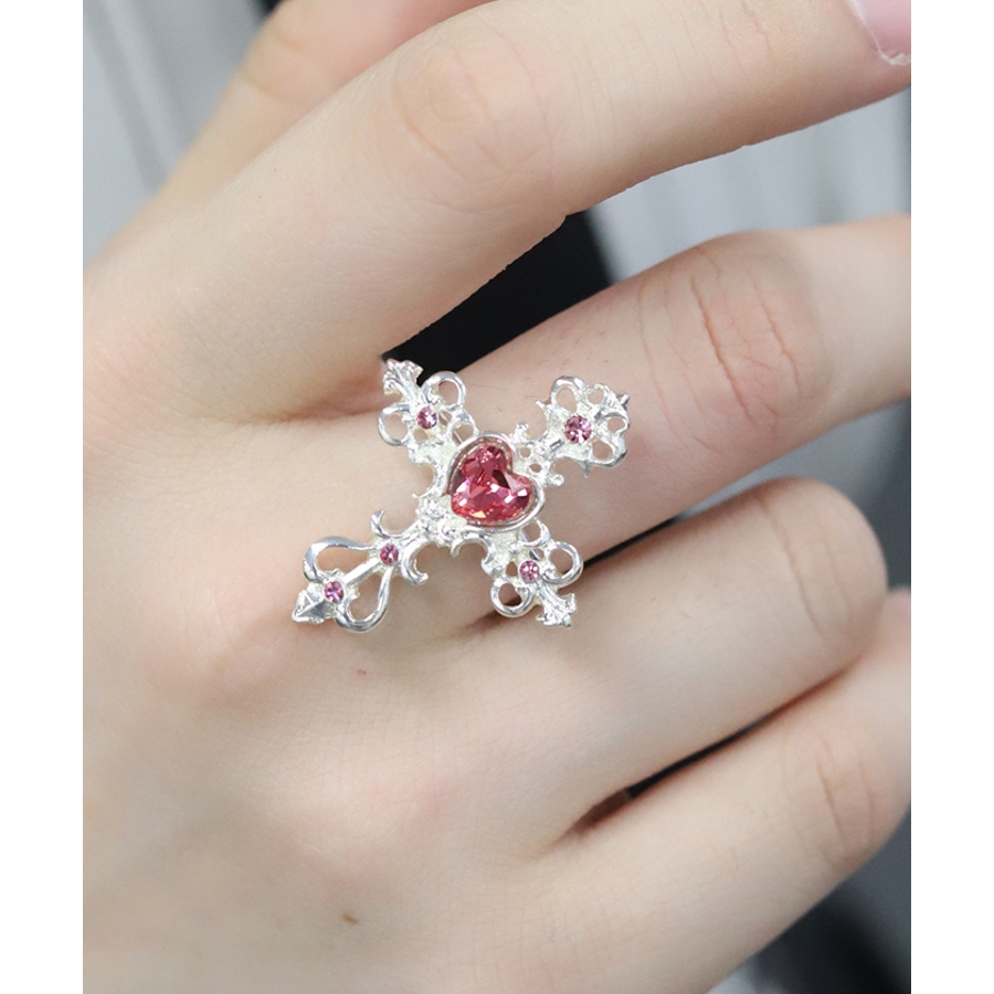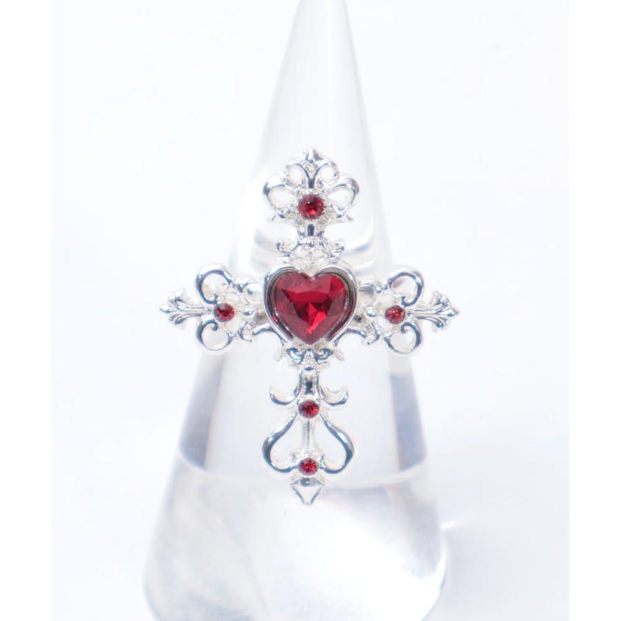 繊細なクロスモチーフにあしらったハート型のカラーストーンが目を惹くリングです。