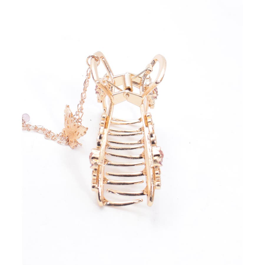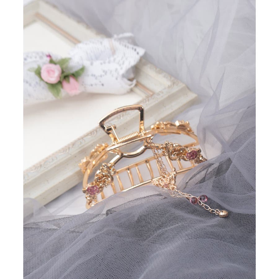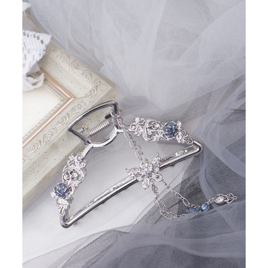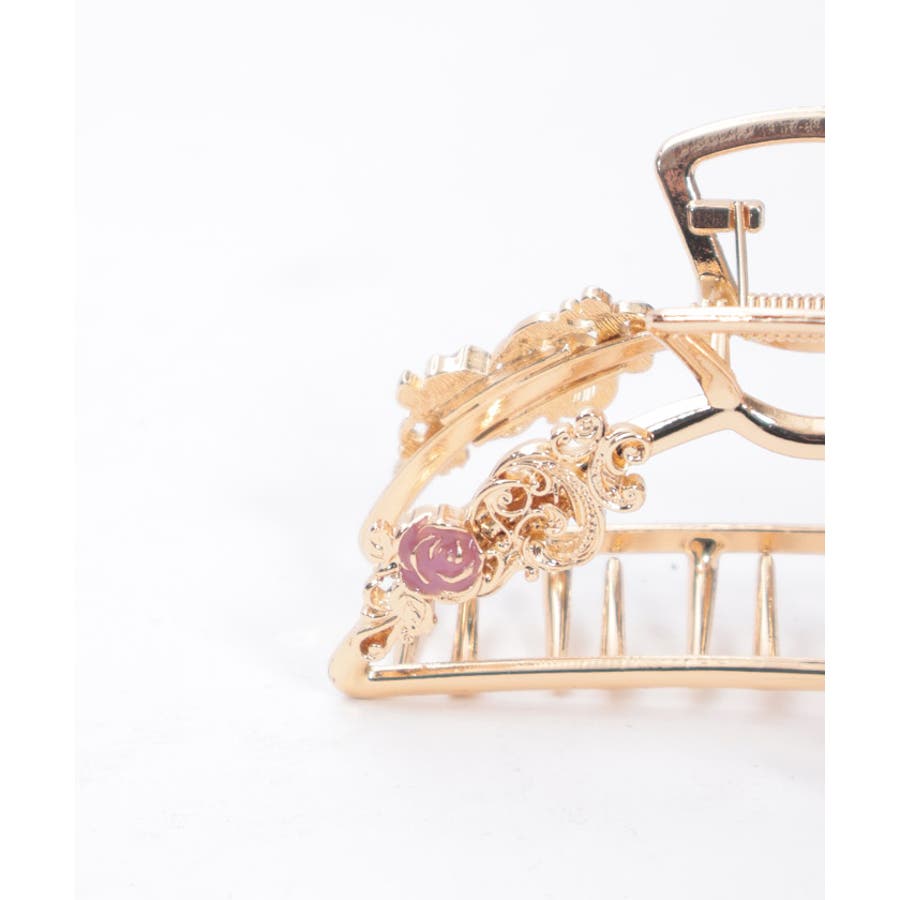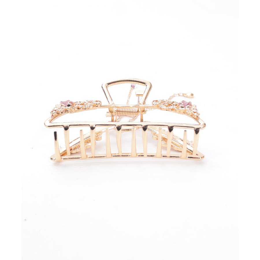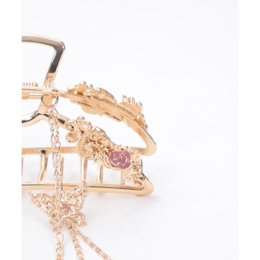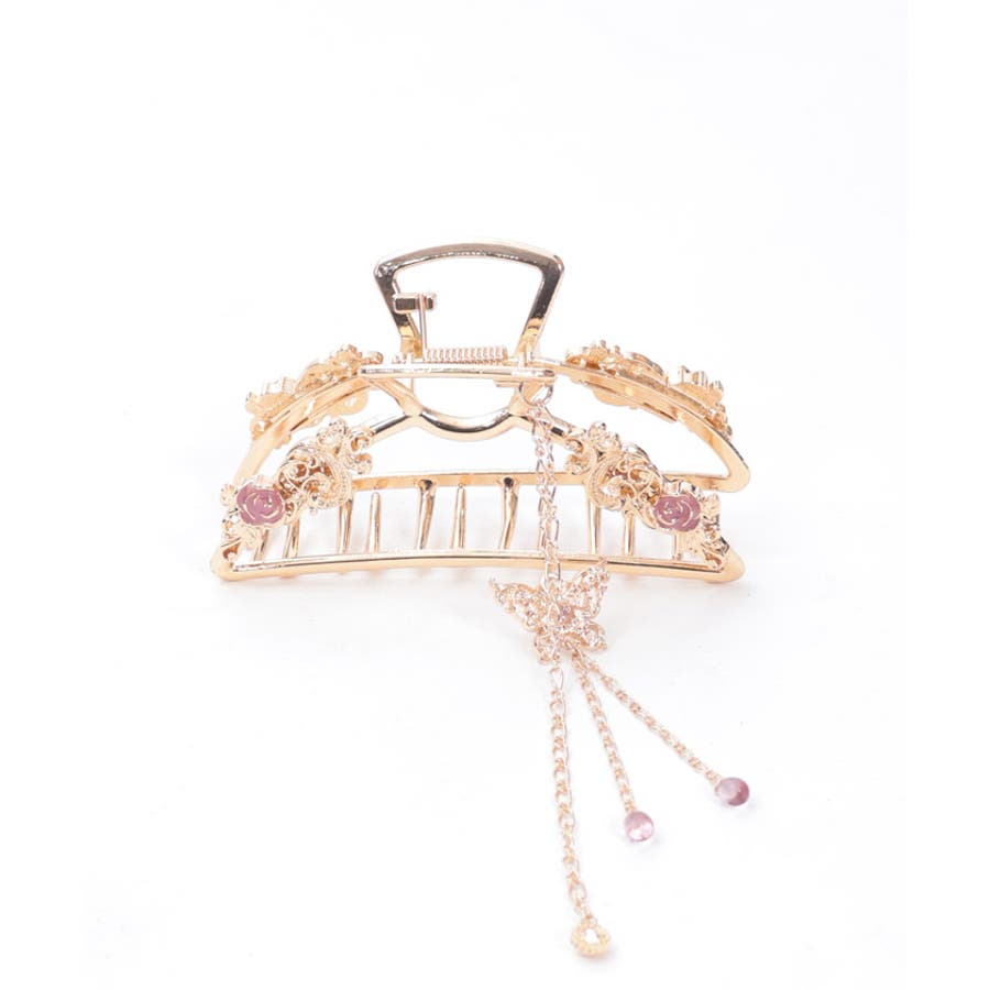 繊細な装飾と鮮やかな薔薇モチーフをあしらった、蝶モチーフが揺れるバンスクリップです。
