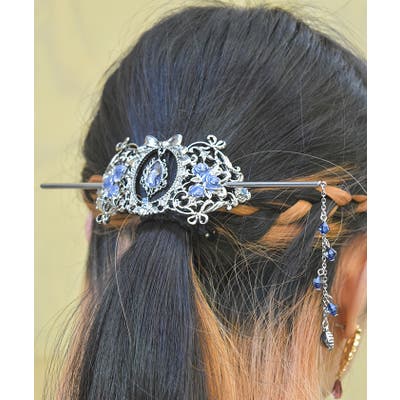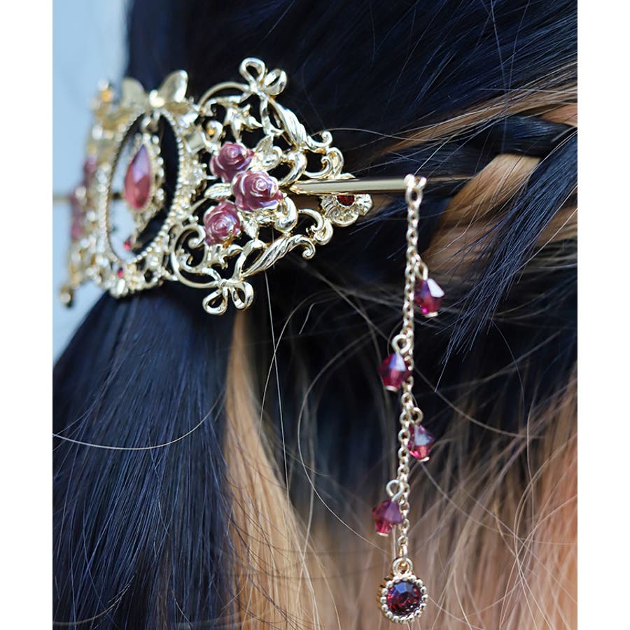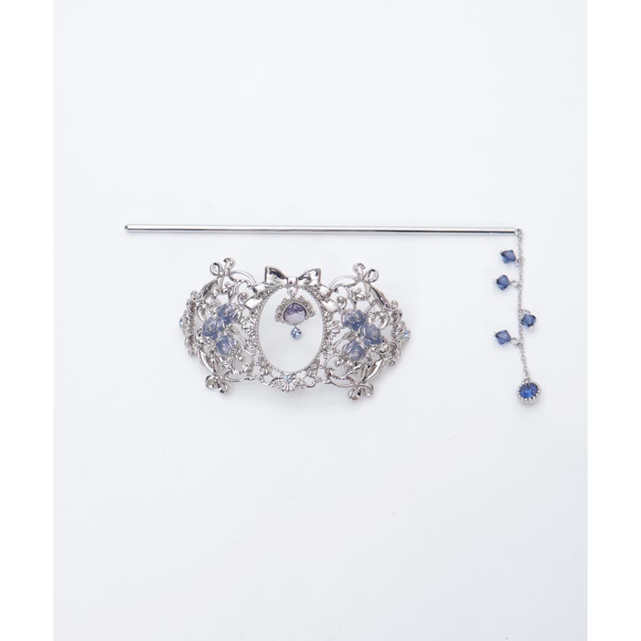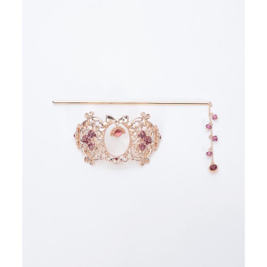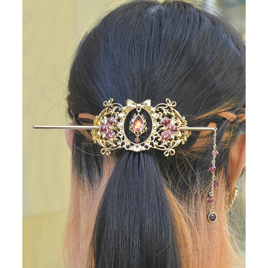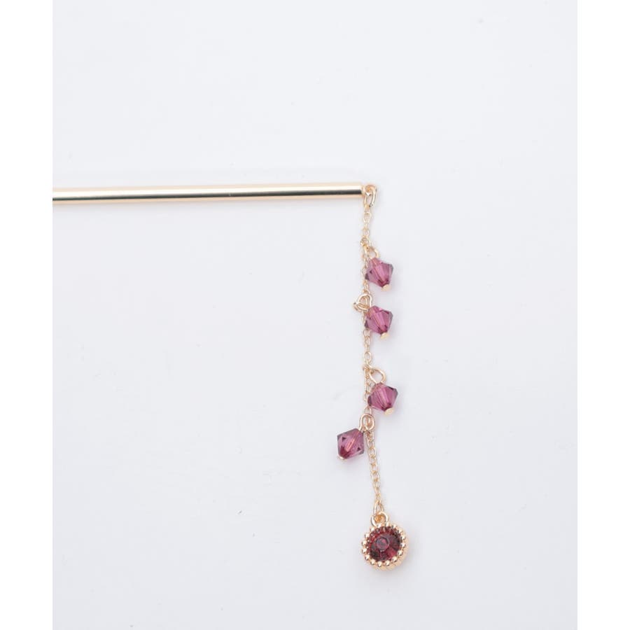 かんざしにもストーンとビーズがついたチェーンを合わせ、ヘアスタイルにエレガントさを添えてくれます。