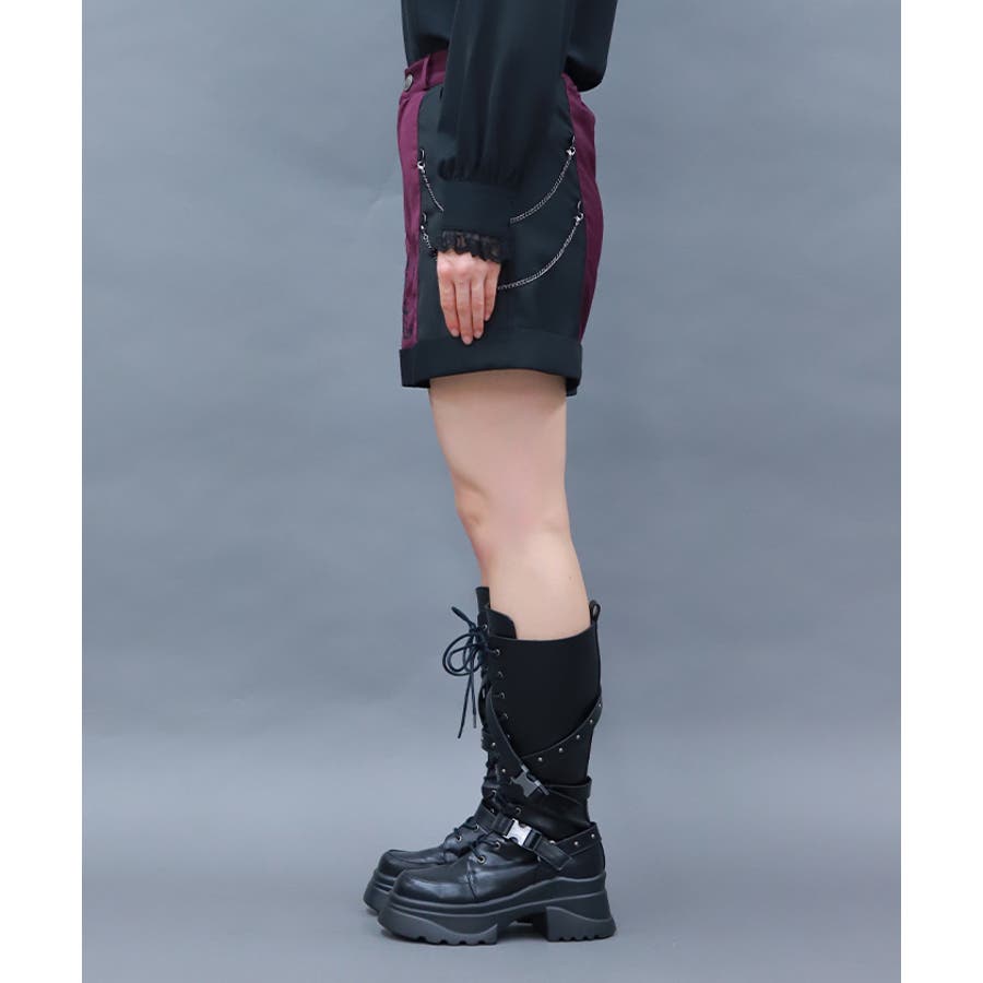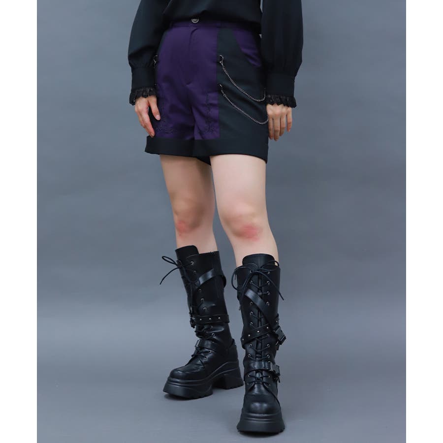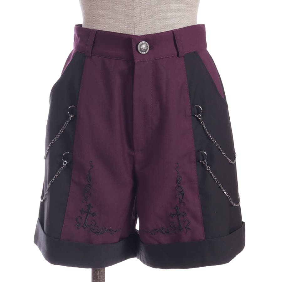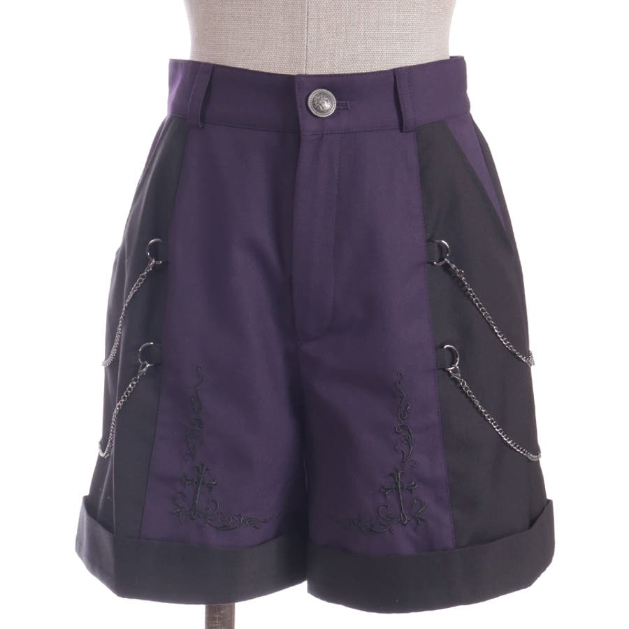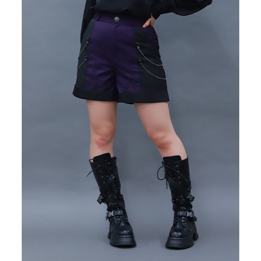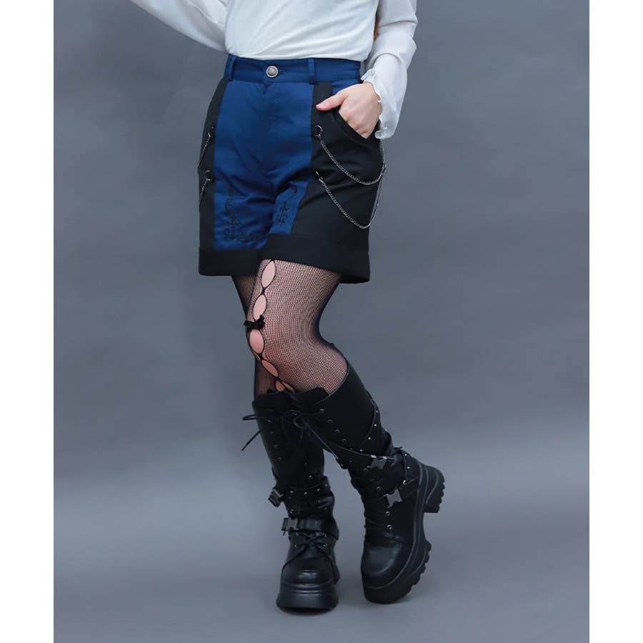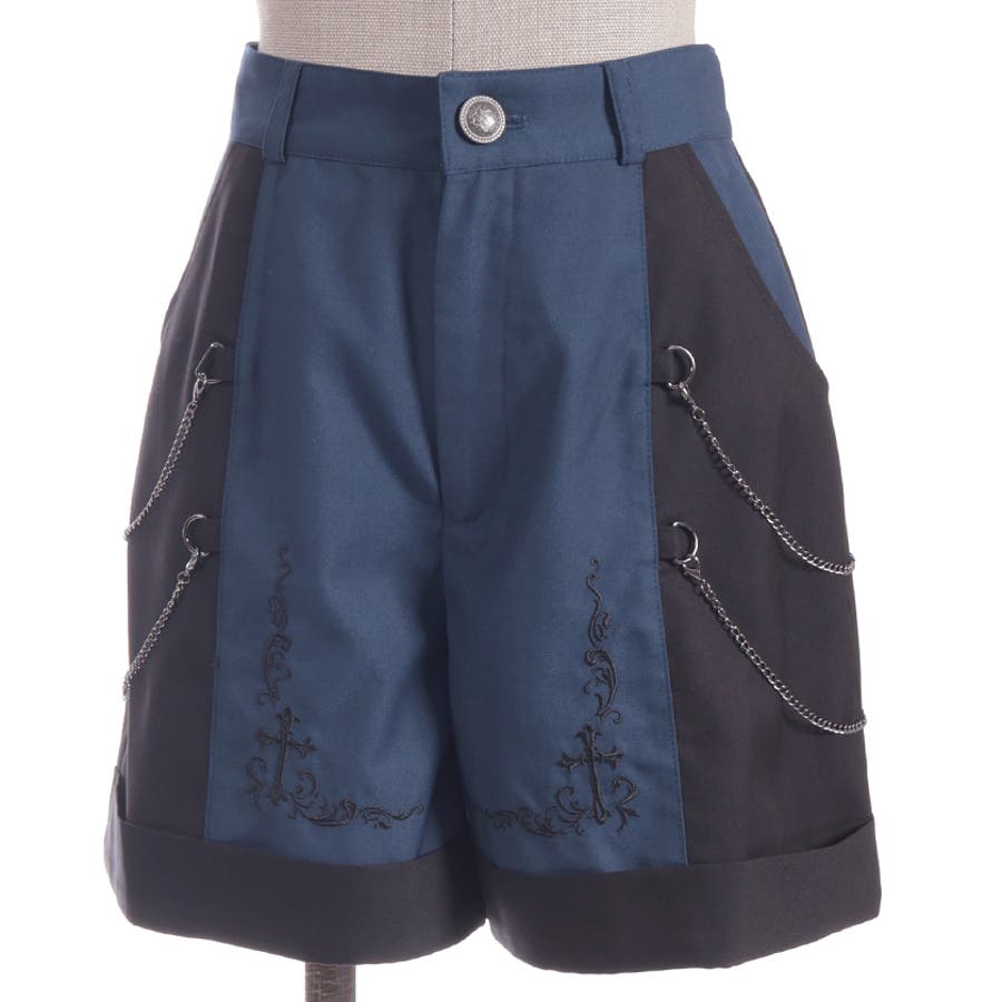 バイカラーデザインと裾にあしらわれたクロスモチーフ刺繍でゴシックパンクなテイストを取り入れたショートパンツです。