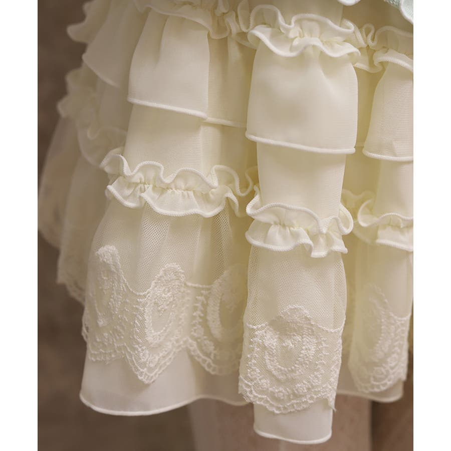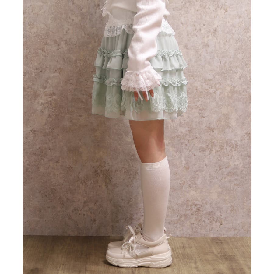 フリルとレースを重ねたデザインがほどよい甘さを演出し、適度なボリューム感でシルエットがきれいにまとまります。ウエストはゴム仕様で、デイリーに取り入れやすい穿き心地も魅力です。