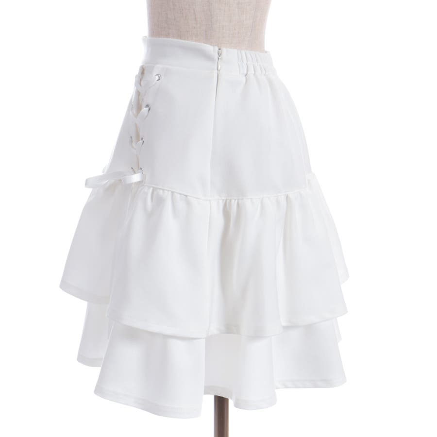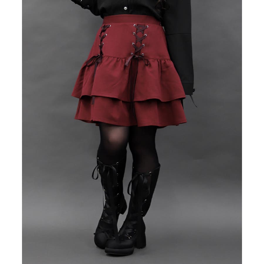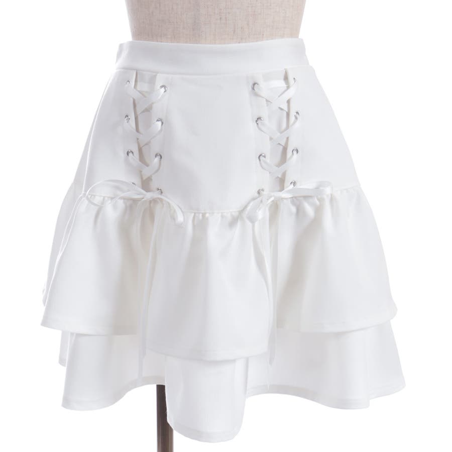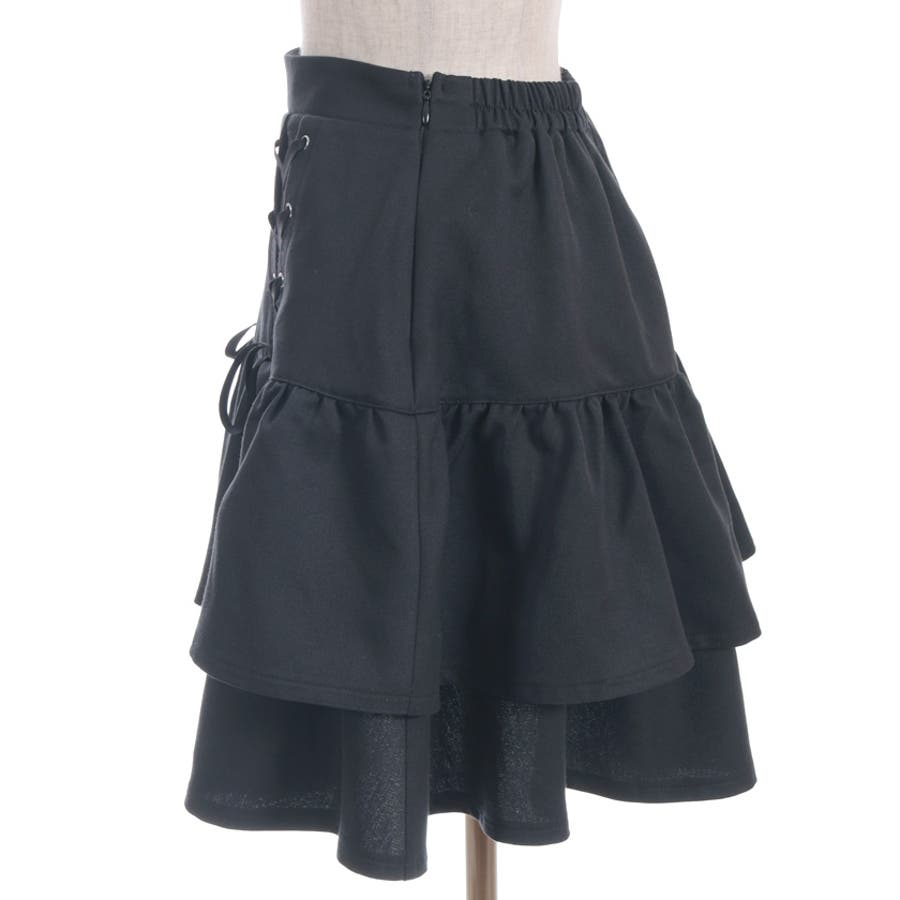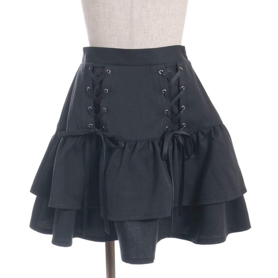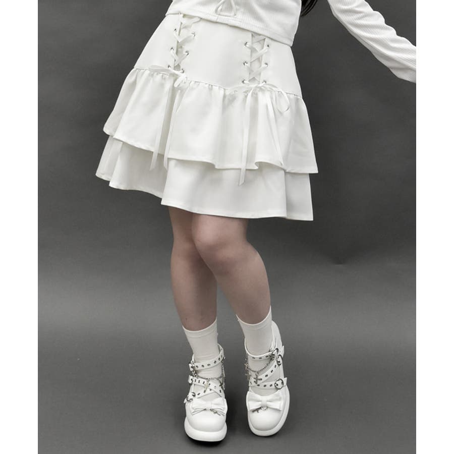 両サイドにレースアップのデザインがついており、2段フリルでボリューミーに広がるシルエットが可愛い1枚です。