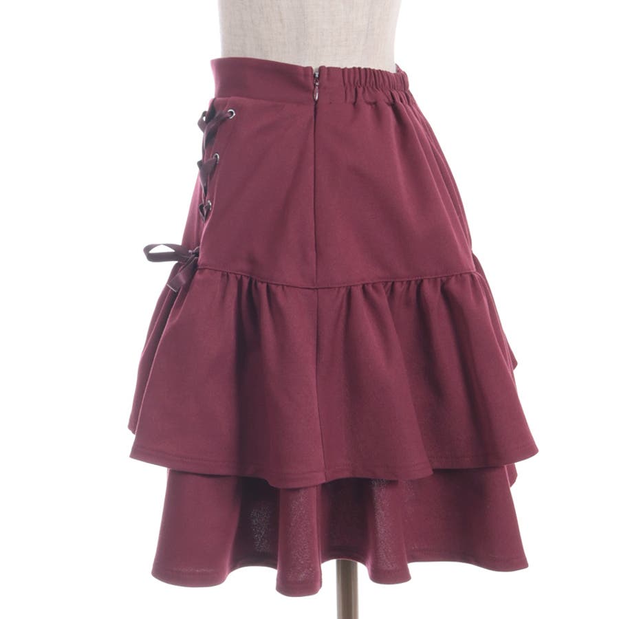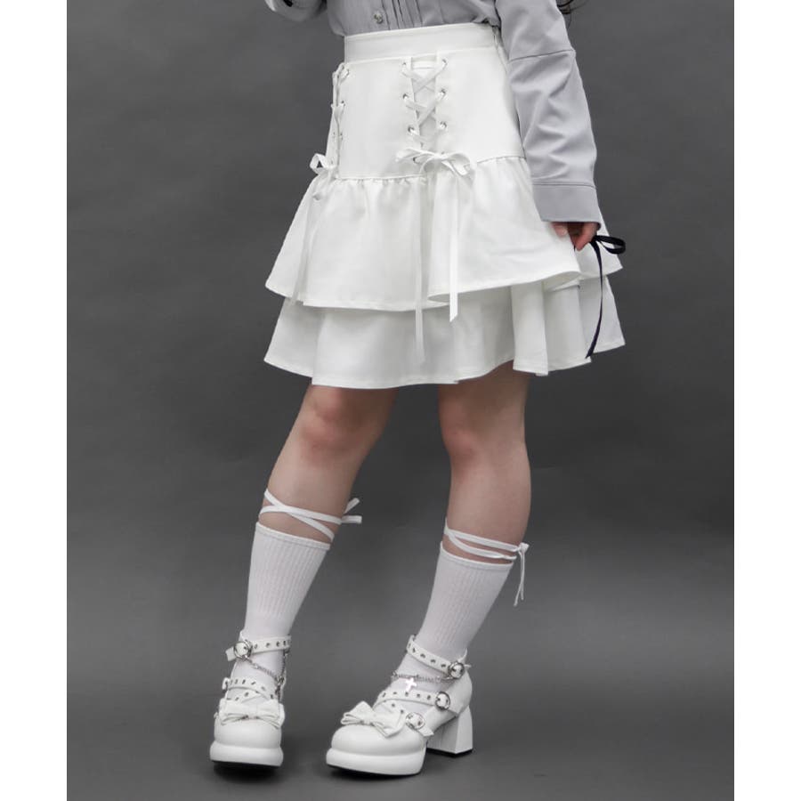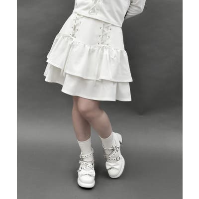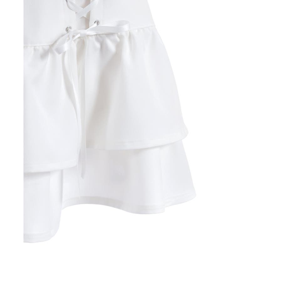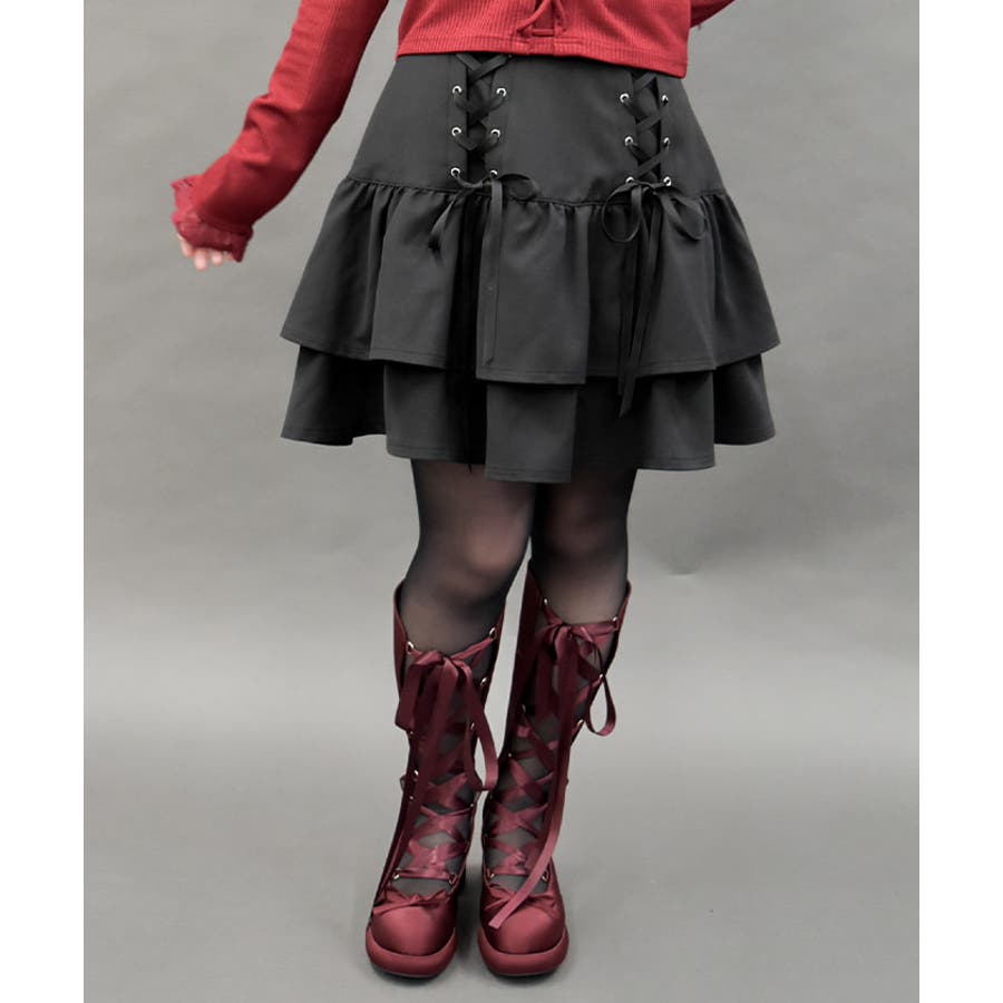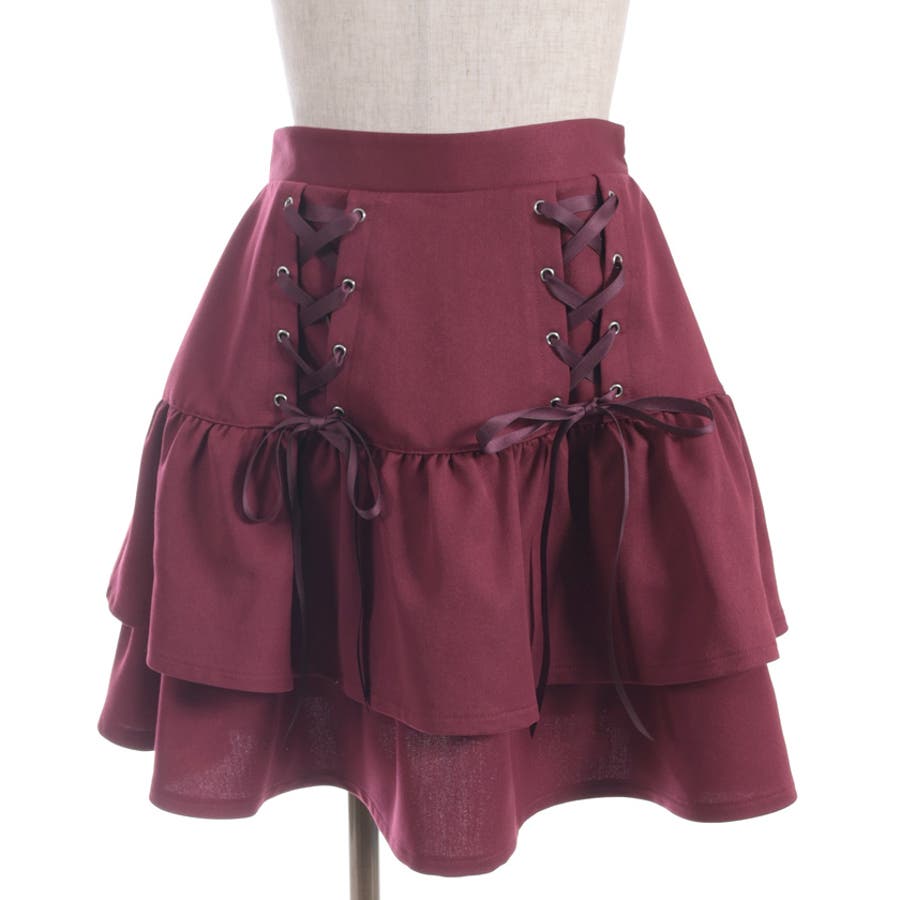 両サイドにレースアップのデザインがついており、2段フリルでボリューミーに広がるシルエットが可愛い1枚です。