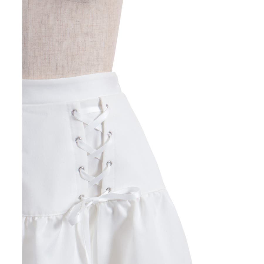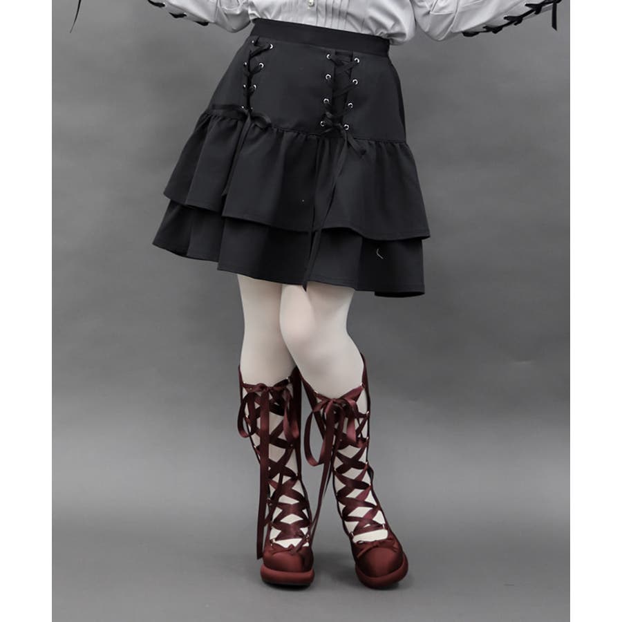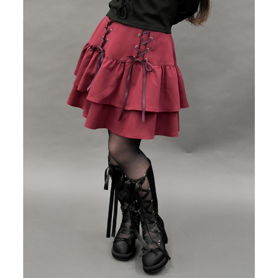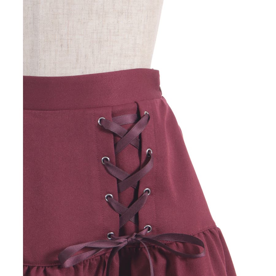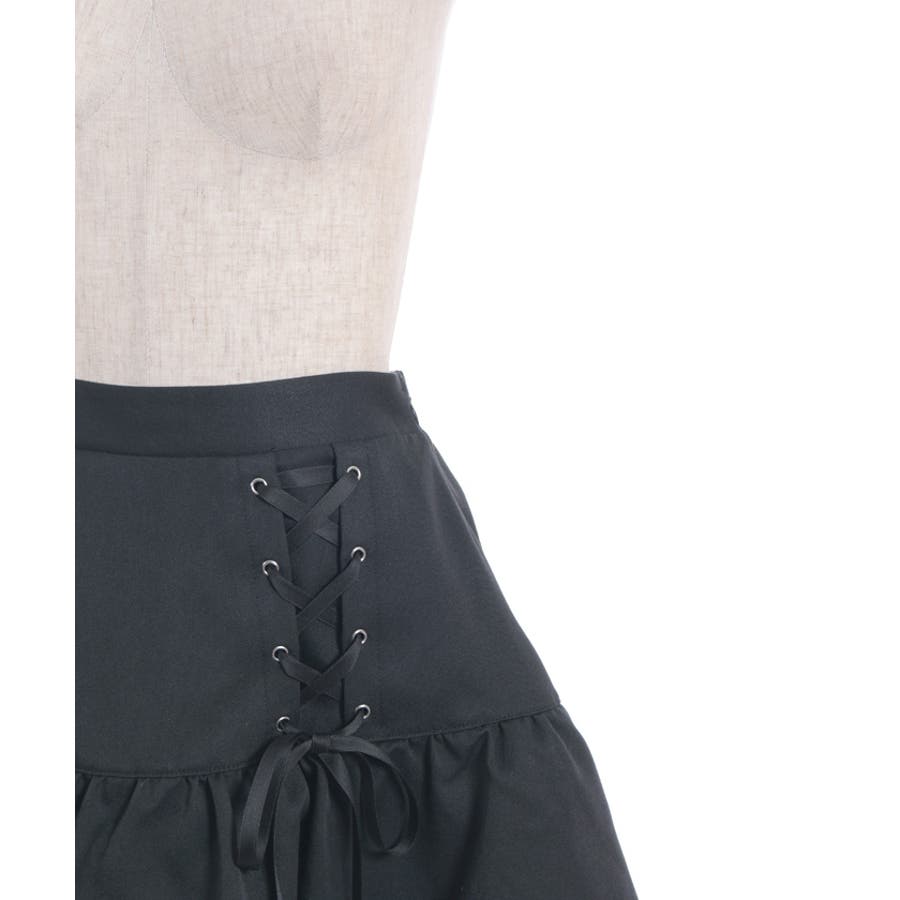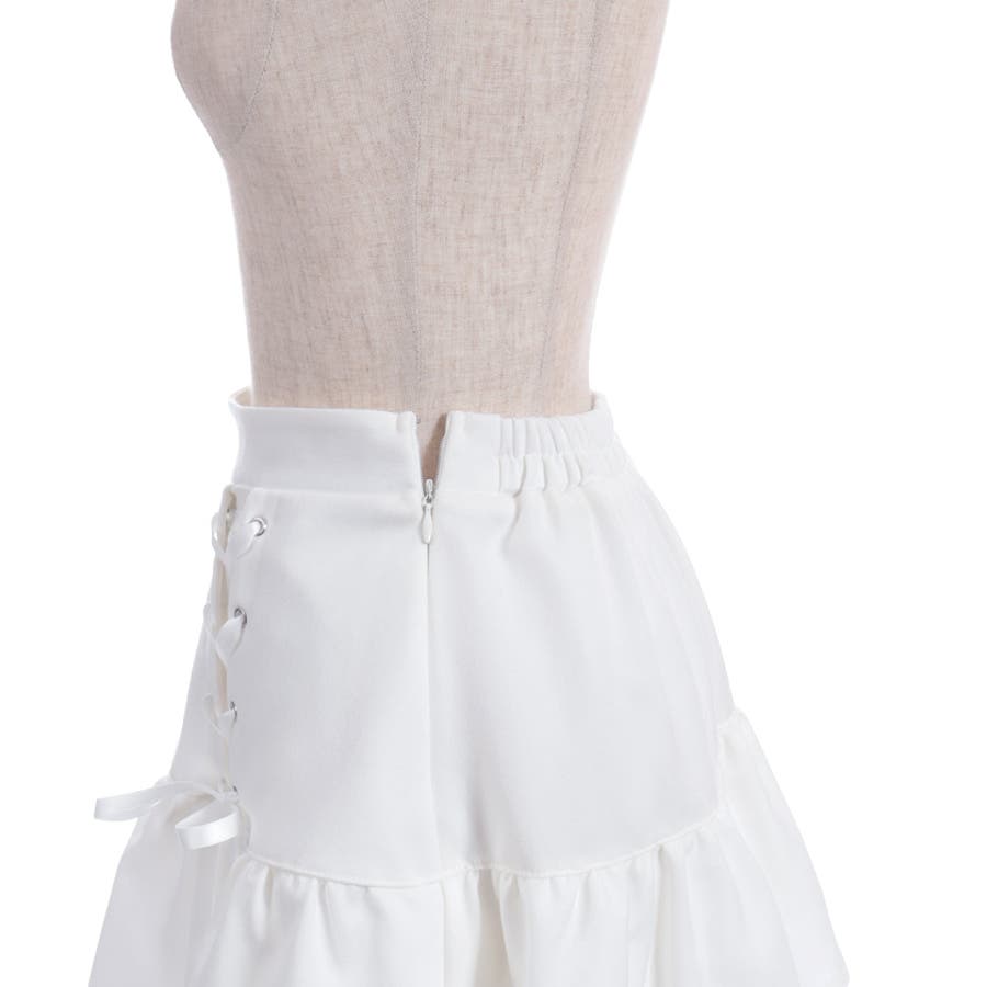 両サイドにレースアップのデザインがついており、2段フリルでボリューミーに広がるシルエットが可愛い1枚です。