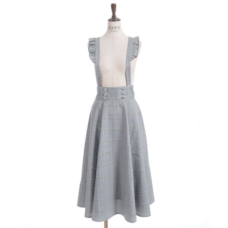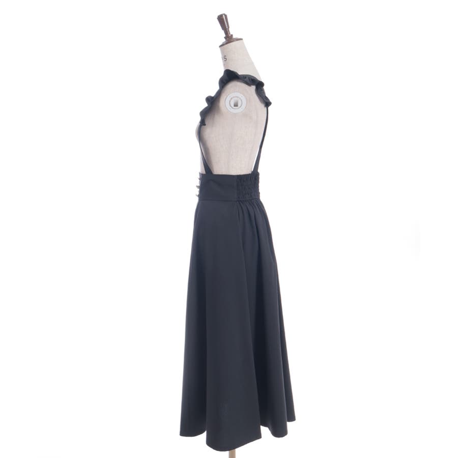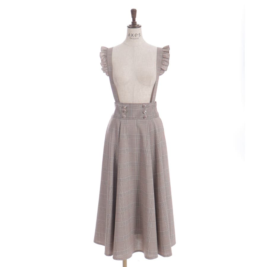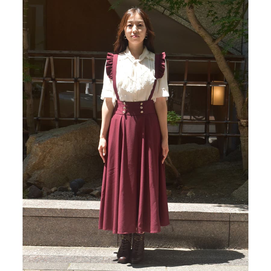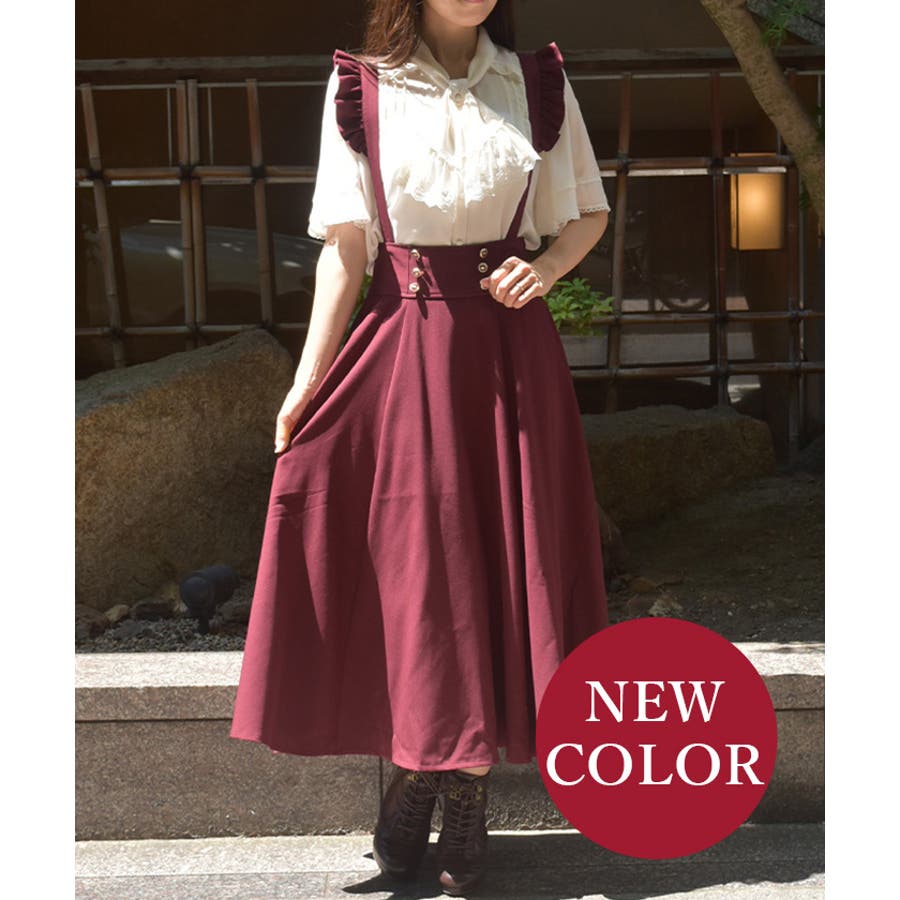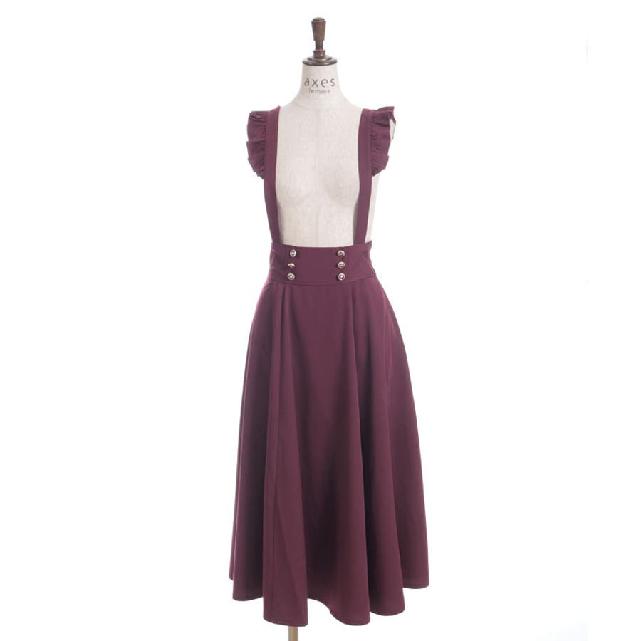 シンプルなハイウエストデザインのスカートにボタンやサスペンダーがアクセントになったアイテム。