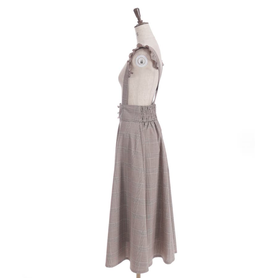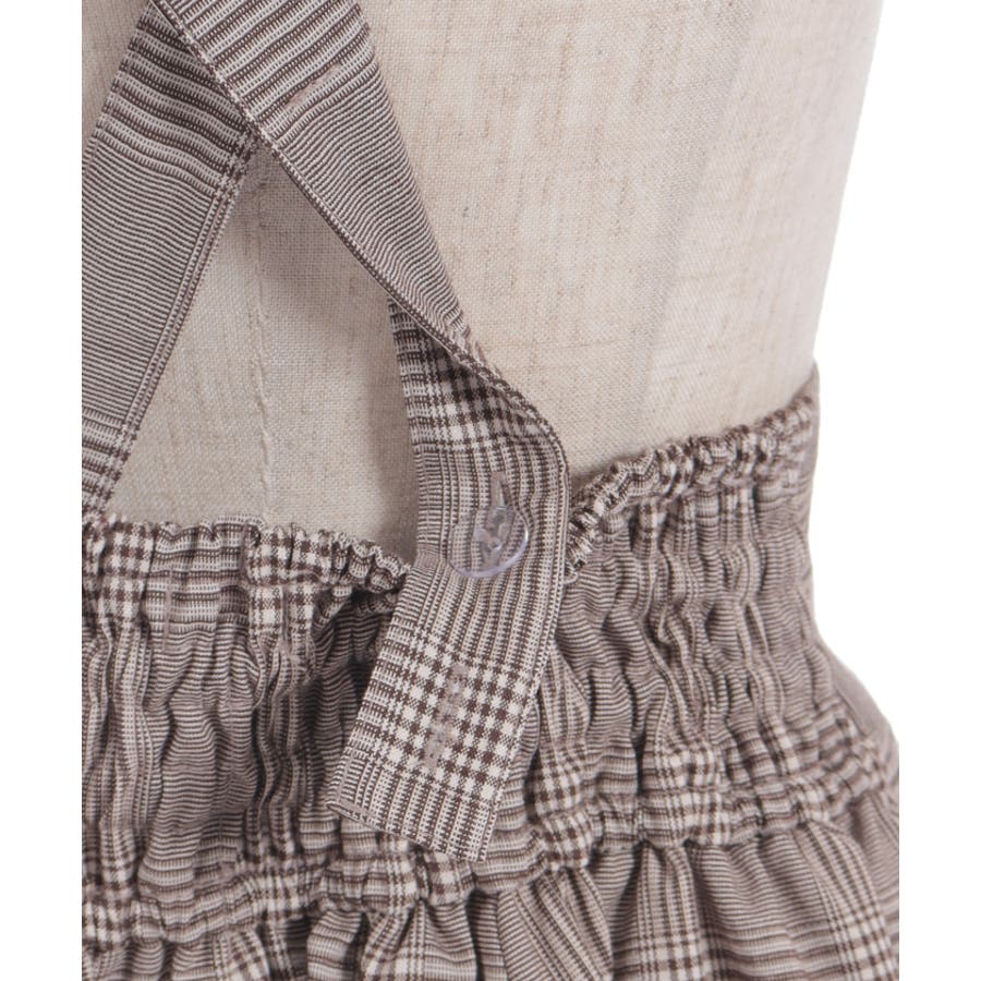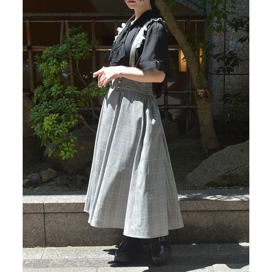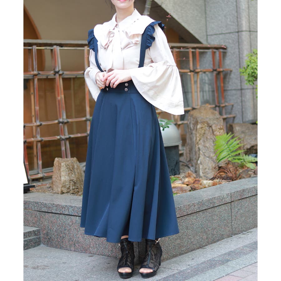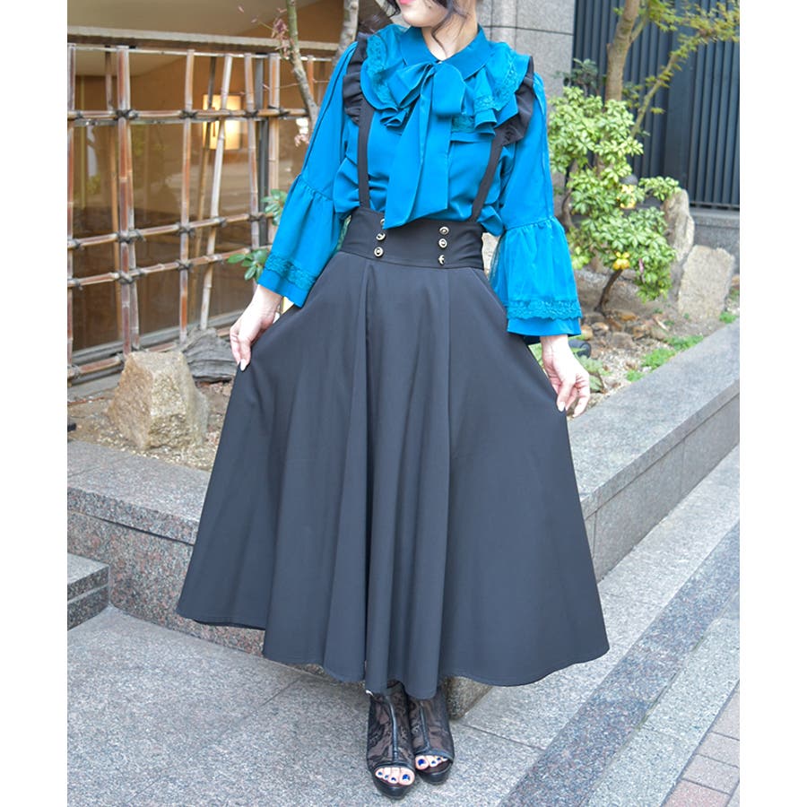 シンプルなハイウエストデザインのスカートにボタンやサスペンダーがアクセントになったアイテム。