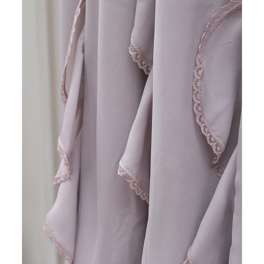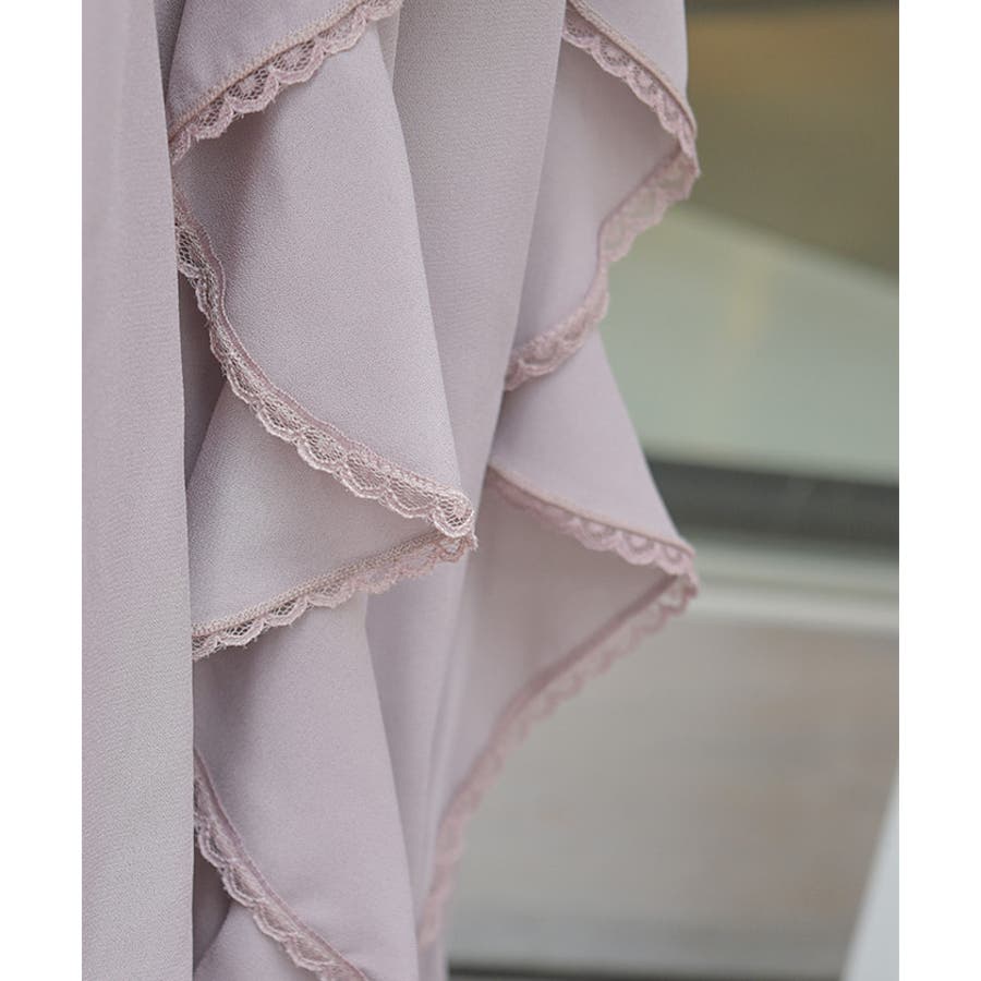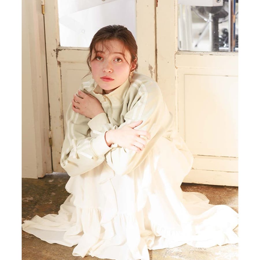 上下に流れるようなラッフルフリルを贅沢にあしらった1着。