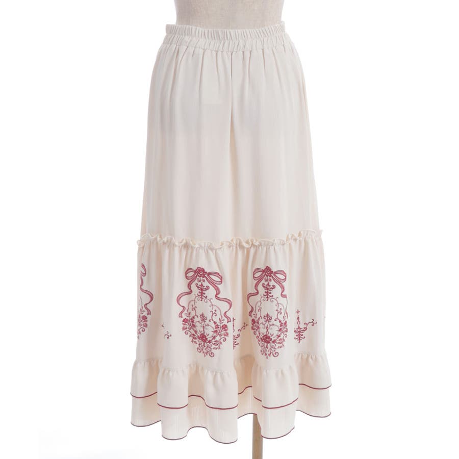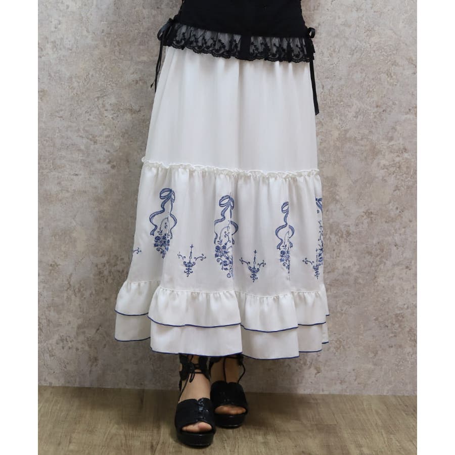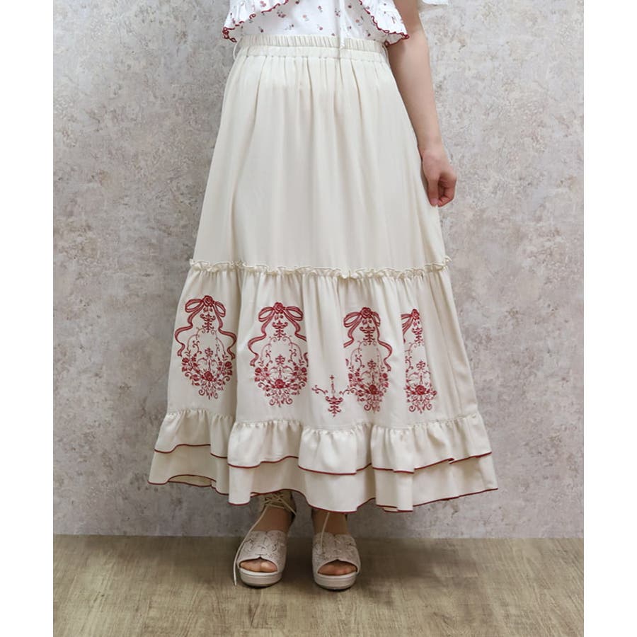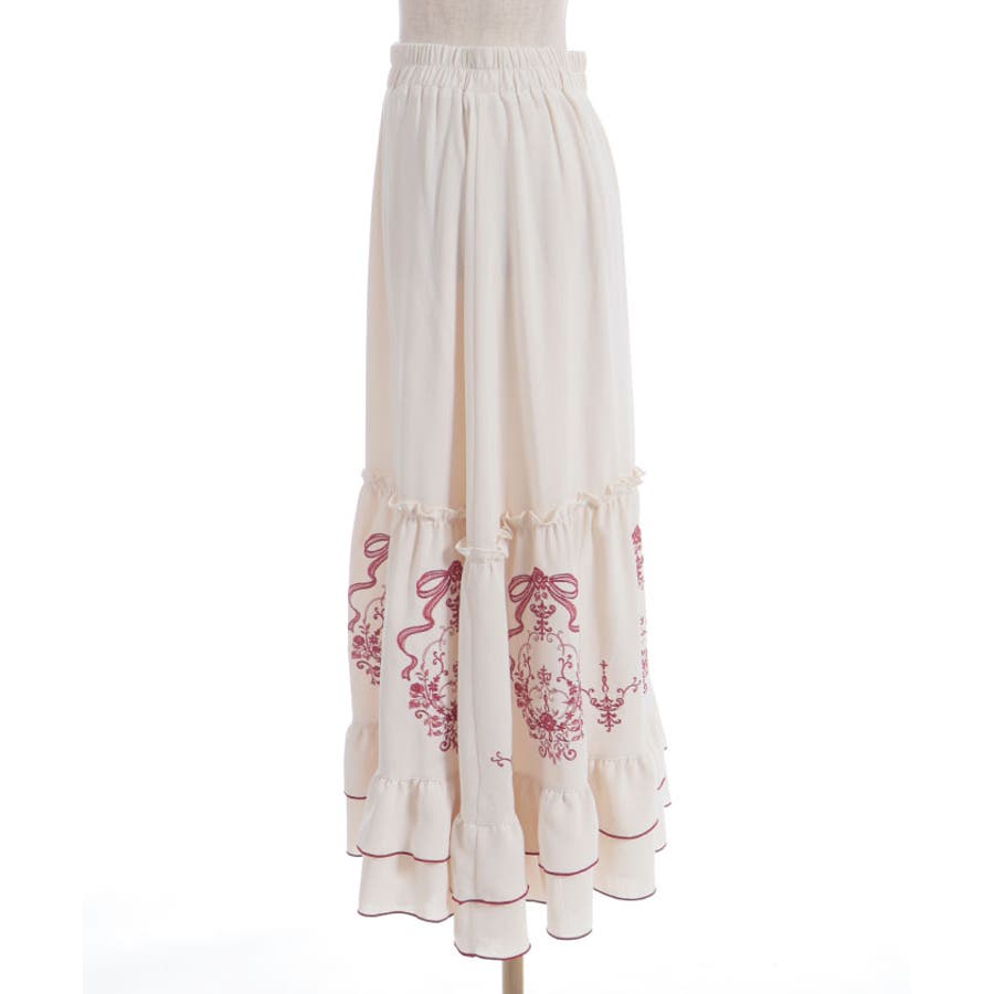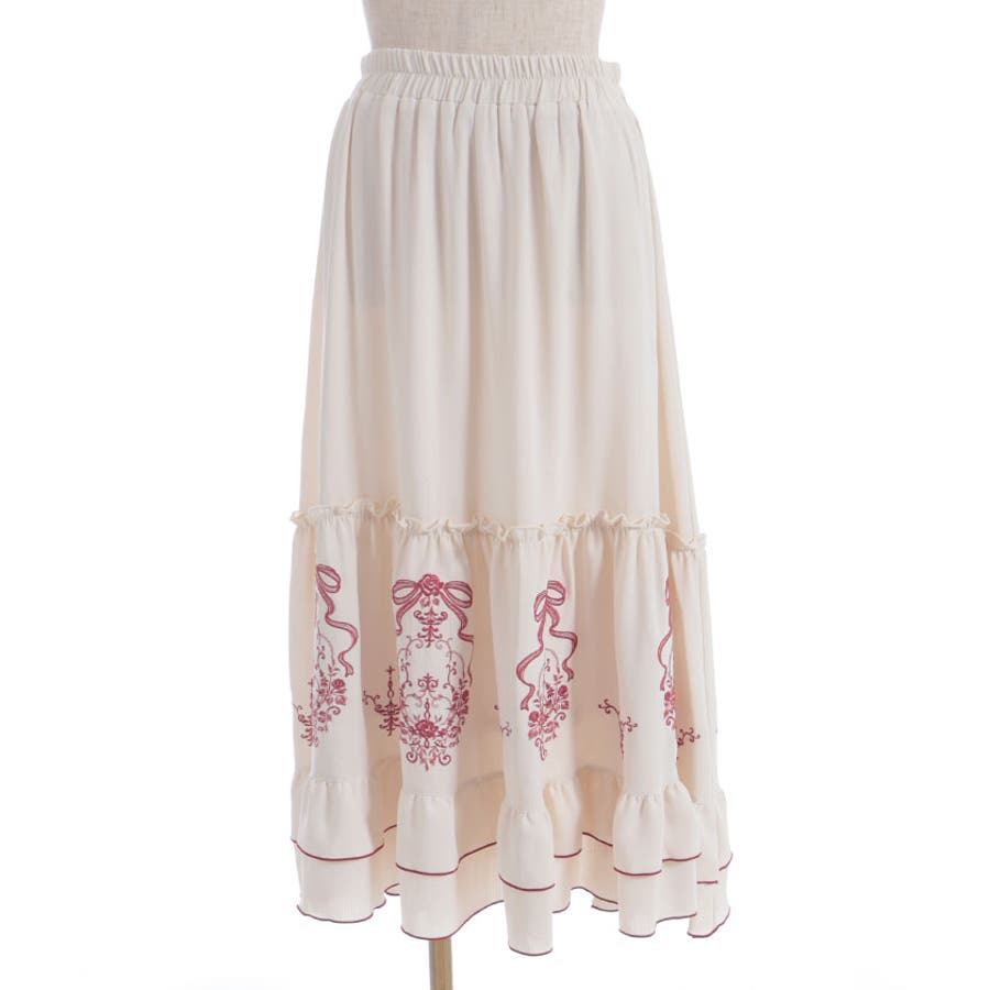 アンティーク調なフラワーモチーフ×リボンの刺繍が華やかで目を惹くロングスカートです。