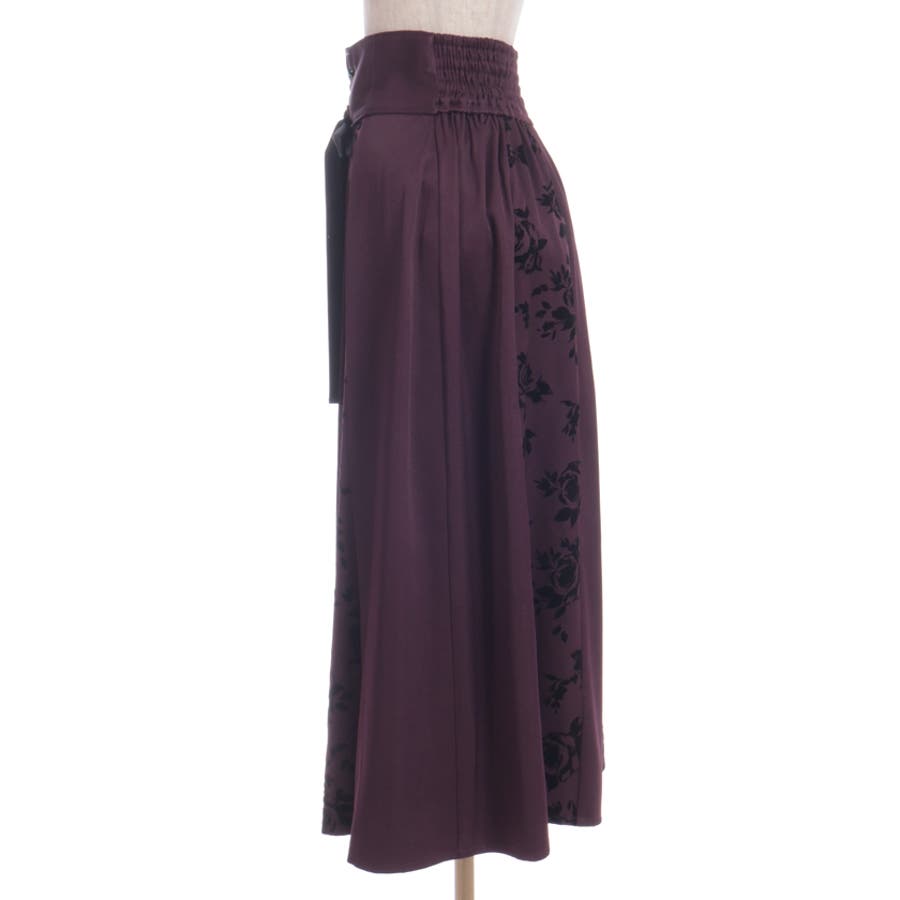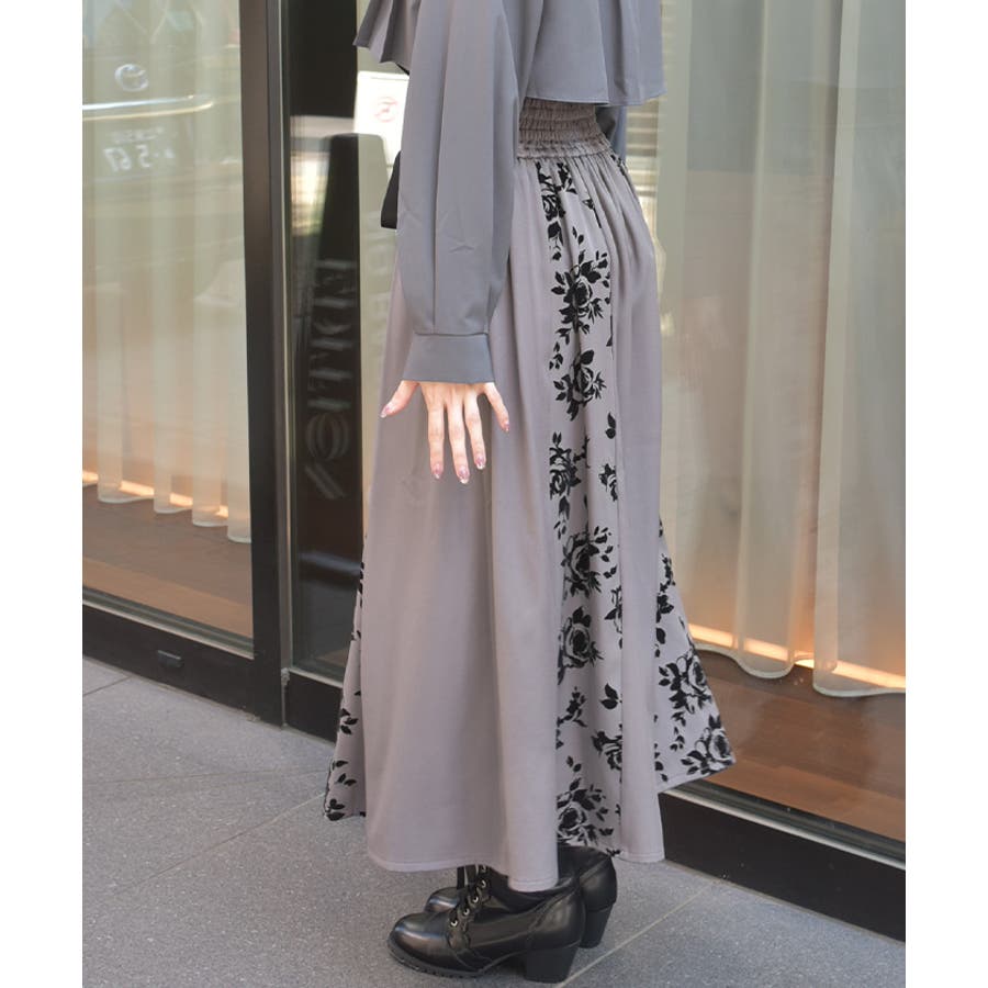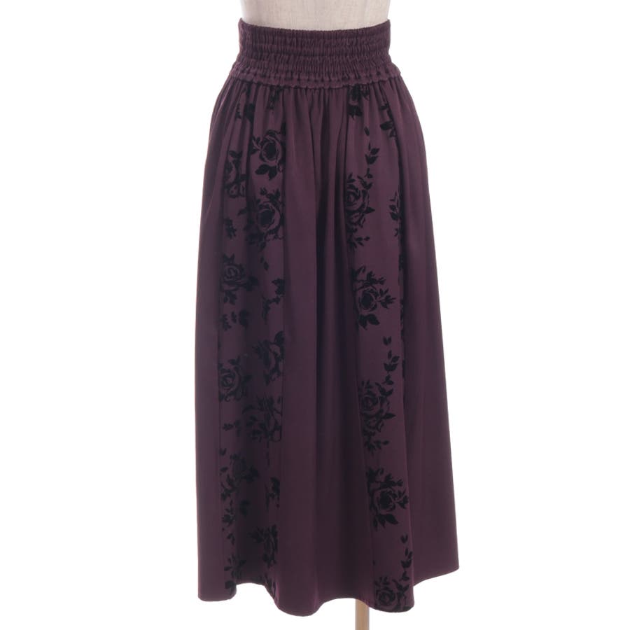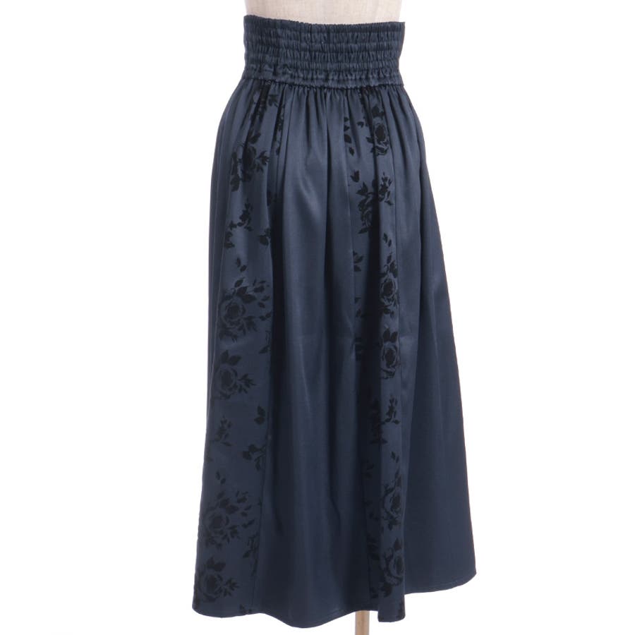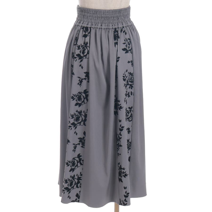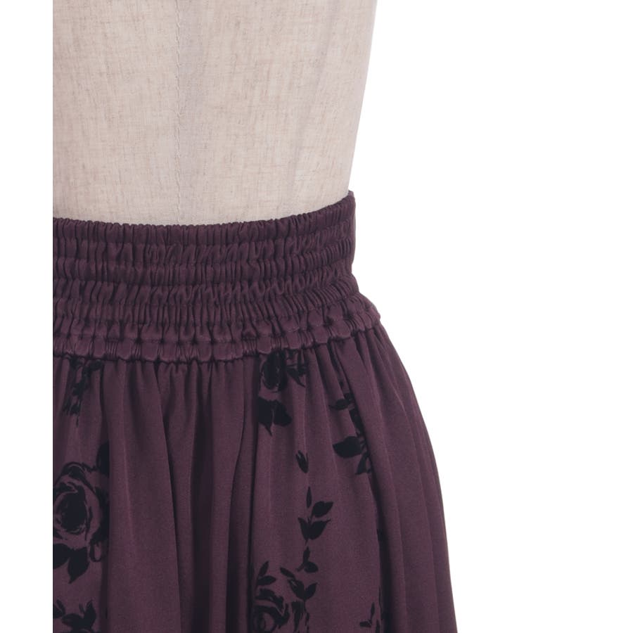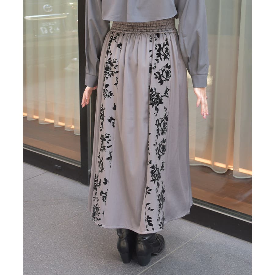 モード感とエレガンスを兼ね備えたロングスカート。上品なローズ柄をフロッキープリントで表現し、華やかさと奥行きをプラスしています。