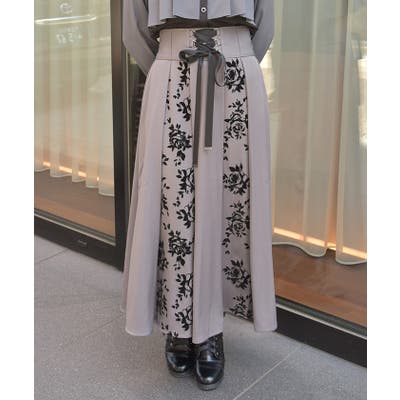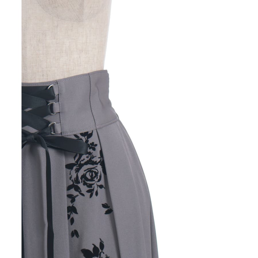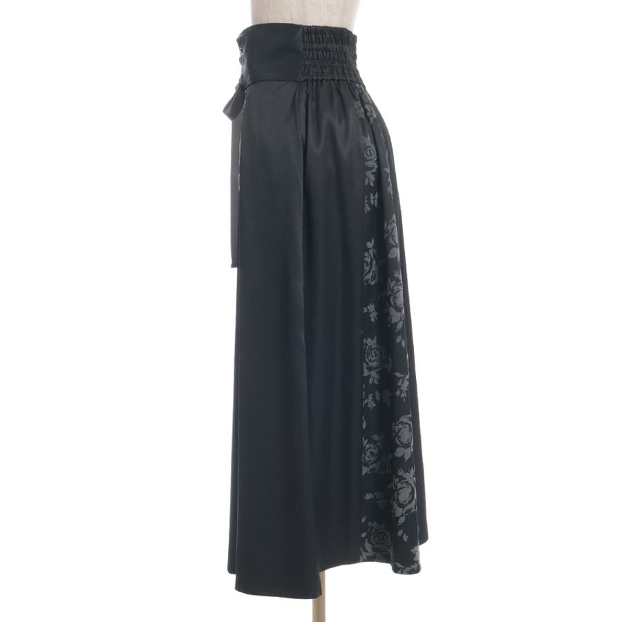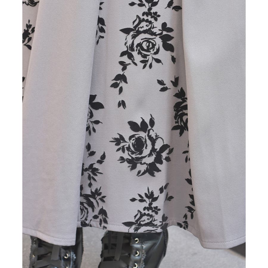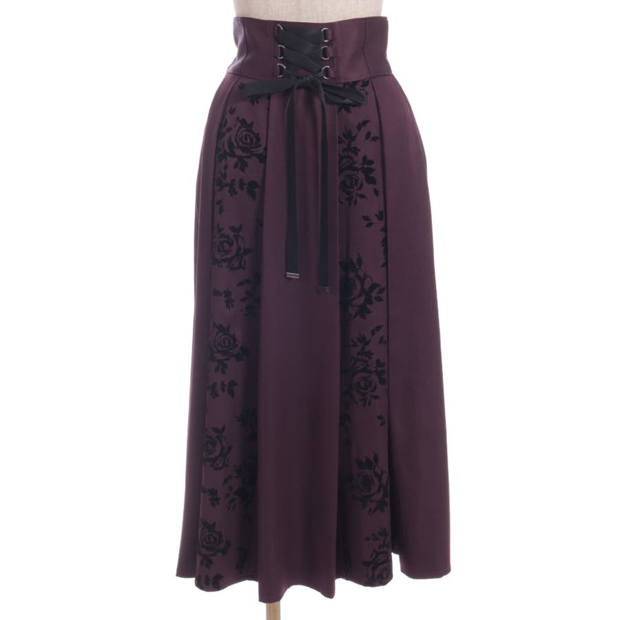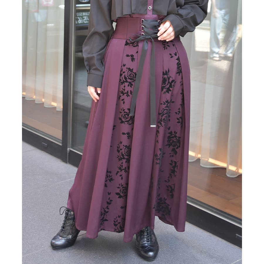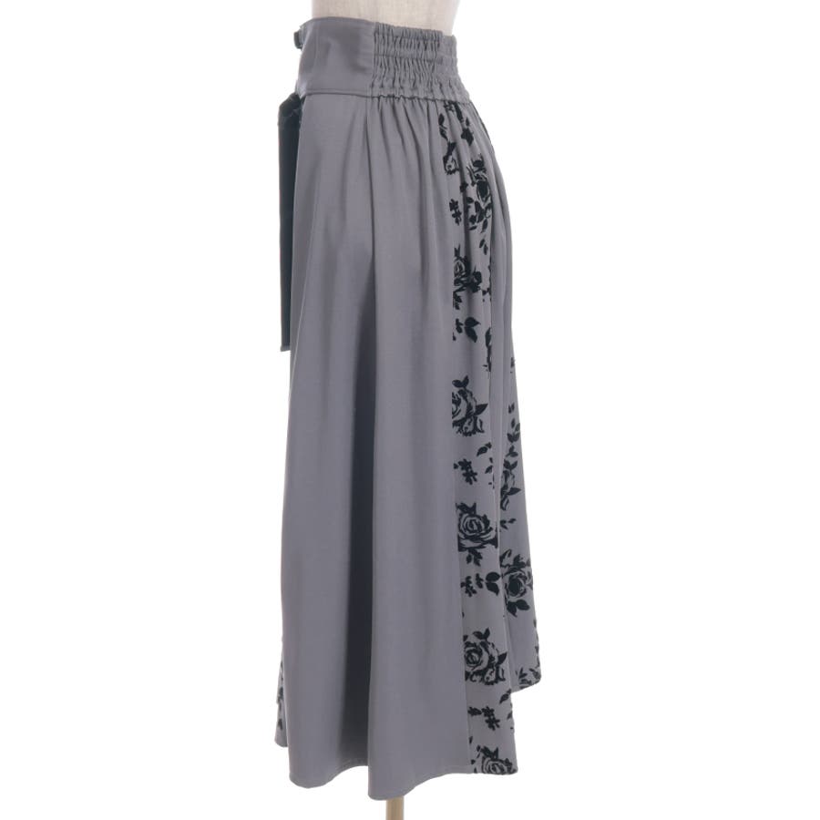 モード感とエレガンスを兼ね備えたロングスカート。上品なローズ柄をフロッキープリントで表現し、華やかさと奥行きをプラスしています。