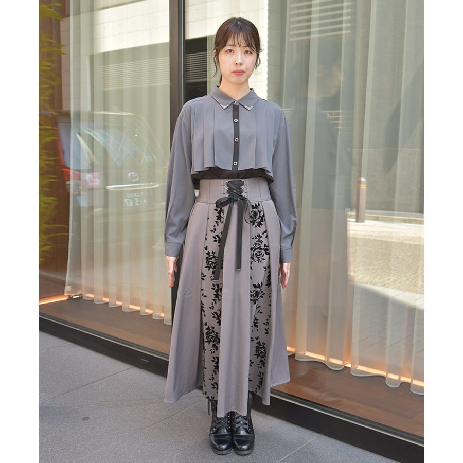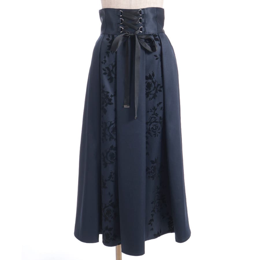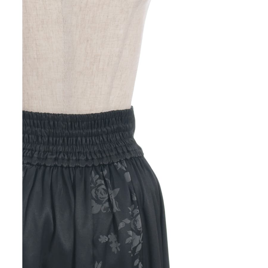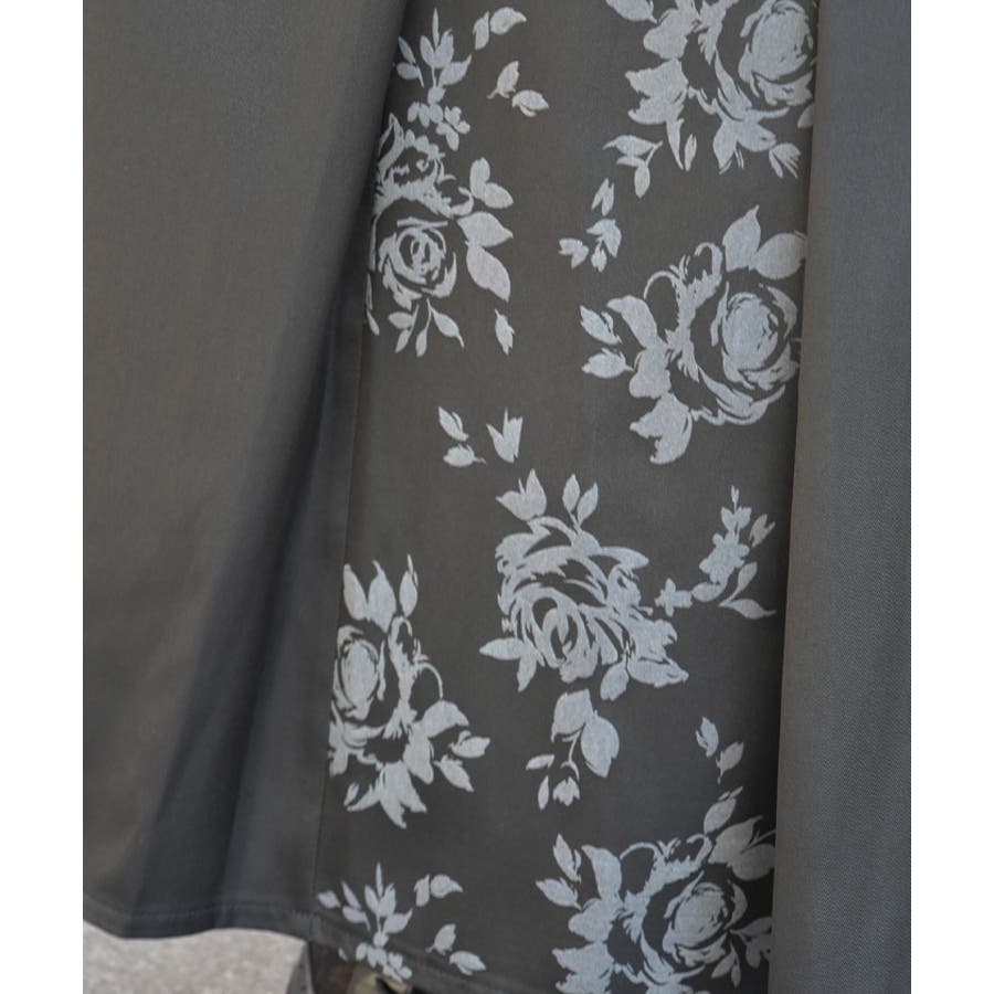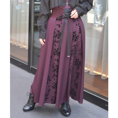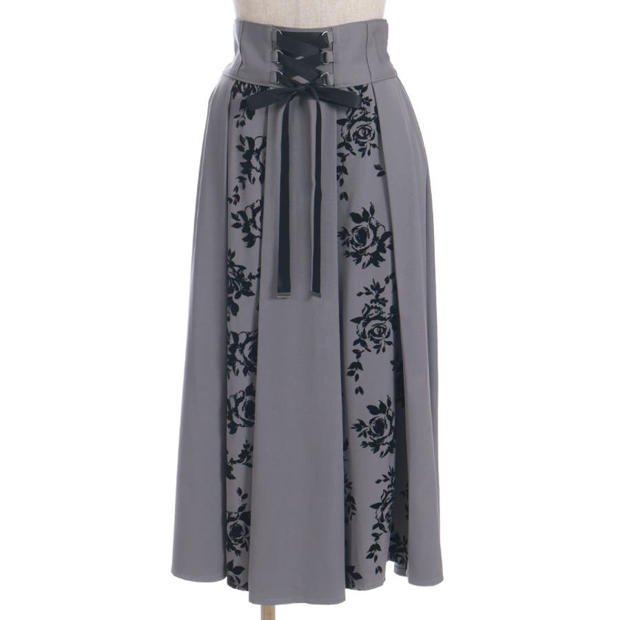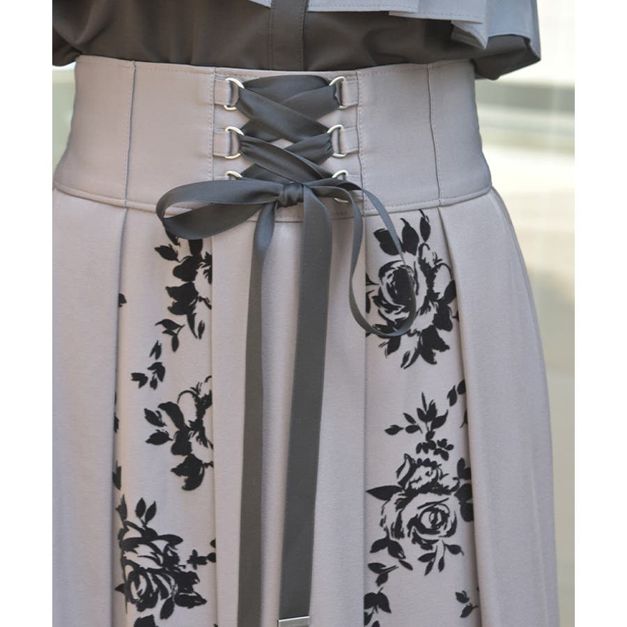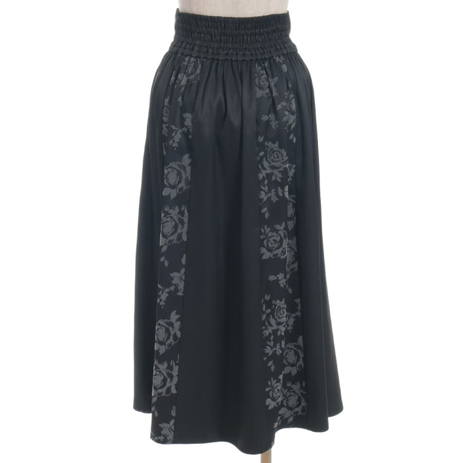 モード感とエレガンスを兼ね備えたロングスカート。上品なローズ柄をフロッキープリントで表現し、華やかさと奥行きをプラスしています。