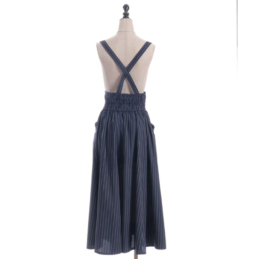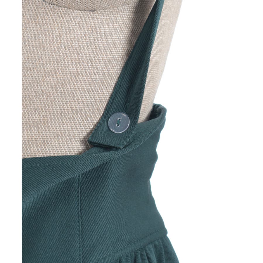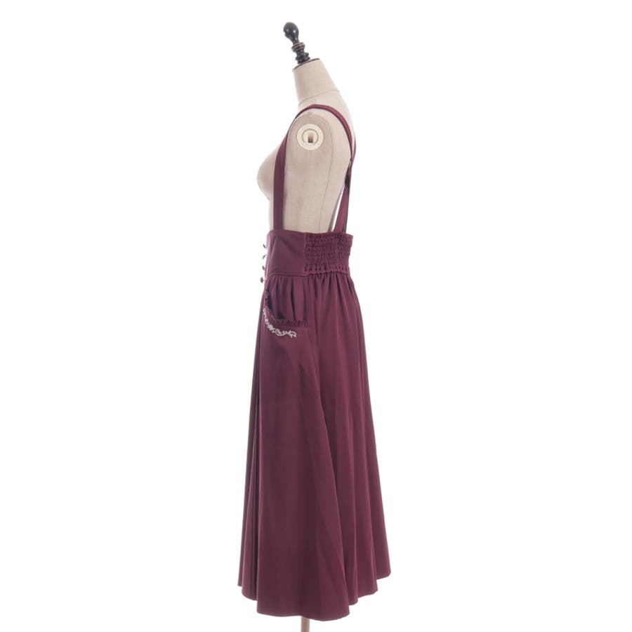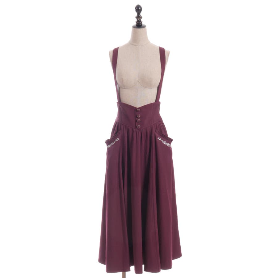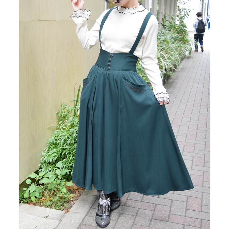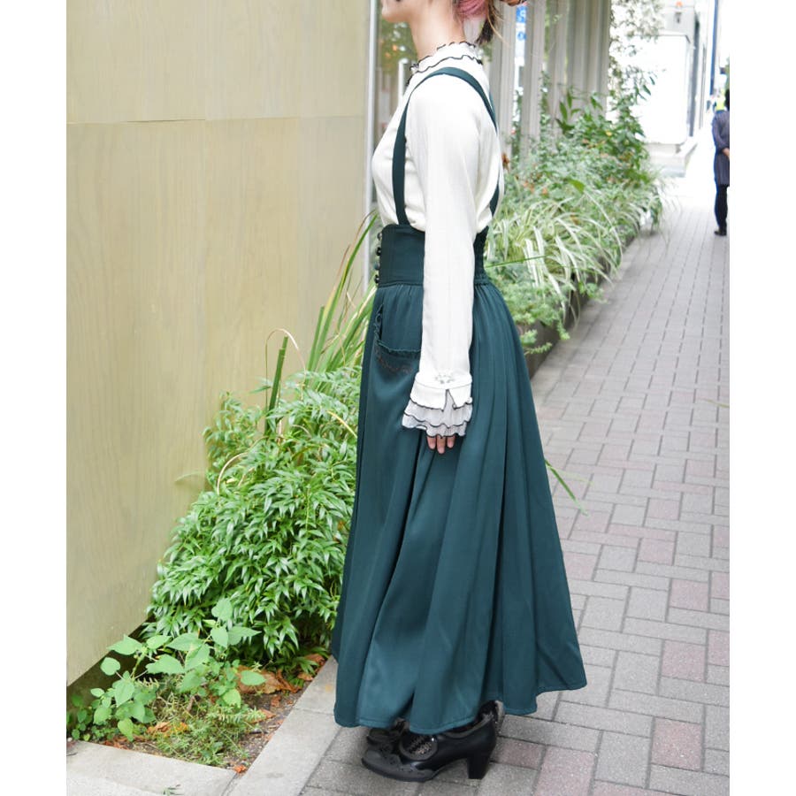 サスペンダーは長さ調整が可能で、好みのバランスで着こなせる仕様。クラシカルな雰囲気をまといながらも、程よい存在感を放つディテールが魅力です。動くたびにゆれるスカートラインが上品な印象を与えます。