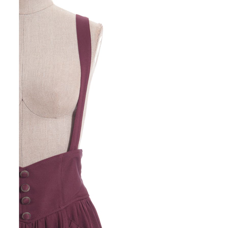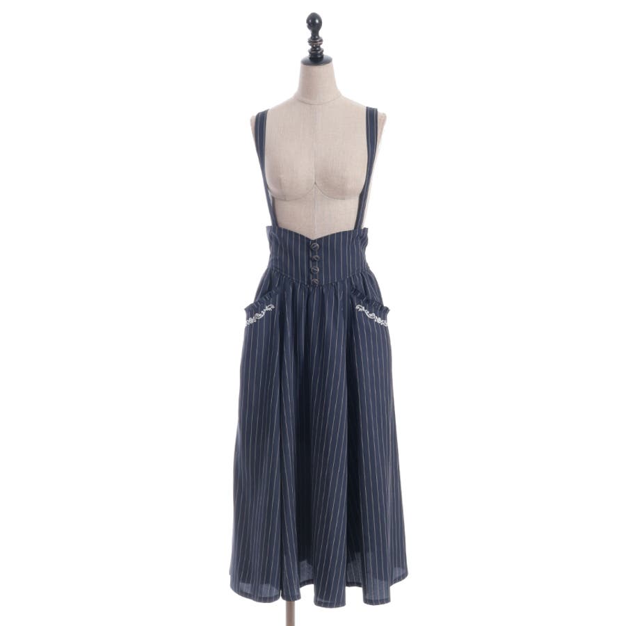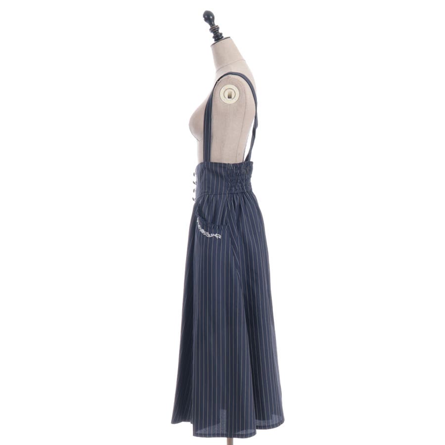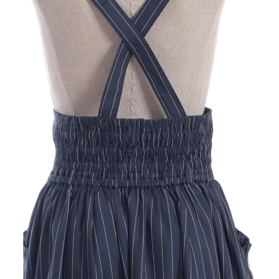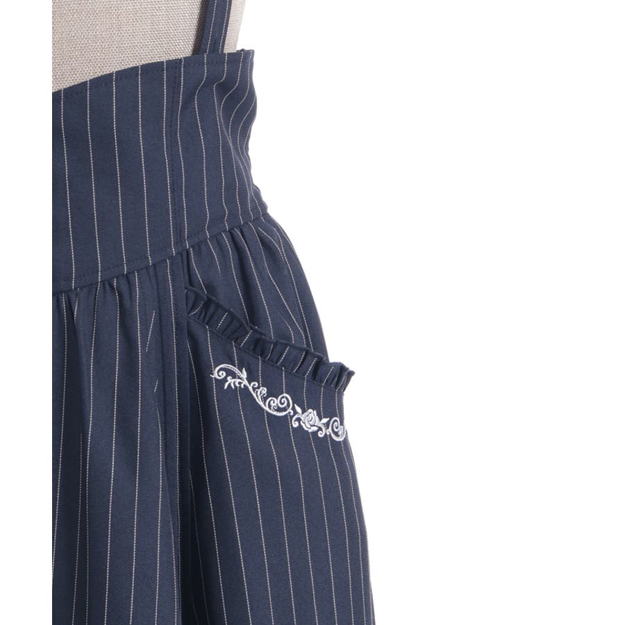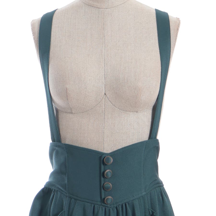 サスペンダーは長さ調整が可能で、好みのバランスで着こなせる仕様。クラシカルな雰囲気をまといながらも、程よい存在感を放つディテールが魅力です。動くたびにゆれるスカートラインが上品な印象を与えます。