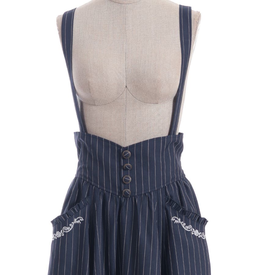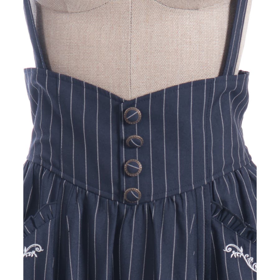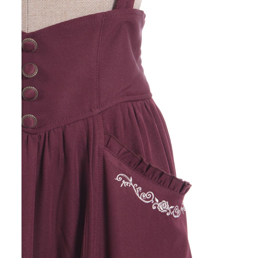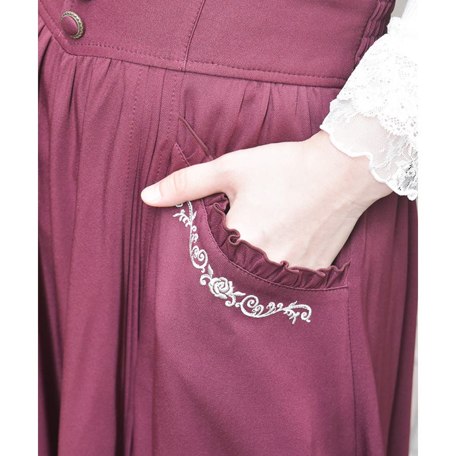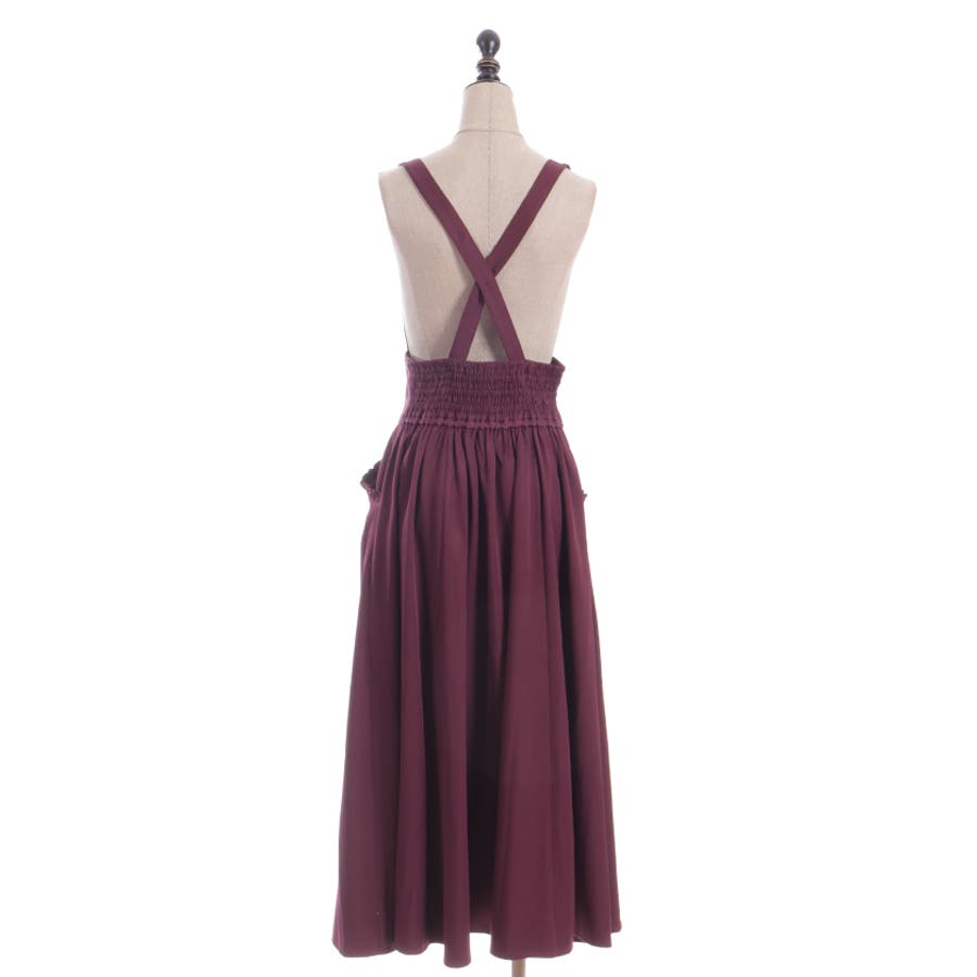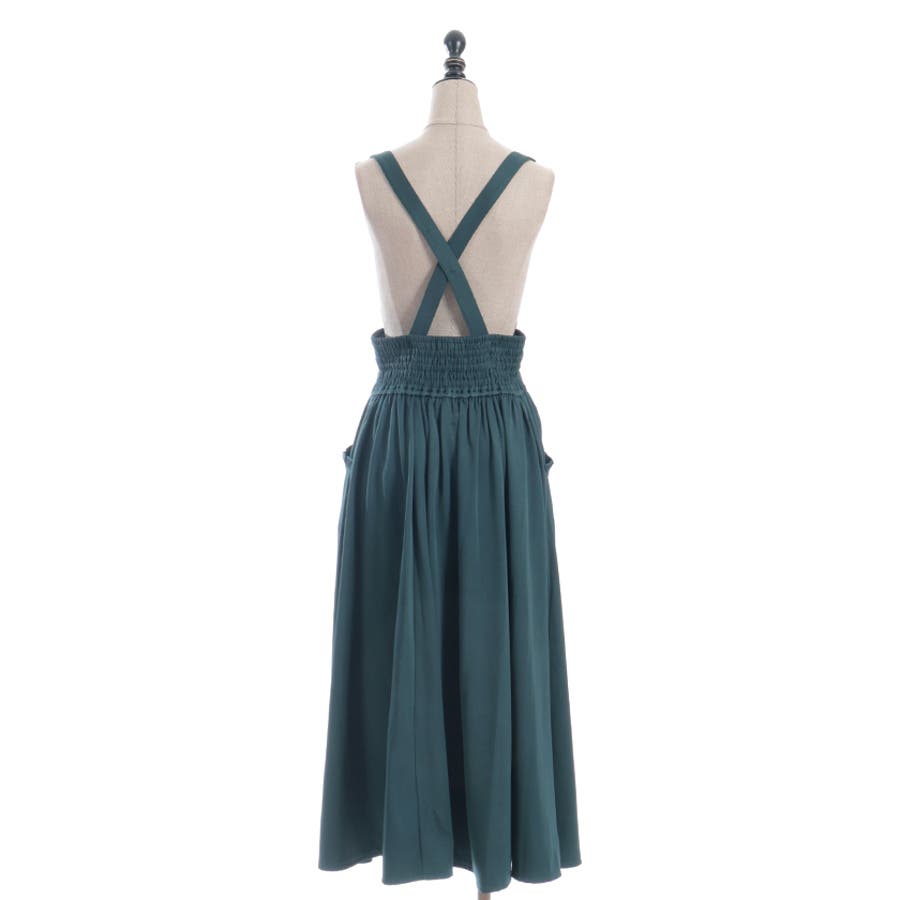 サスペンダーは長さ調整が可能で、好みのバランスで着こなせる仕様。クラシカルな雰囲気をまといながらも、程よい存在感を放つディテールが魅力です。動くたびにゆれるスカートラインが上品な印象を与えます。
