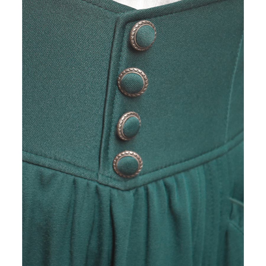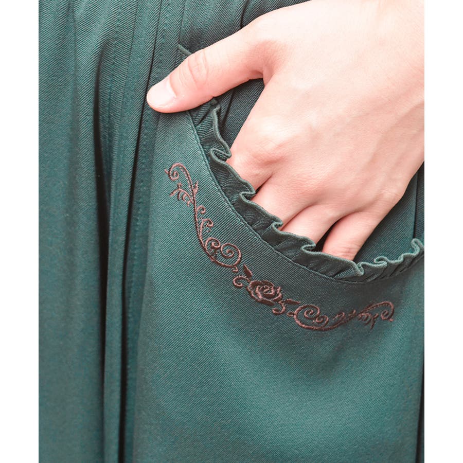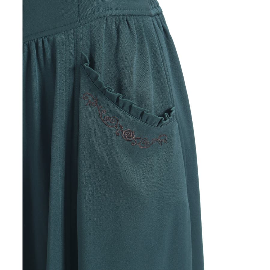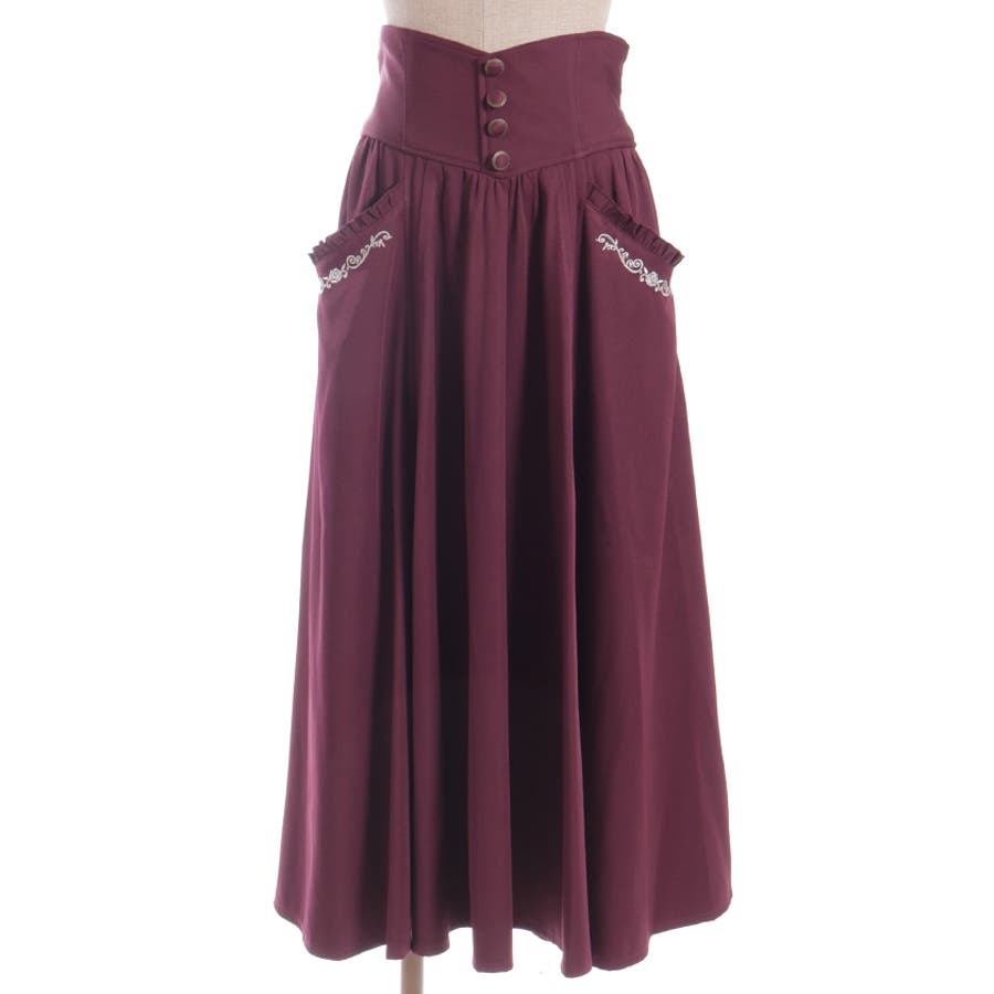 ウエストのメタルボタンと高めの位置で切り替えられたシルエットが印象的なハイウエストスカート。すっきりとしたラインの中に、可憐なローズ刺繍がほどこされたポケットがさりげないアクセントになっています。