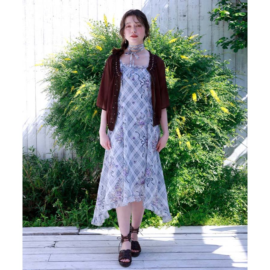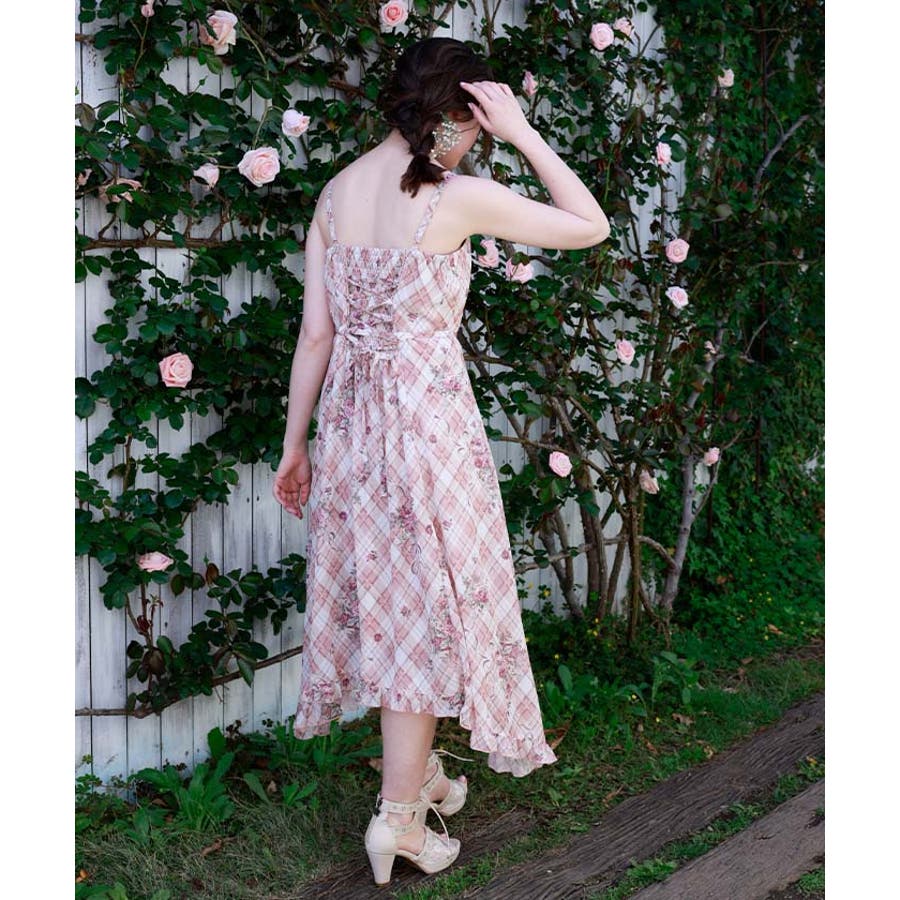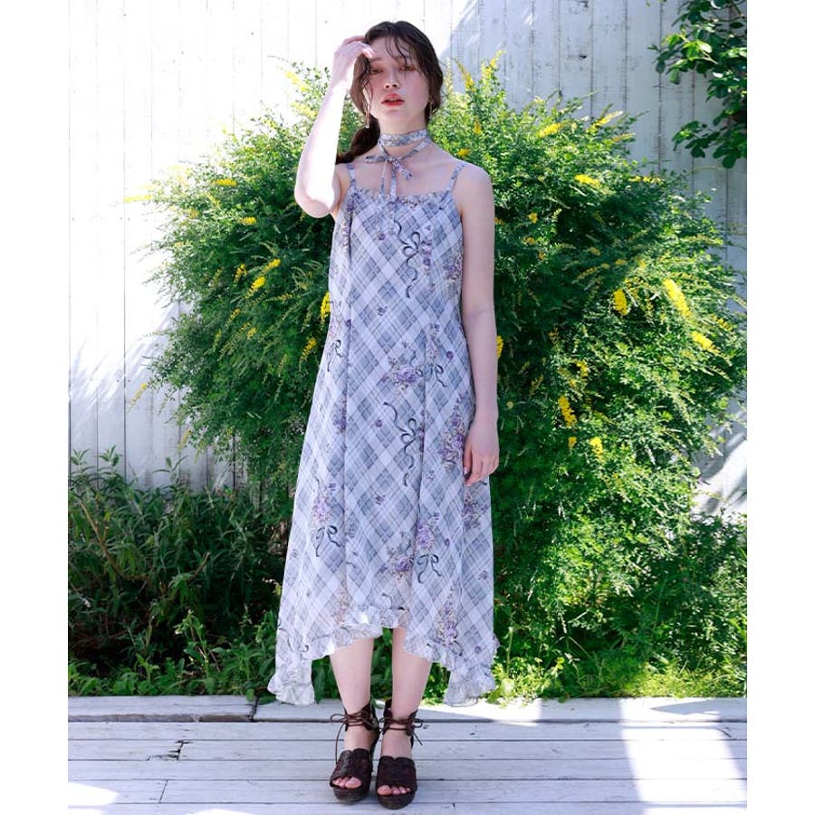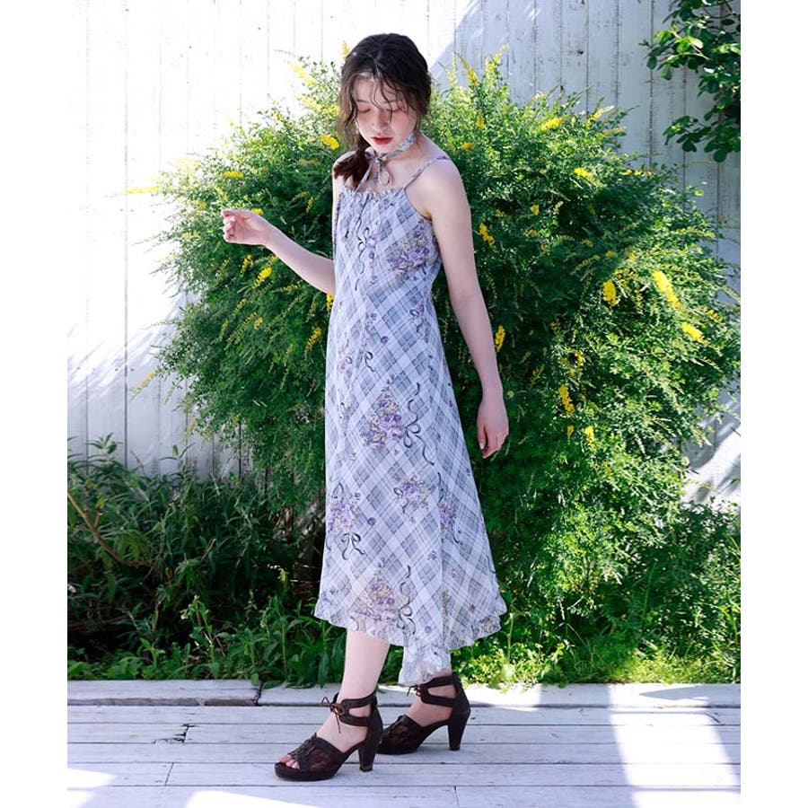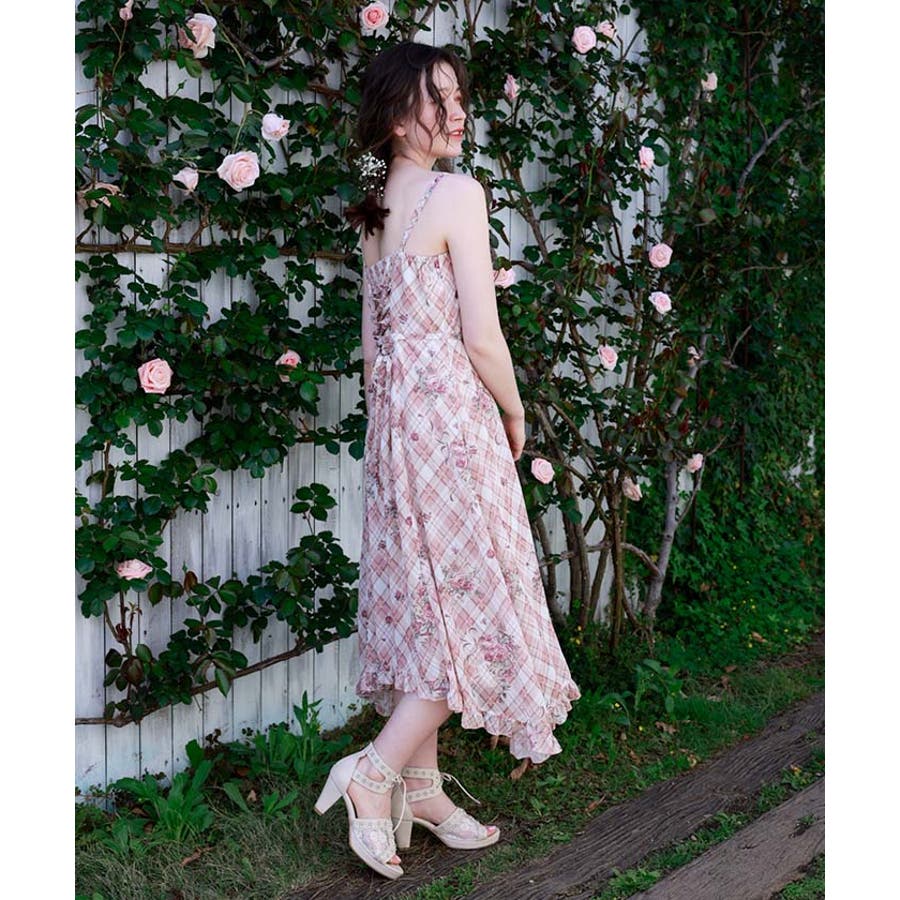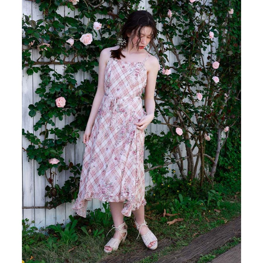さらさらとしたシフォン素材を使用したキャミワンピースは、バイヤスチェックにローズブーケを重ねたオリジナル柄が目を引く、フェミニンな1着です。