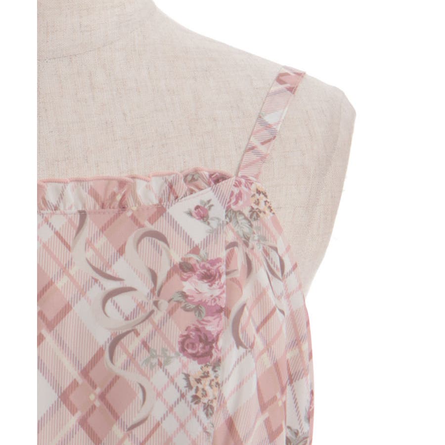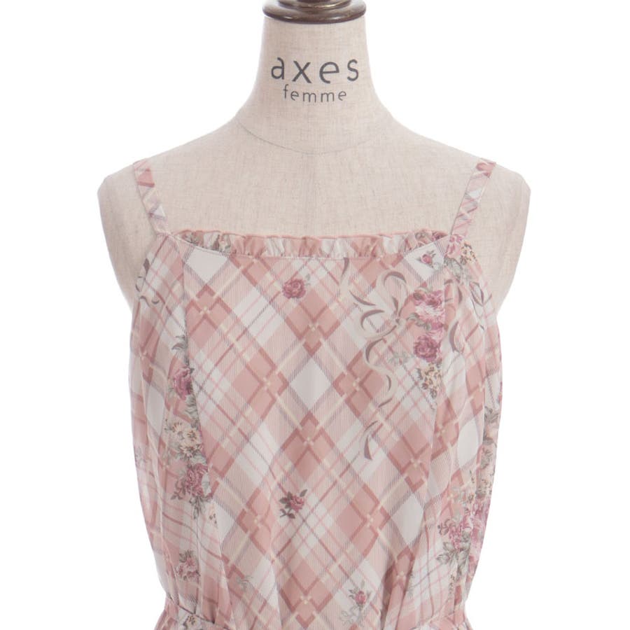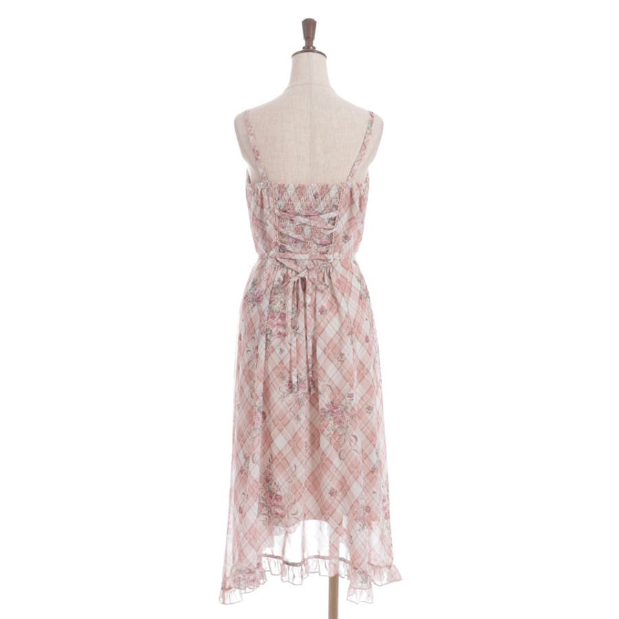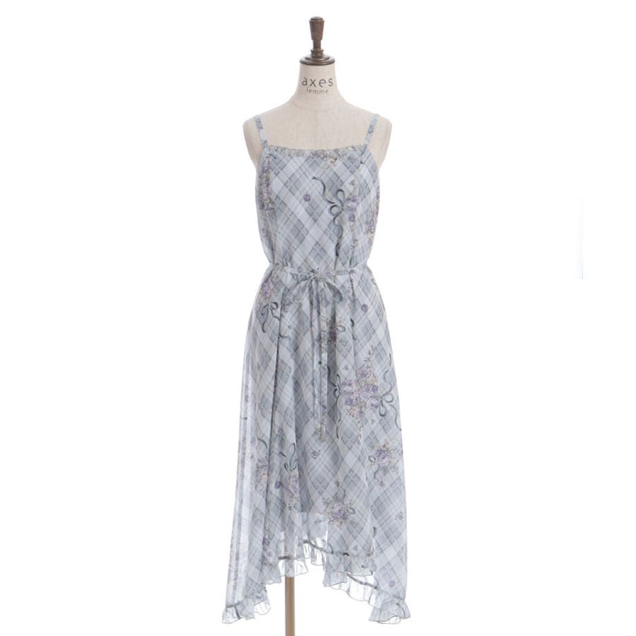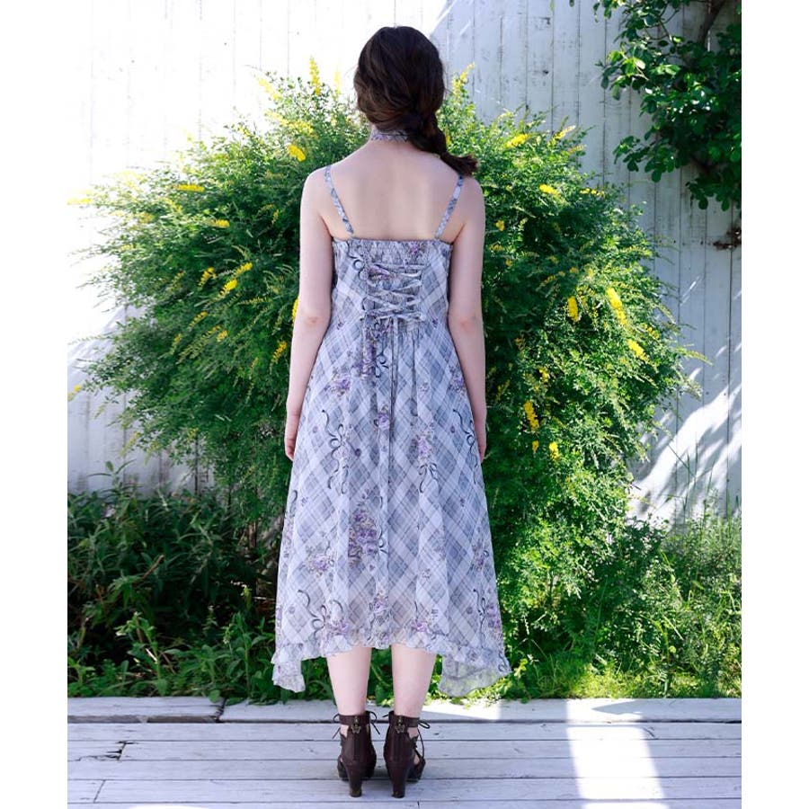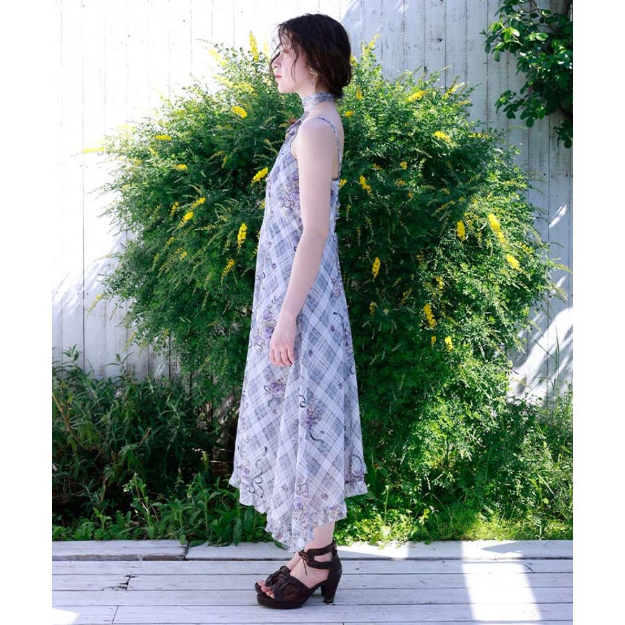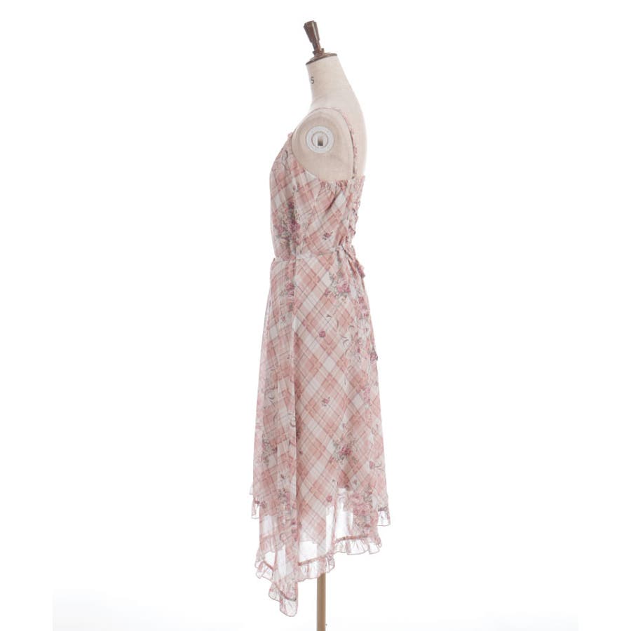さらさらとしたシフォン素材を使用したキャミワンピースは、バイヤスチェックにローズブーケを重ねたオリジナル柄が目を引く、フェミニンな1着です。