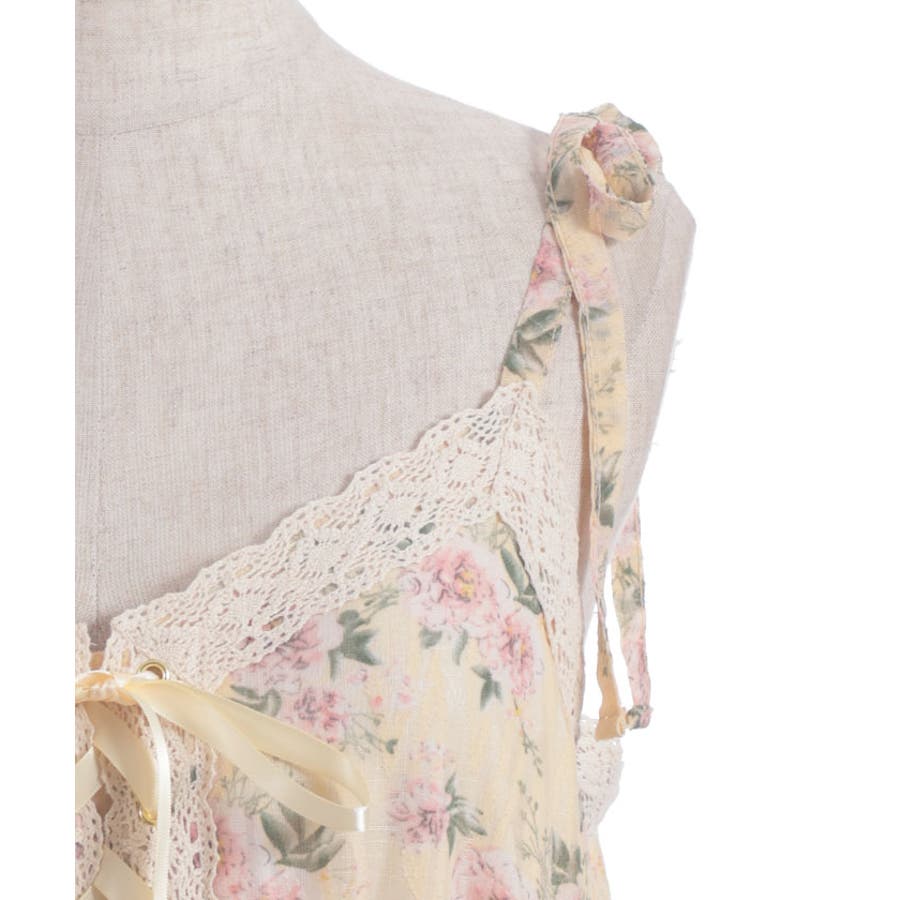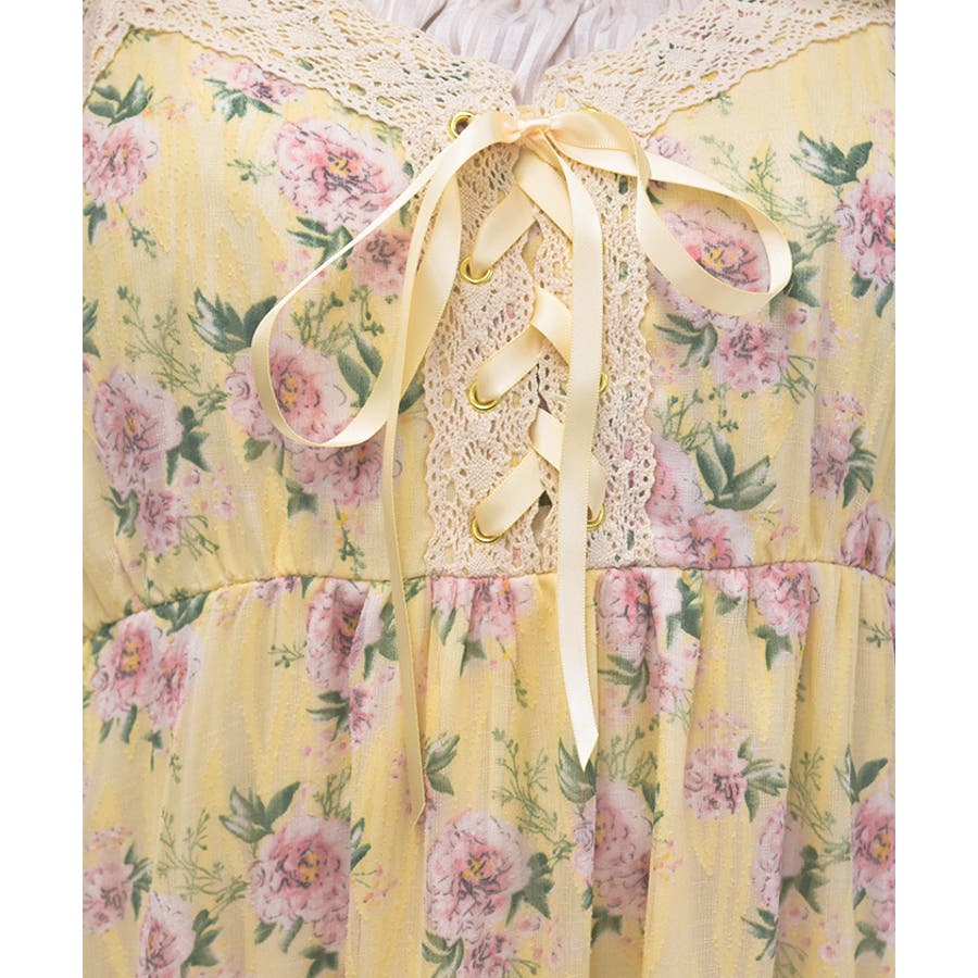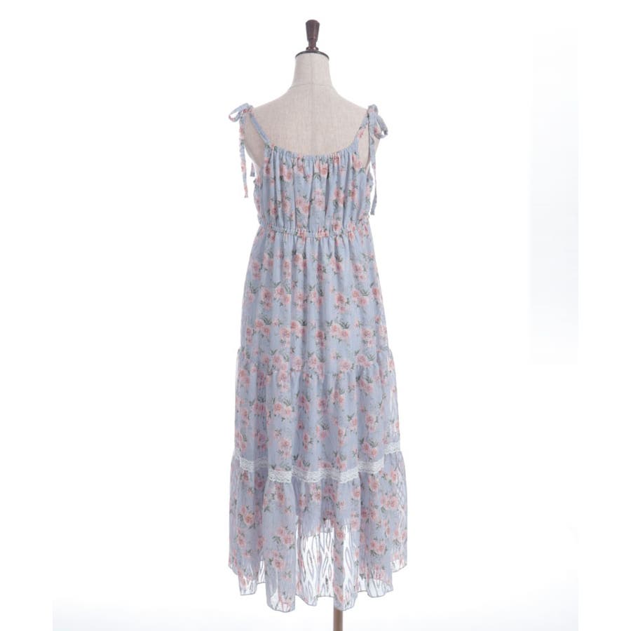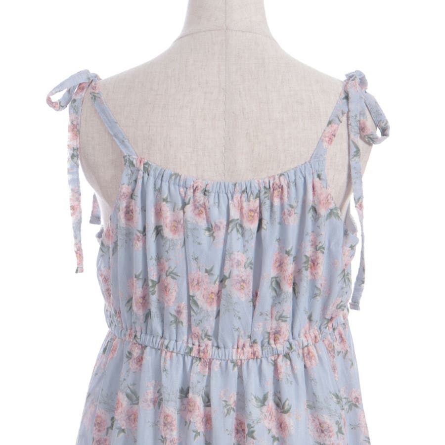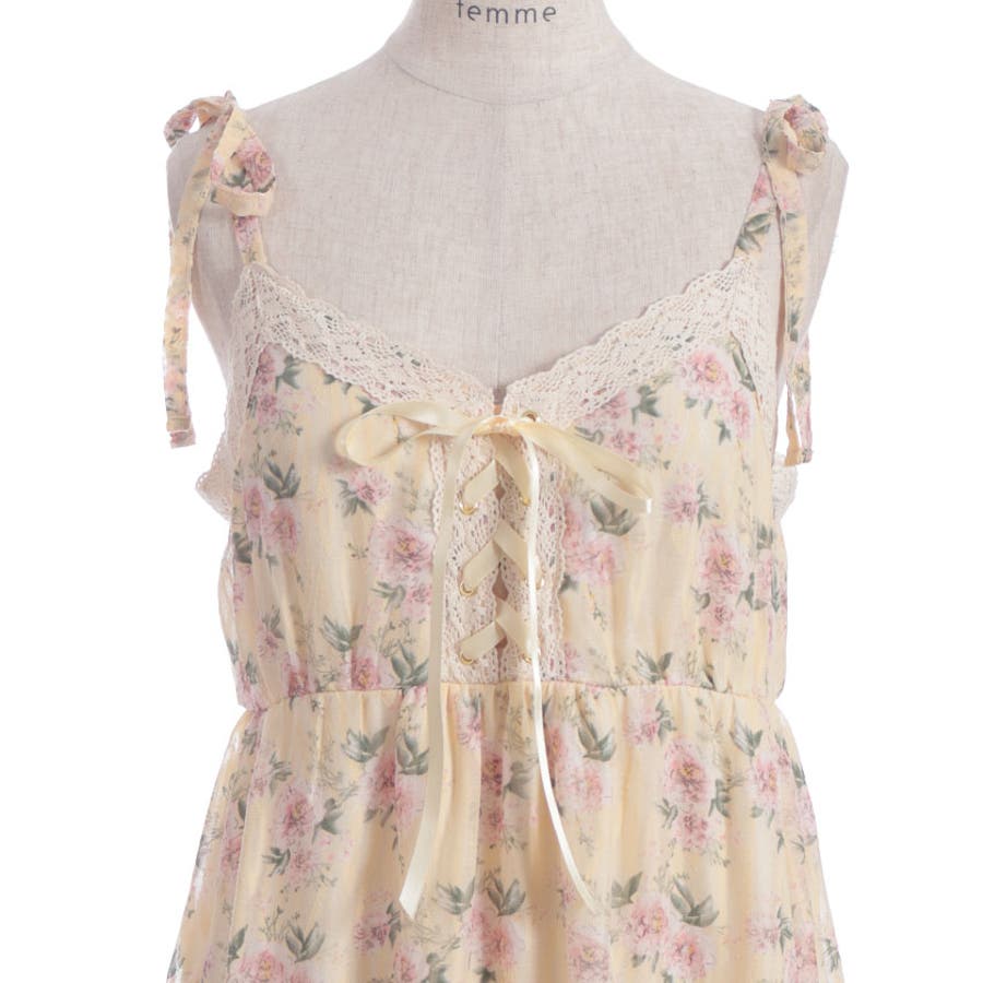 肩紐と胸元に施されたリボンがガーリーなアクセントに。ティアード切り替えとレースの装飾が、動くたびふわっと揺れる表情を演出し、着映え力のある仕上がりになっています。ウエストはゴム仕様で快適な着心地です。