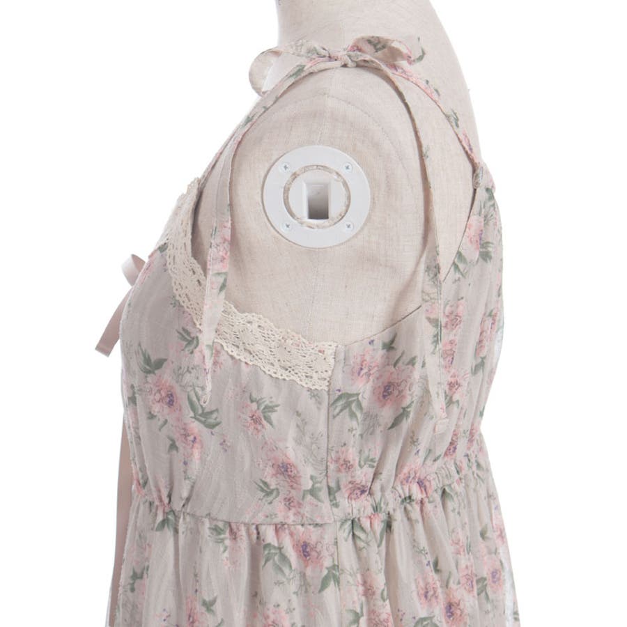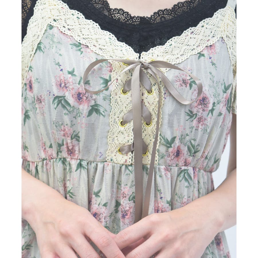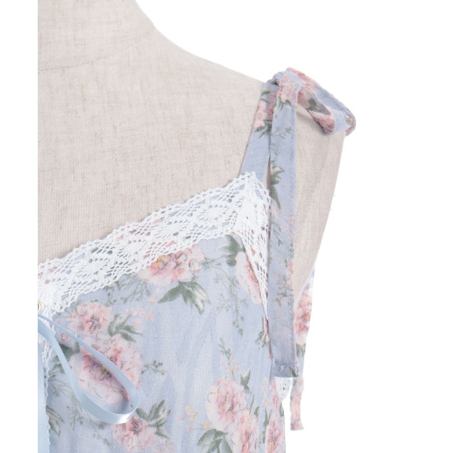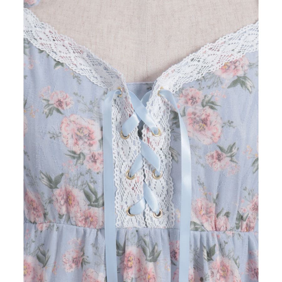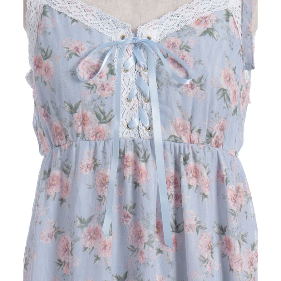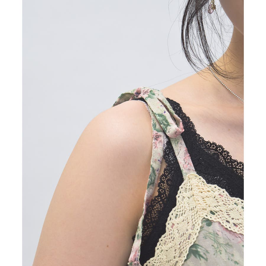 肩紐と胸元に施されたリボンがガーリーなアクセントに。ティアード切り替えとレースの装飾が、動くたびふわっと揺れる表情を演出し、着映え力のある仕上がりになっています。ウエストはゴム仕様で快適な着心地です。