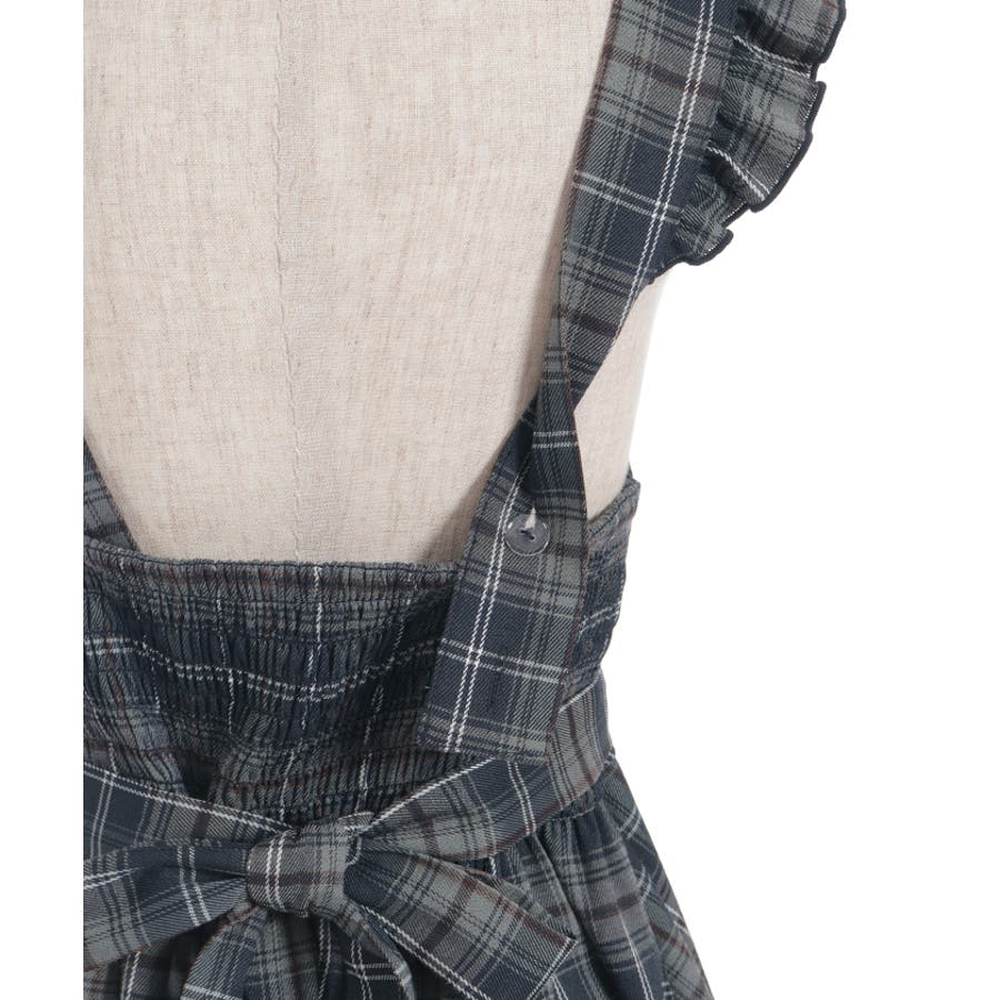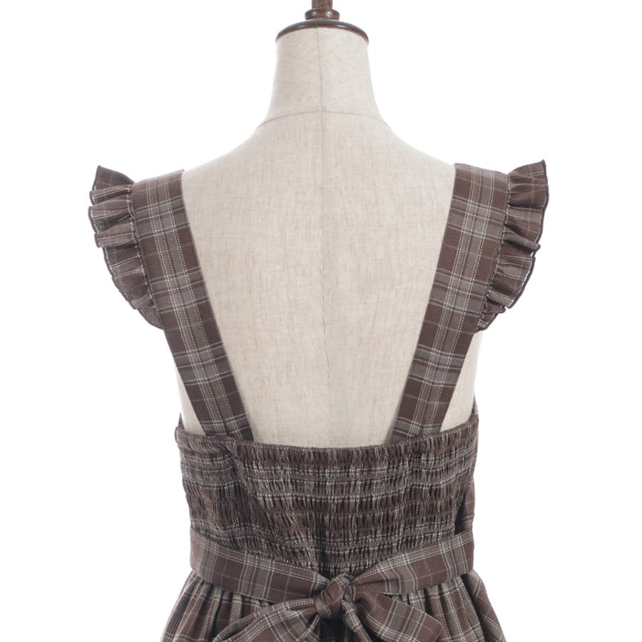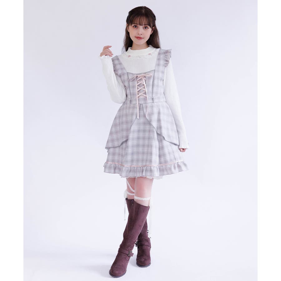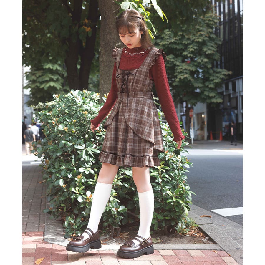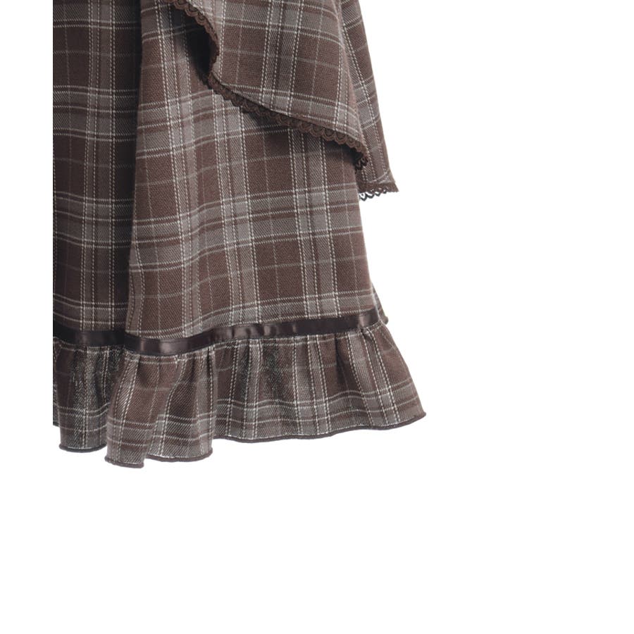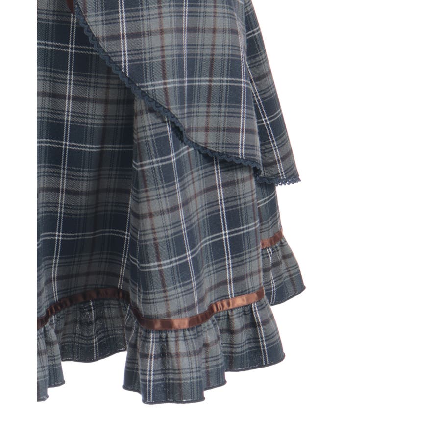 裾のフリルやチェック柄の切り替えが立体感を演出し、レトロガーリーな印象に仕上げています。