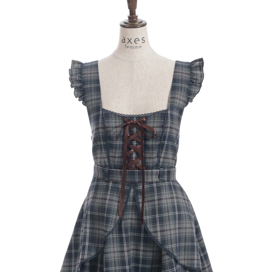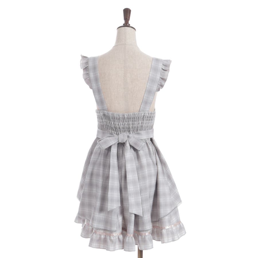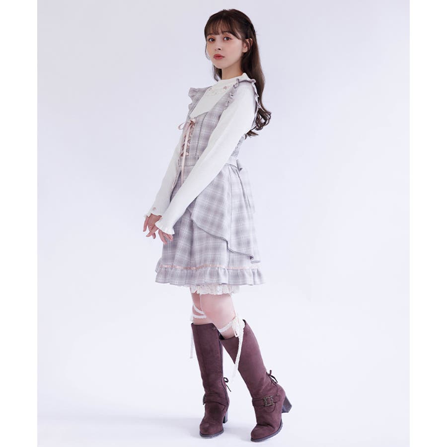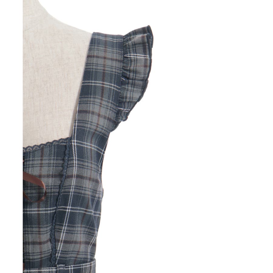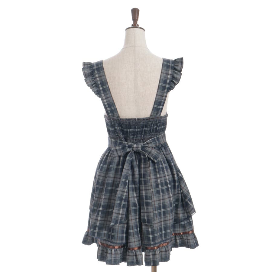 裾のフリルやチェック柄の切り替えが立体感を演出し、レトロガーリーな印象に仕上げています。