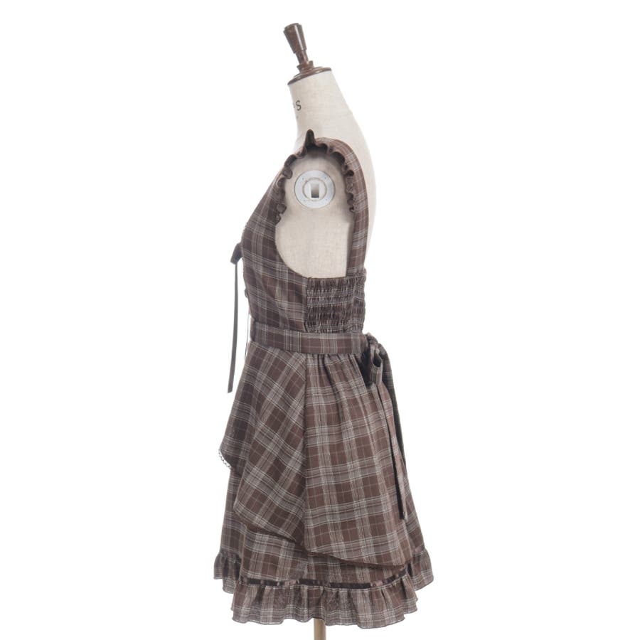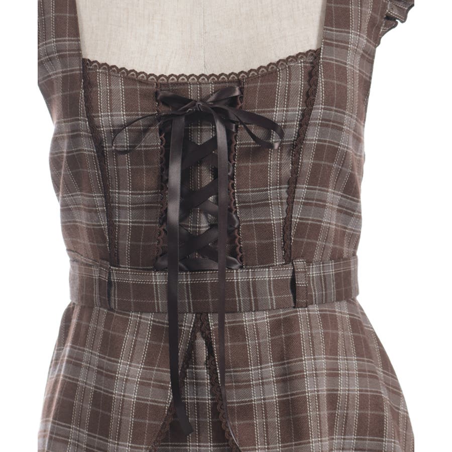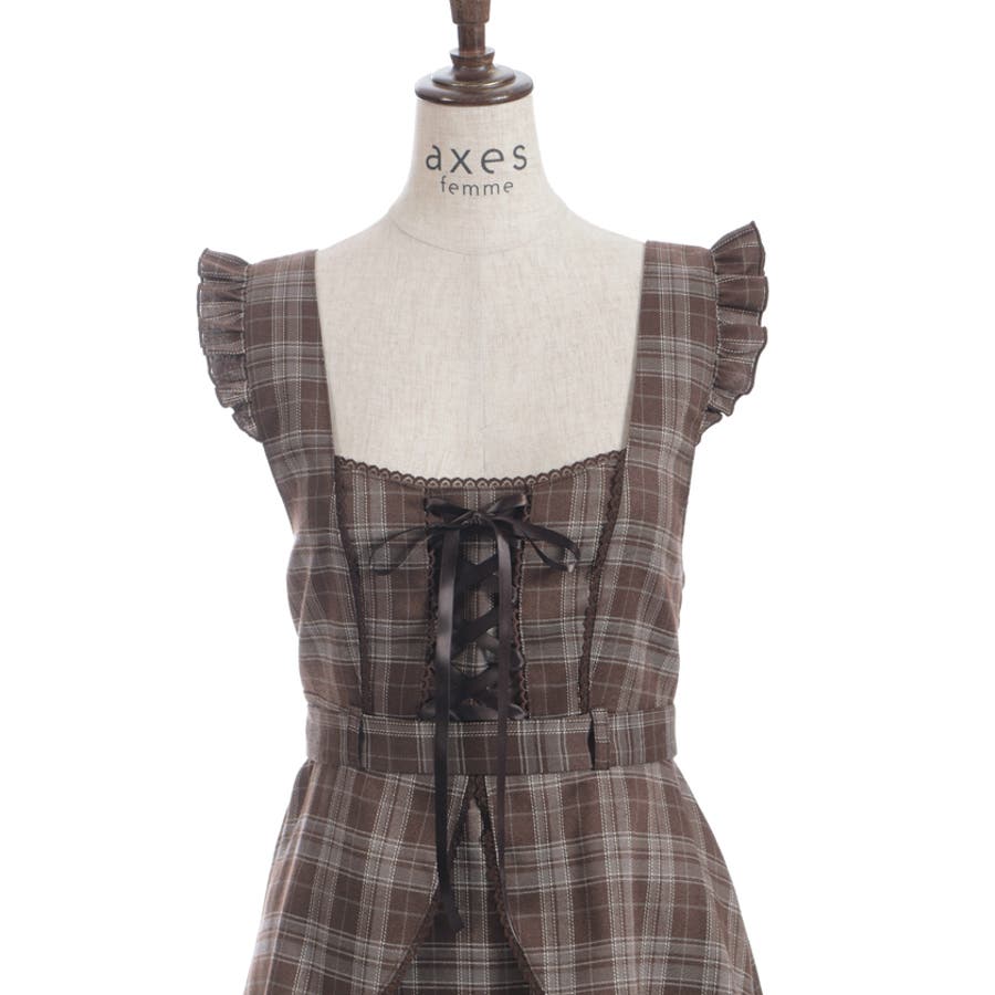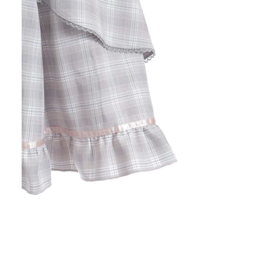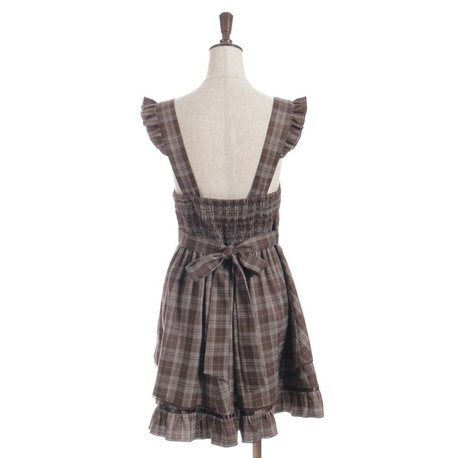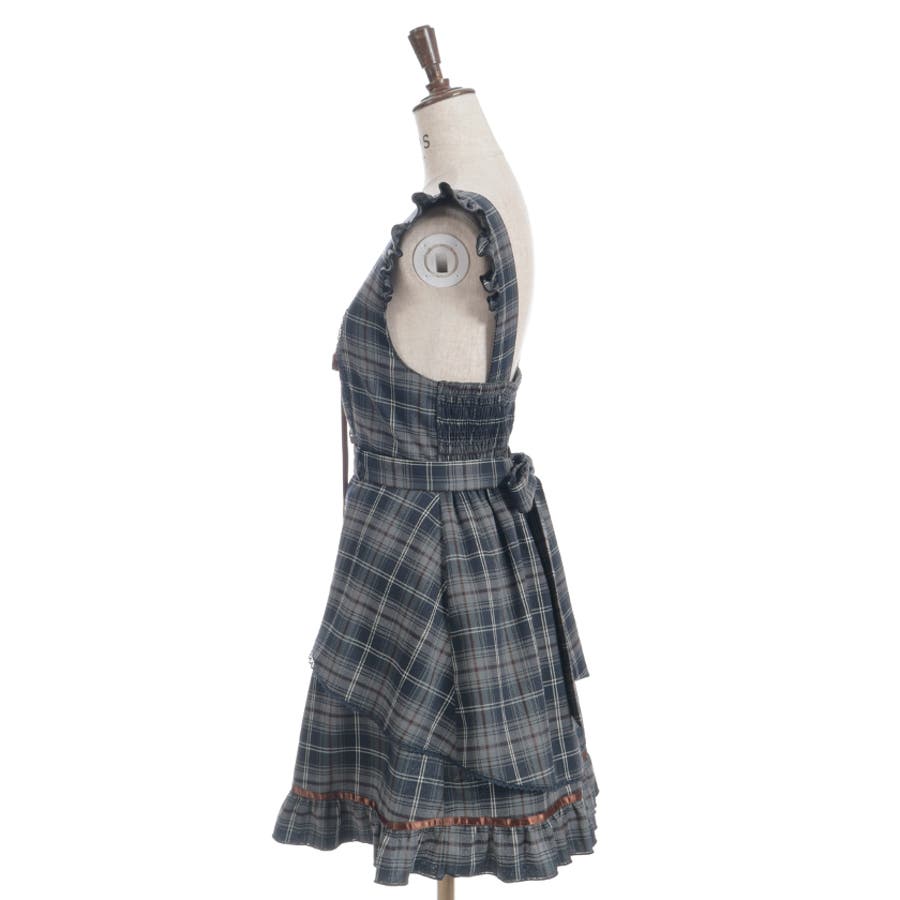 裾のフリルやチェック柄の切り替えが立体感を演出し、レトロガーリーな印象に仕上げています。