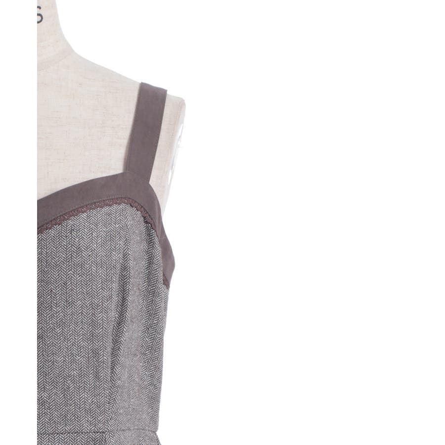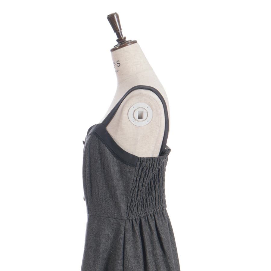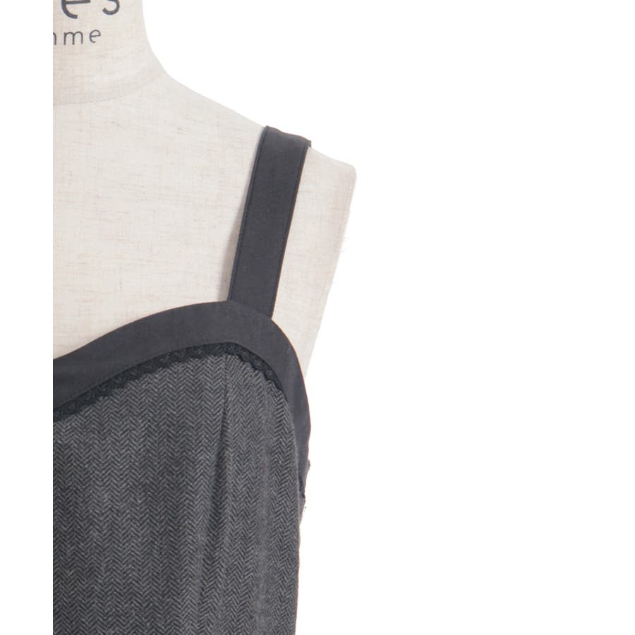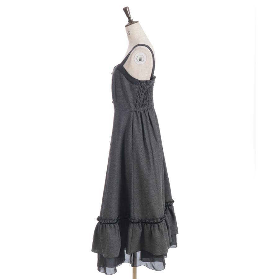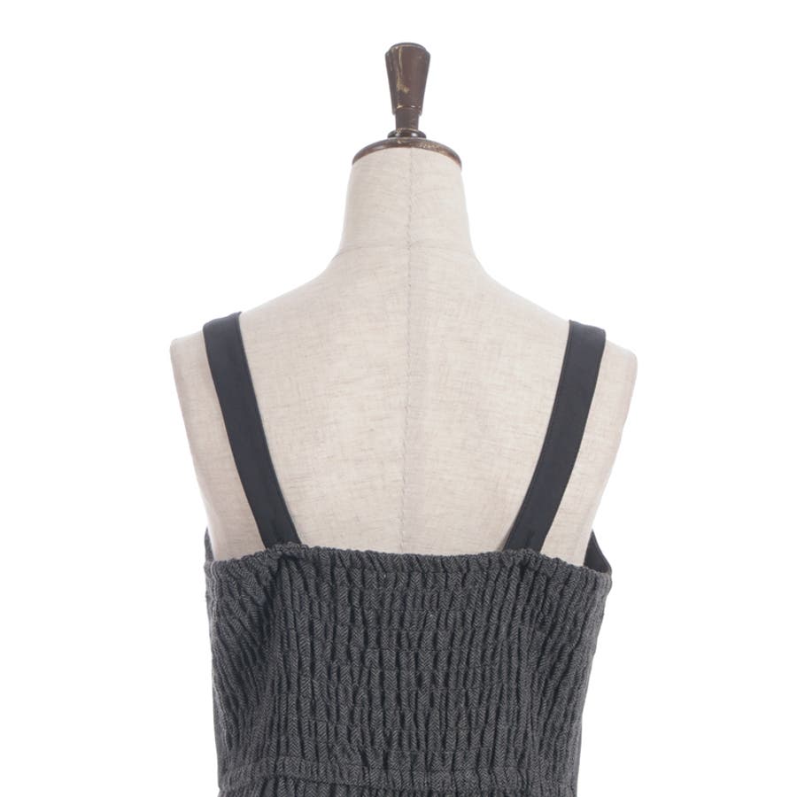 胸元のボタンや切替ライン、裾のフリルがアクセントになり、シルエットに奥行きをプラス。肩紐は太めで安定感があり、レイヤードしてもバランスが取りやすいデザインです。