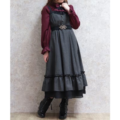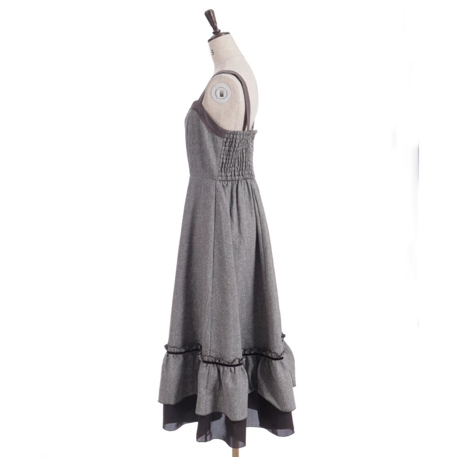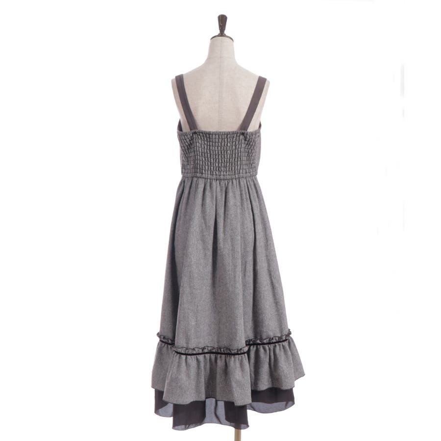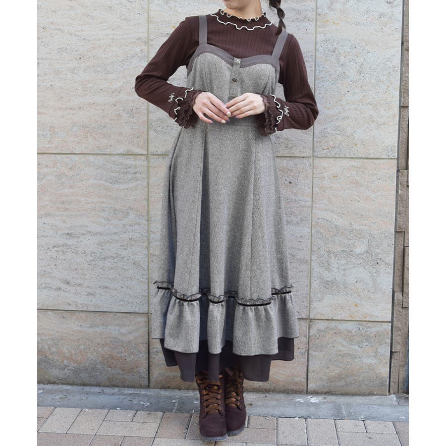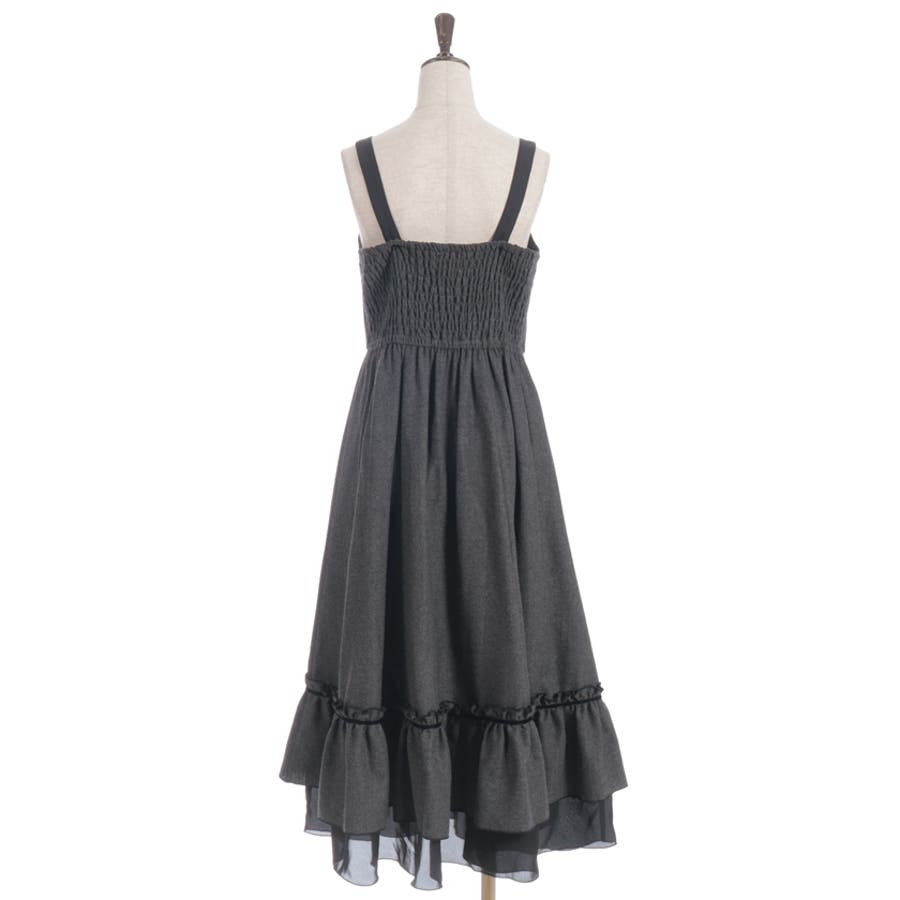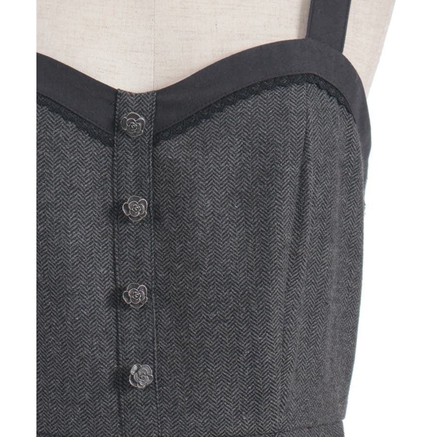 胸元のボタンや切替ライン、裾のフリルがアクセントになり、シルエットに奥行きをプラス。肩紐は太めで安定感があり、レイヤードしてもバランスが取りやすいデザインです。
