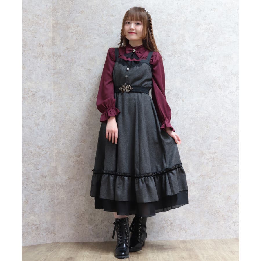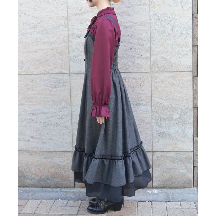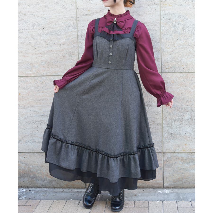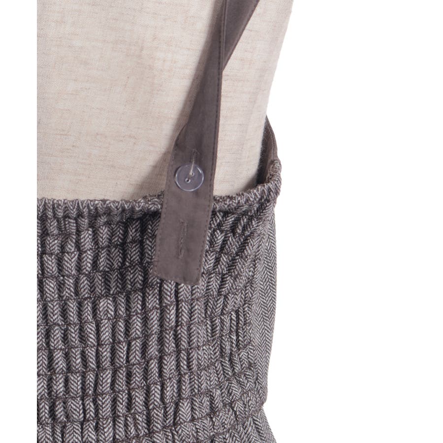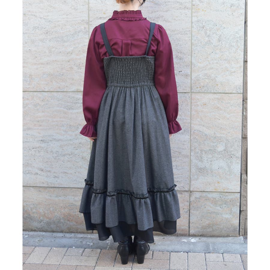 胸元のボタンや切替ライン、裾のフリルがアクセントになり、シルエットに奥行きをプラス。肩紐は太めで安定感があり、レイヤードしてもバランスが取りやすいデザインです。