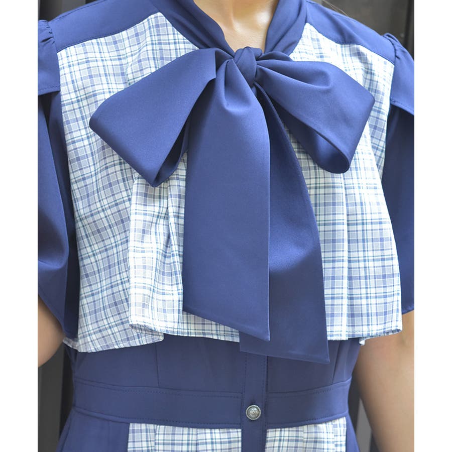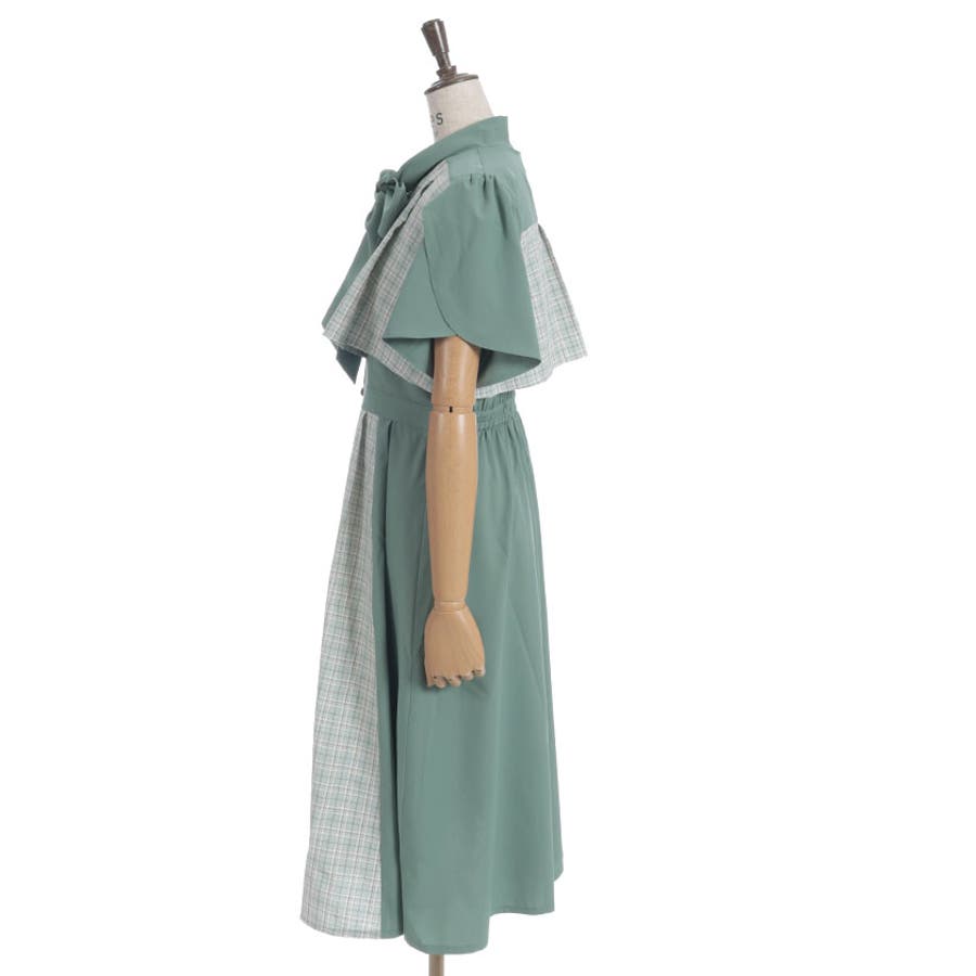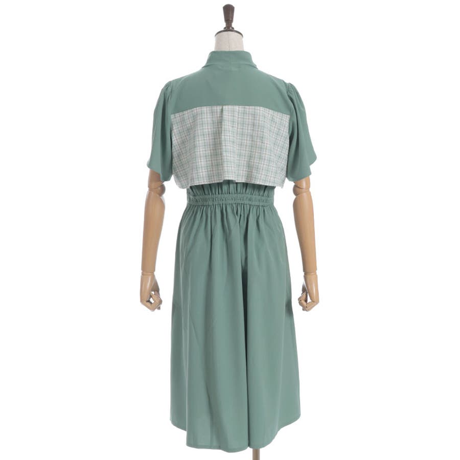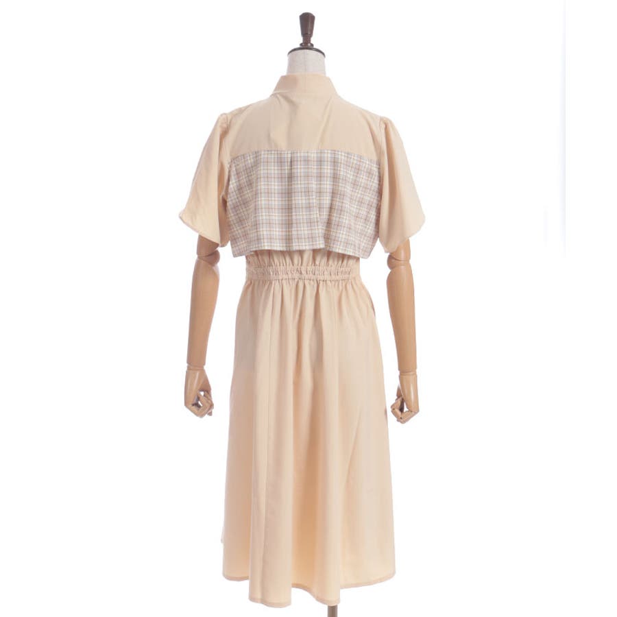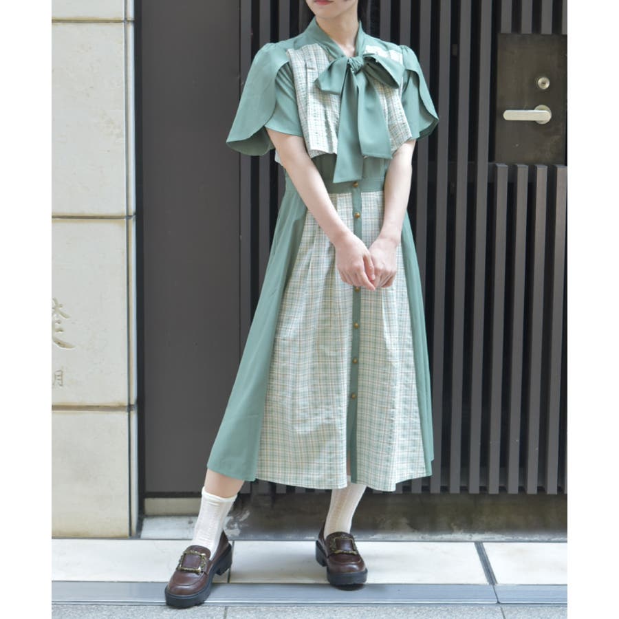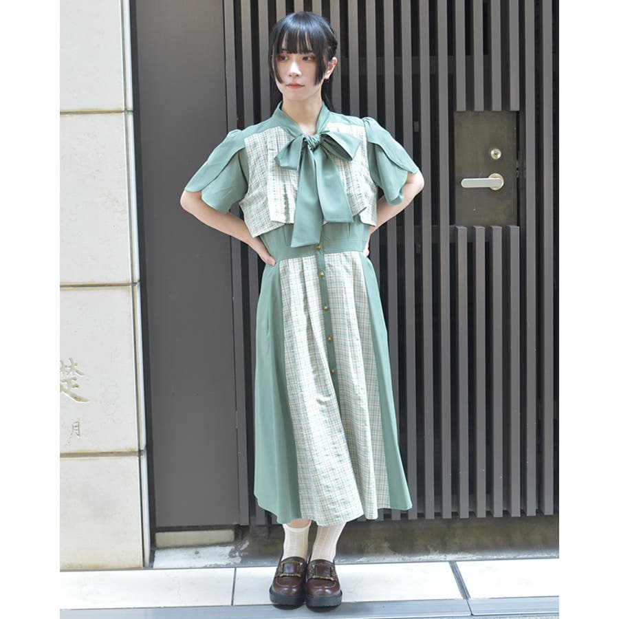 チェック柄と無地を組み合わせたパッチワークデザインが目をひくワンピース。