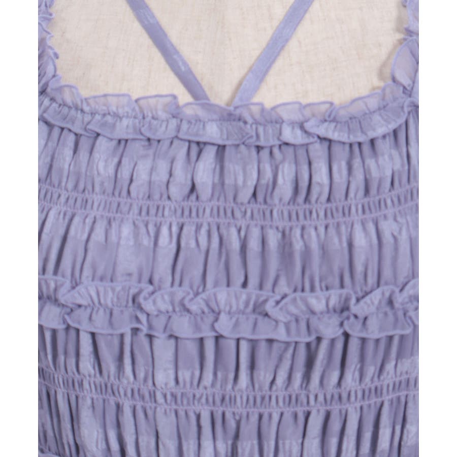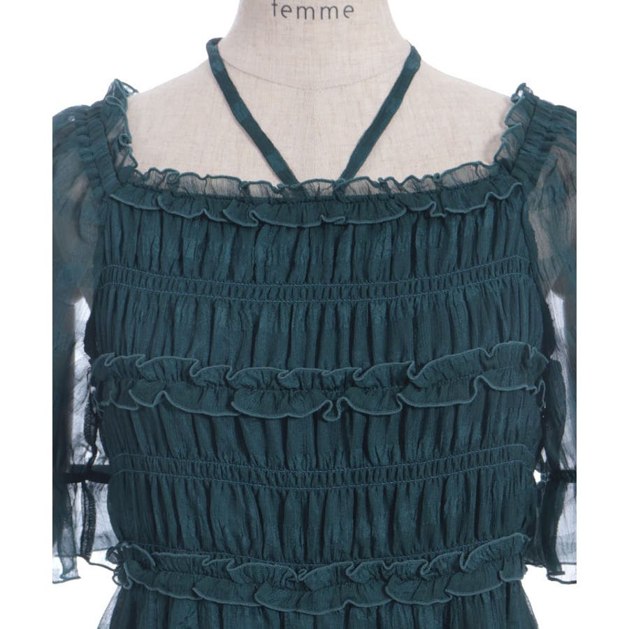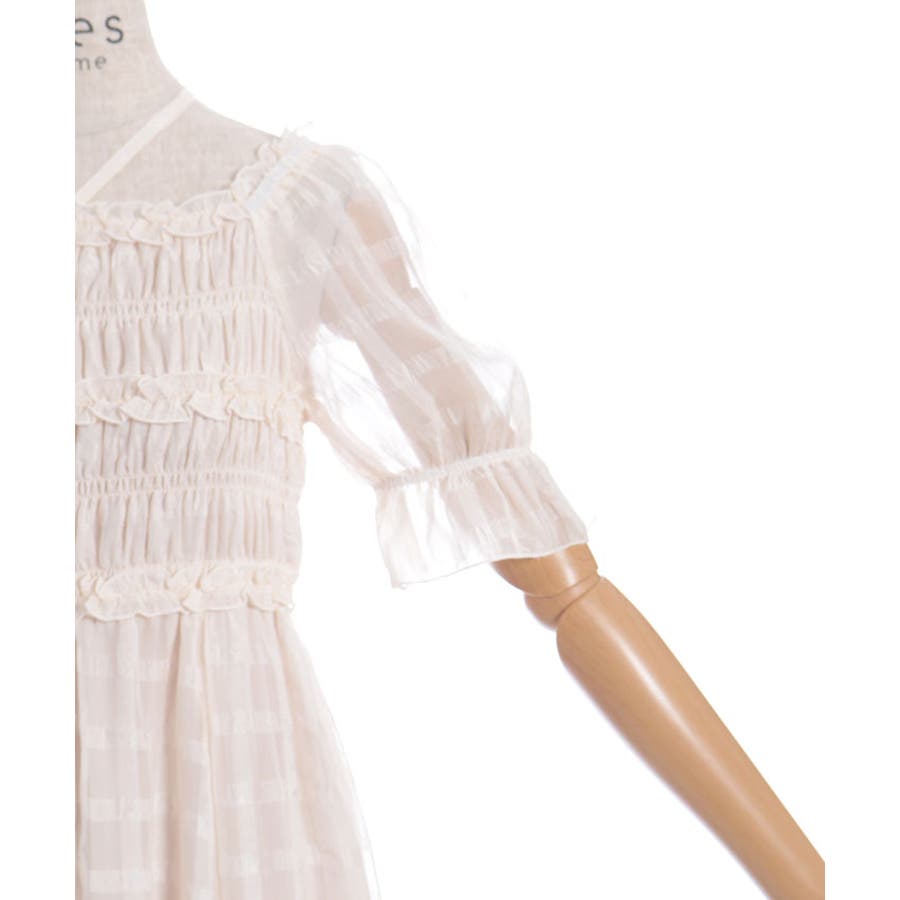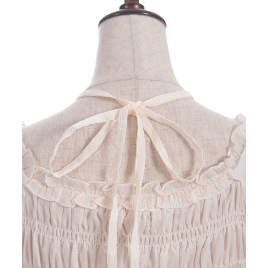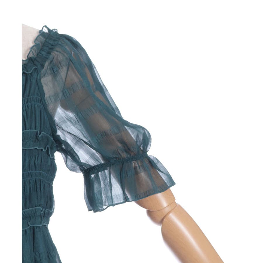 胸元のシャーリングデザインや裾のフリルなどフェミニンポイントをプラス。