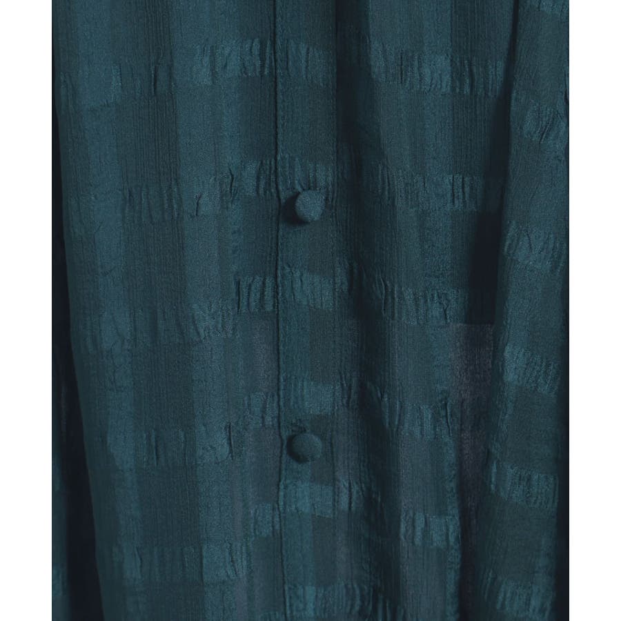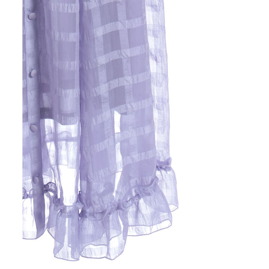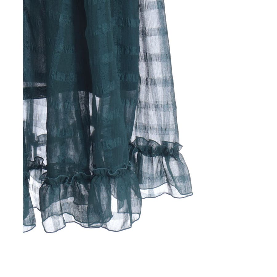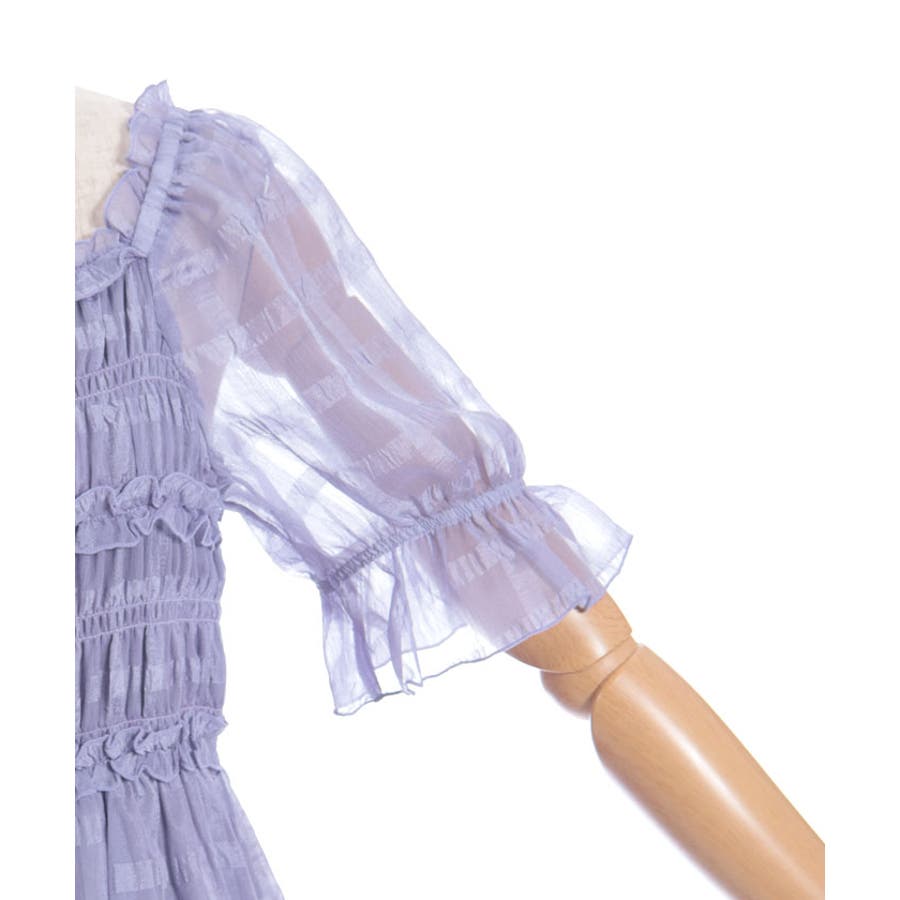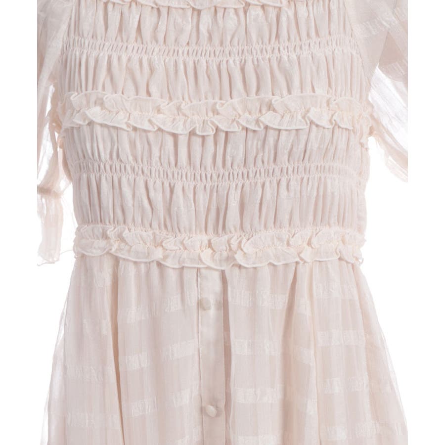 胸元のシャーリングデザインや裾のフリルなどフェミニンポイントをプラス。