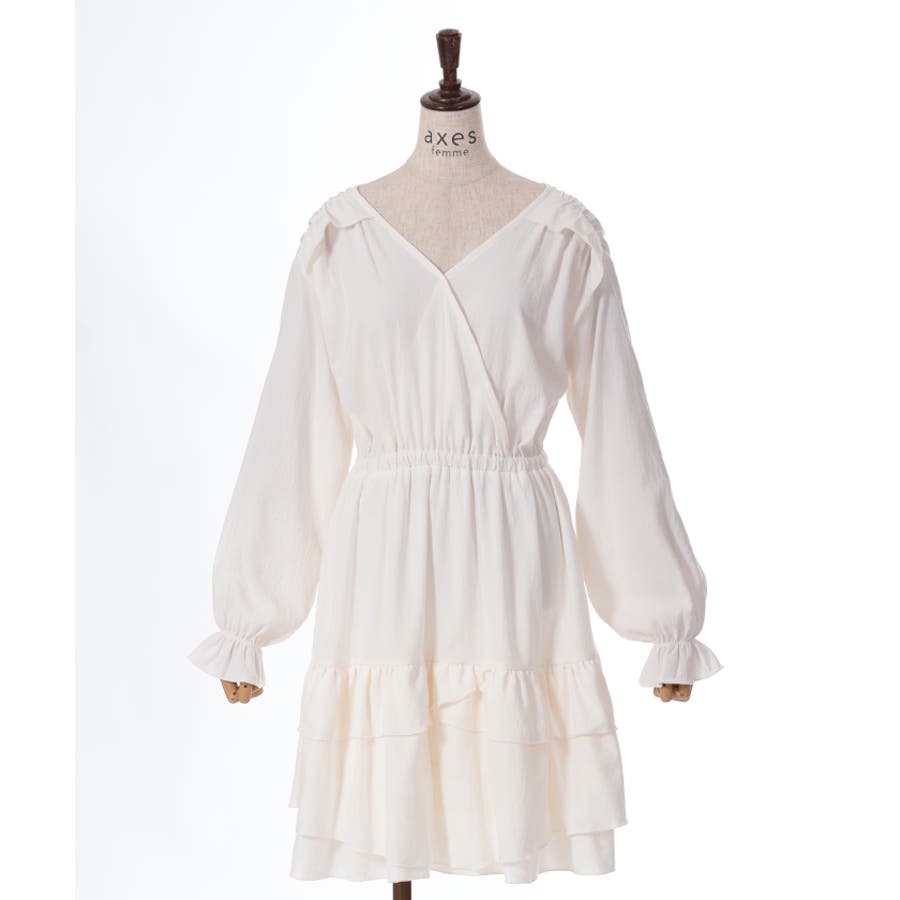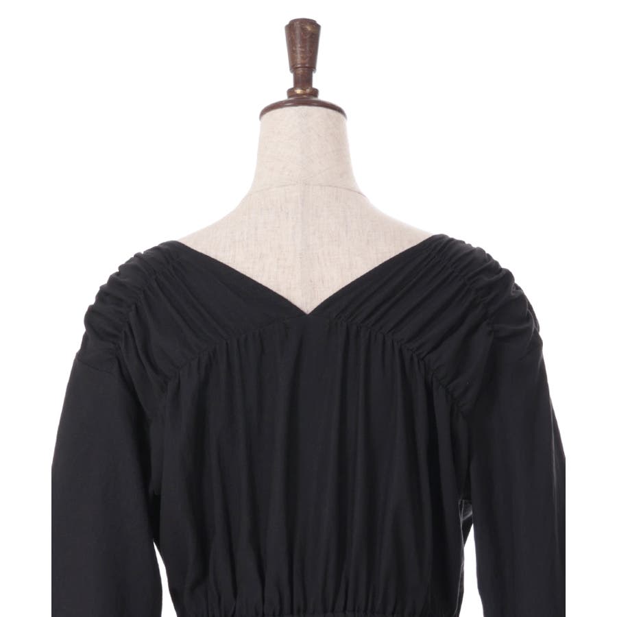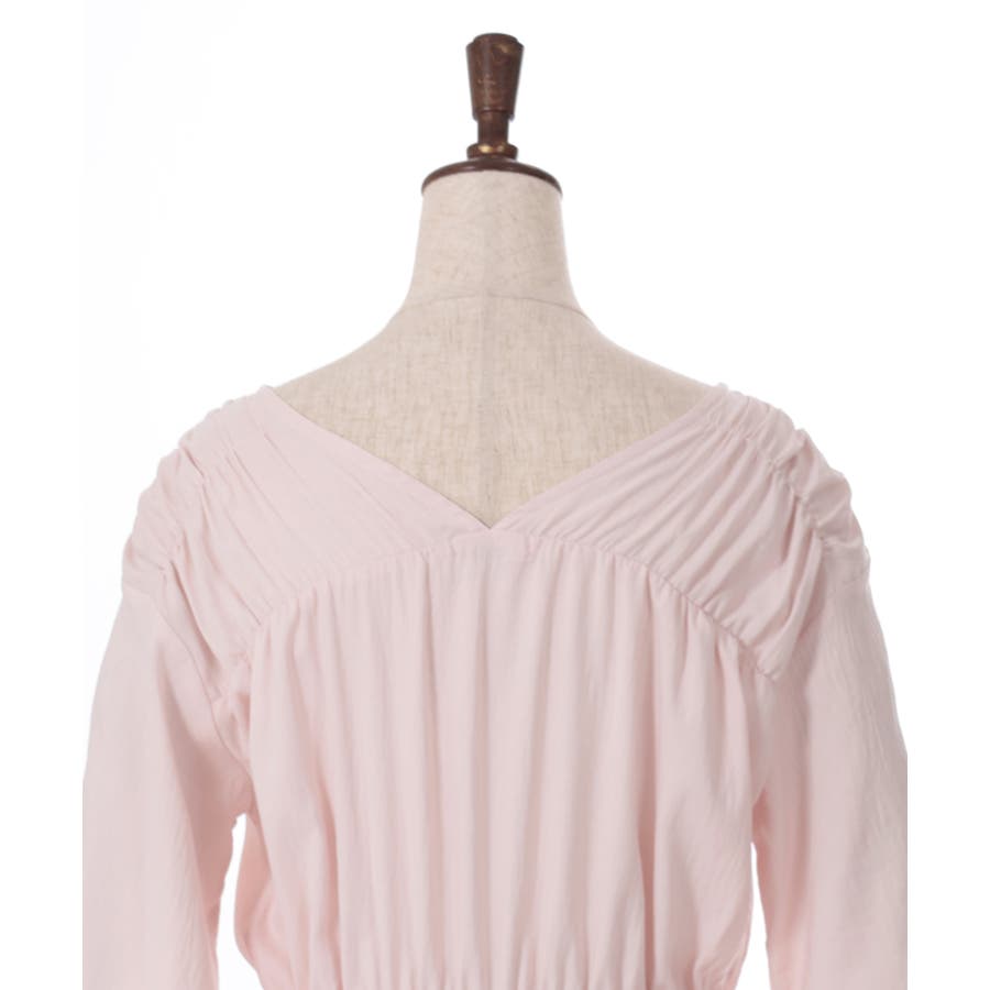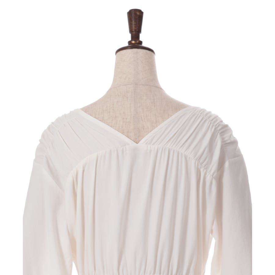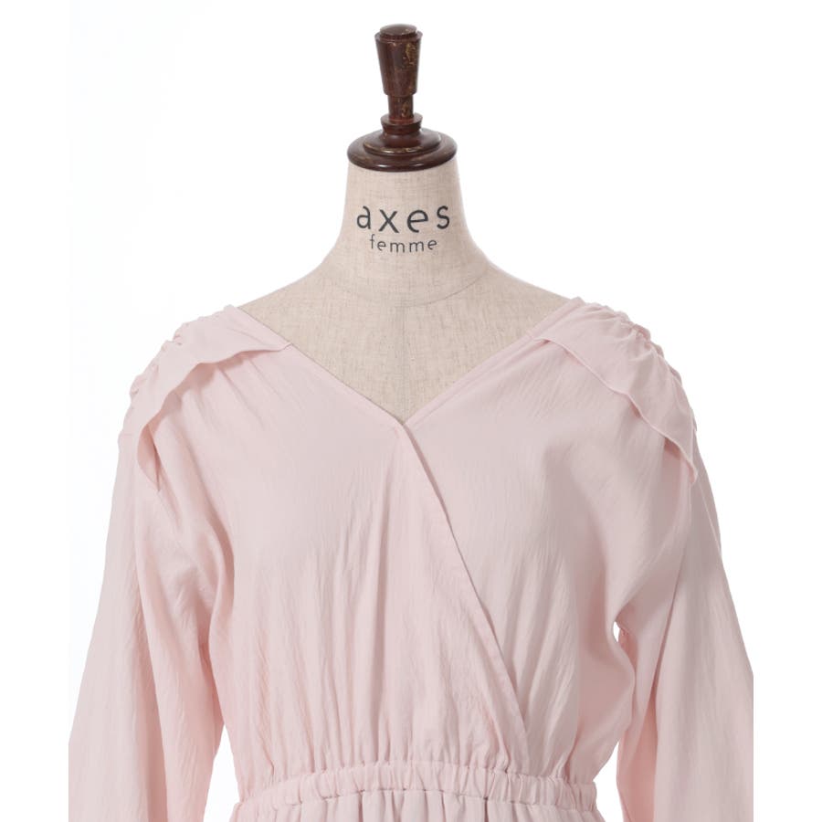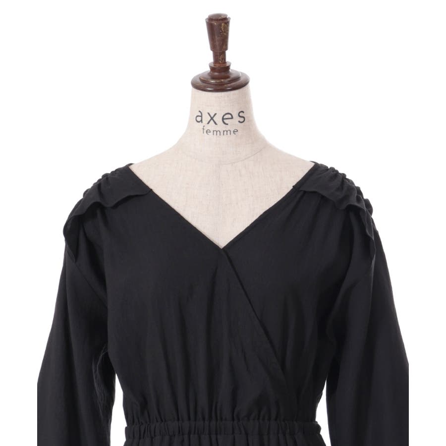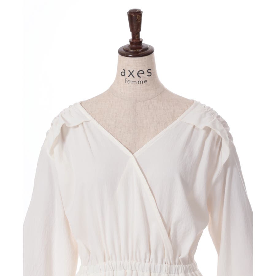 浅めのVネックのためクロスリボンのインナーやビジューが付いたインナーをのぞかせたスタイリングも◎。