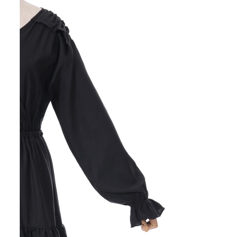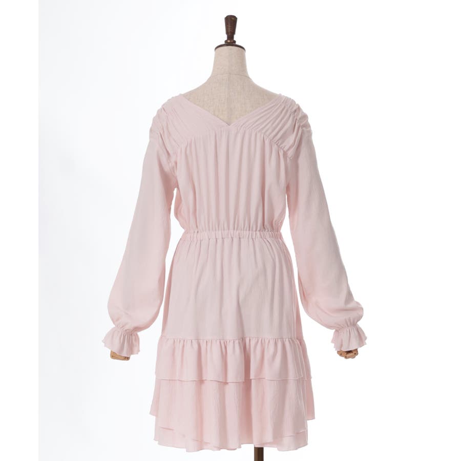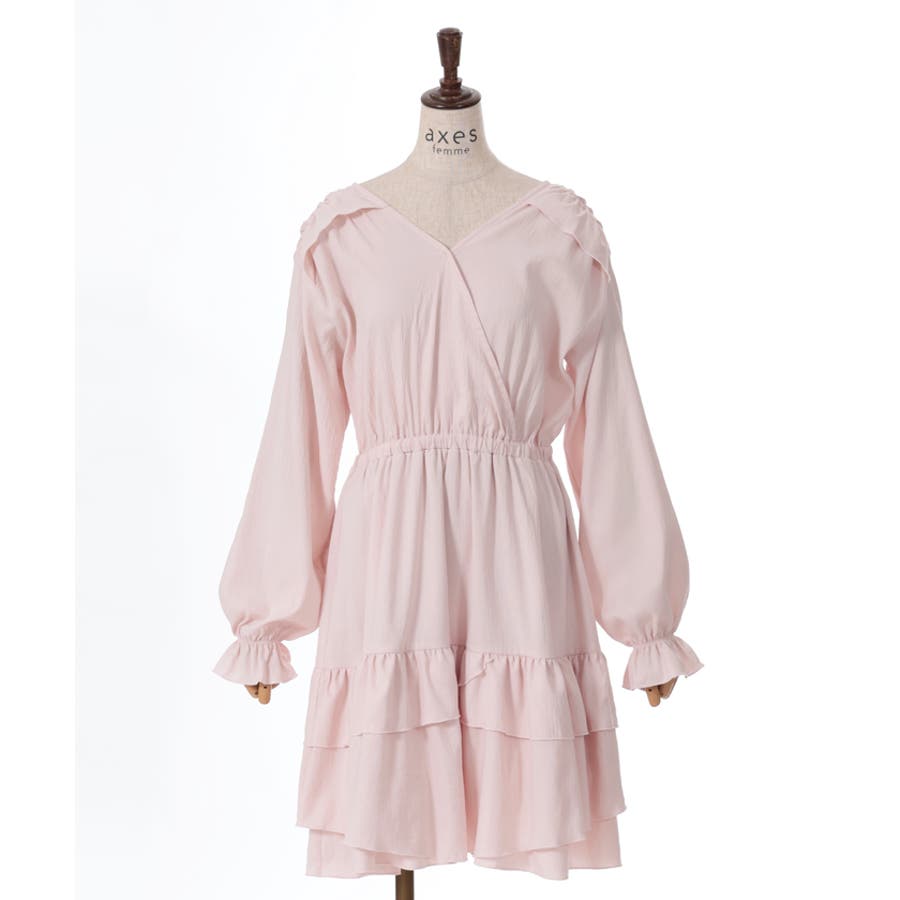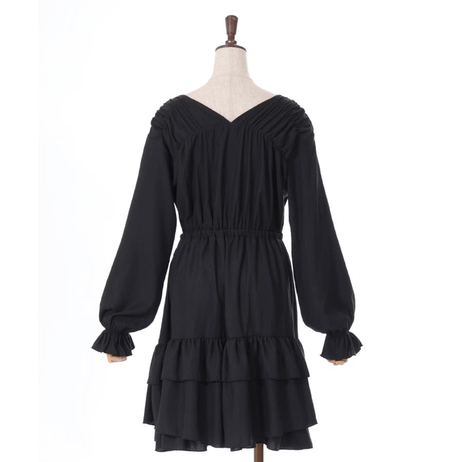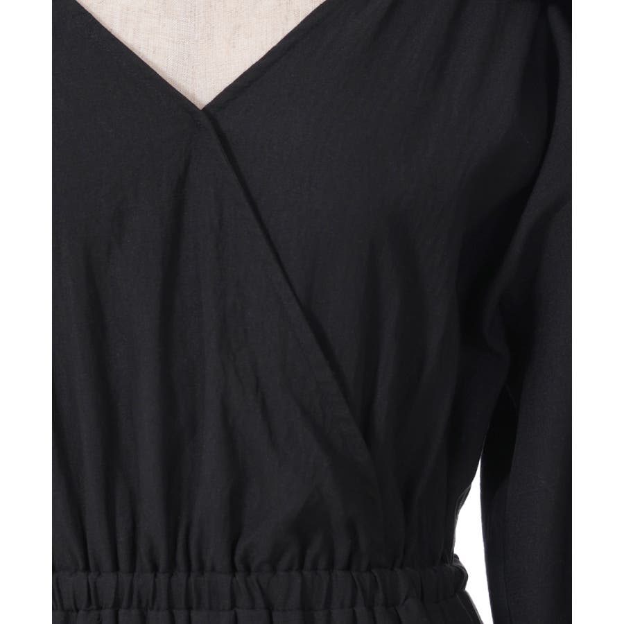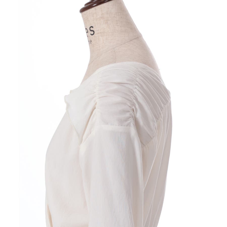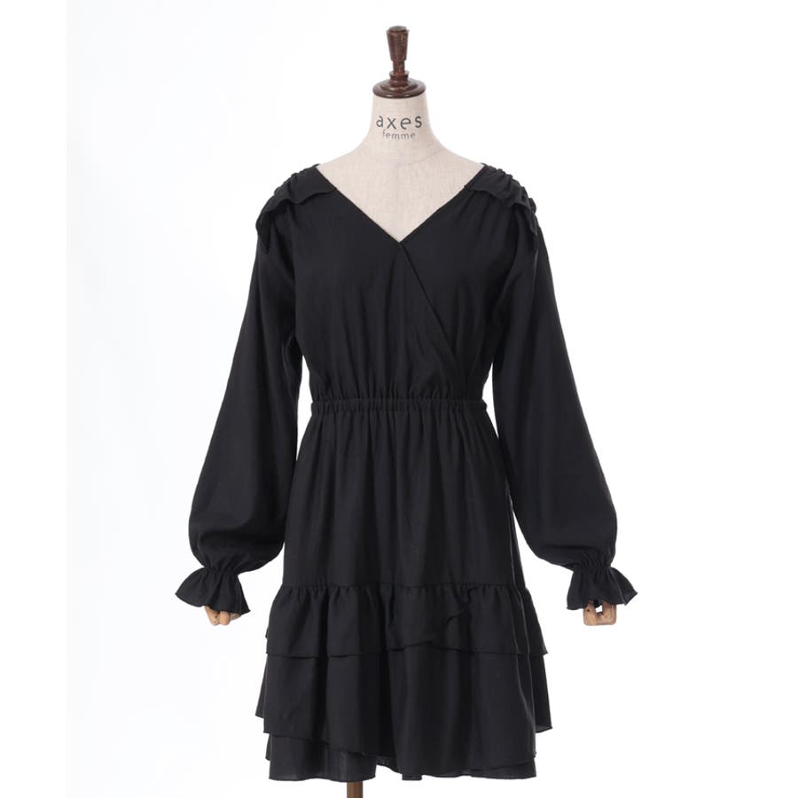 浅めのVネックのためクロスリボンのインナーやビジューが付いたインナーをのぞかせたスタイリングも◎。