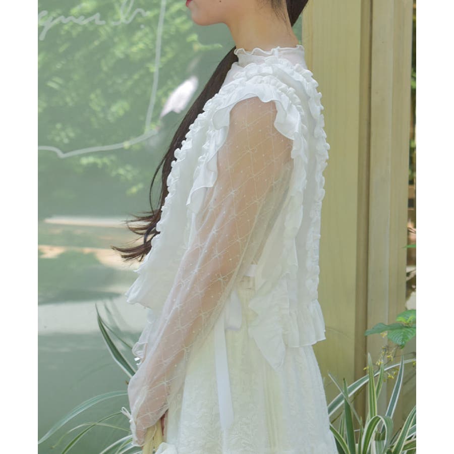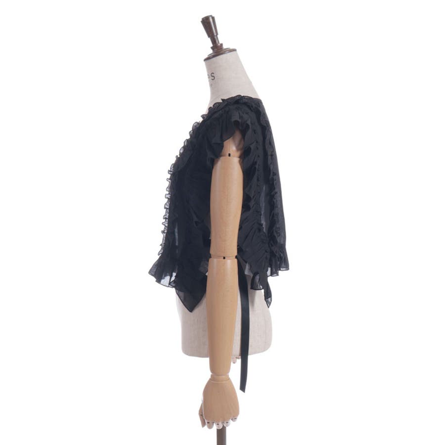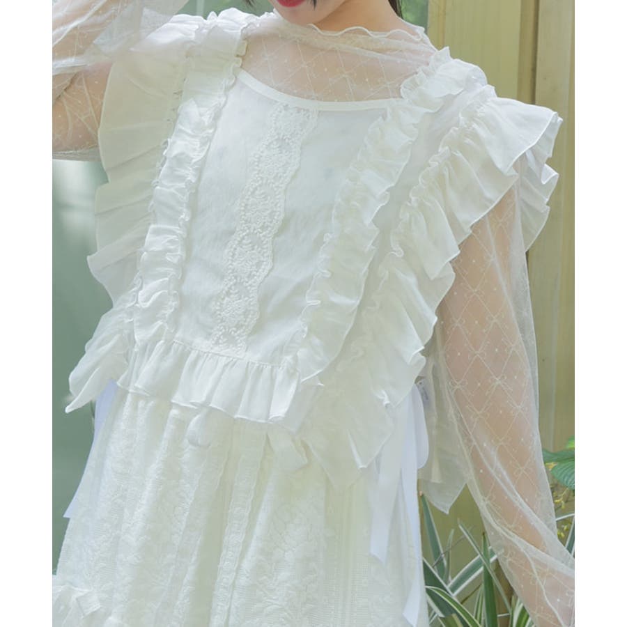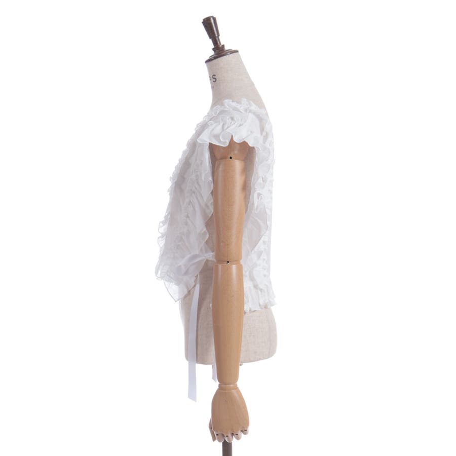 立体感のあるフリルと中央のレース切替が華やかさを演出し、サイドリボンでサイズ感の調整も可能です。