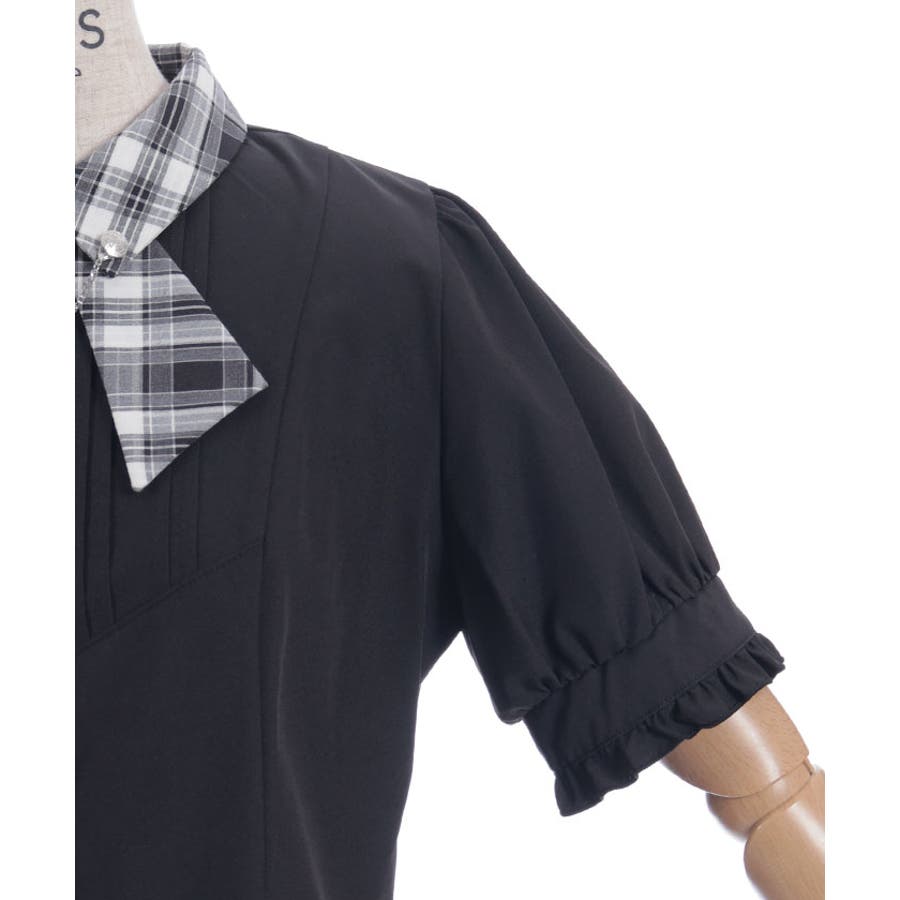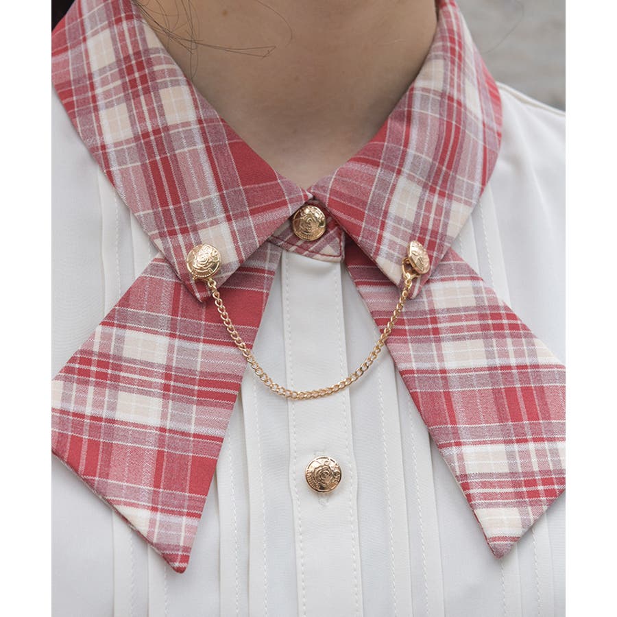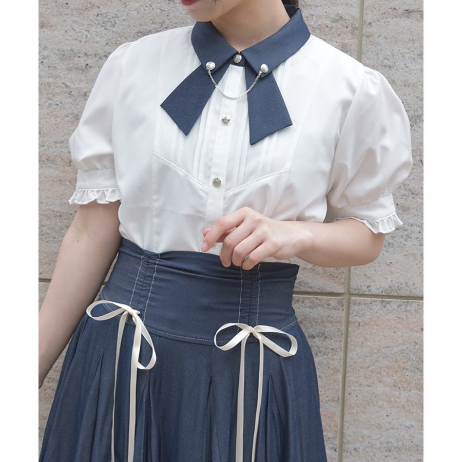 タイ付き風デザイン配色襟ブラウス