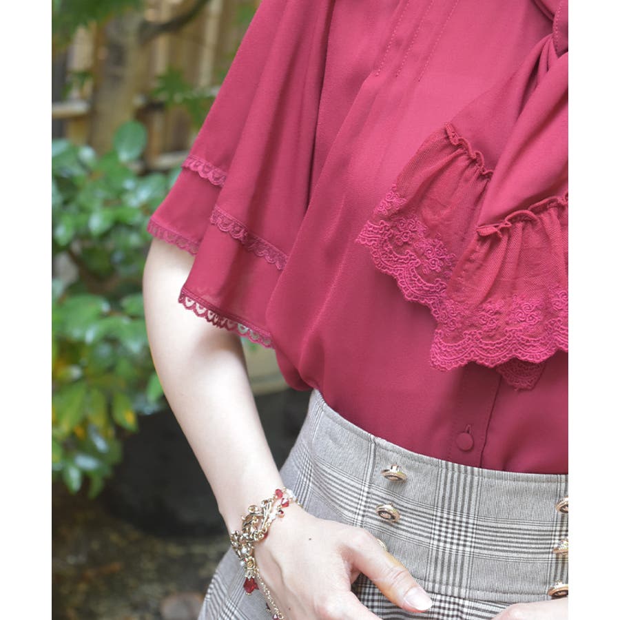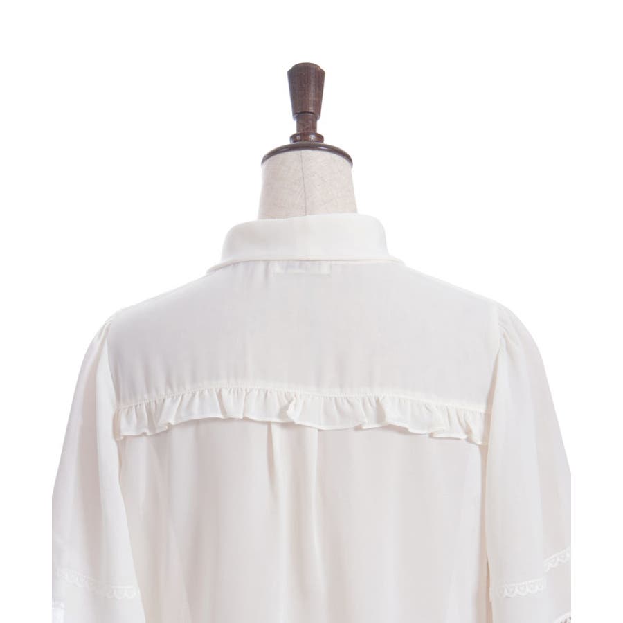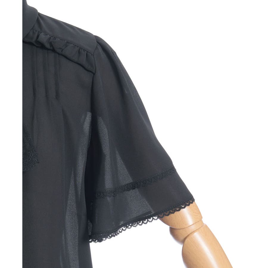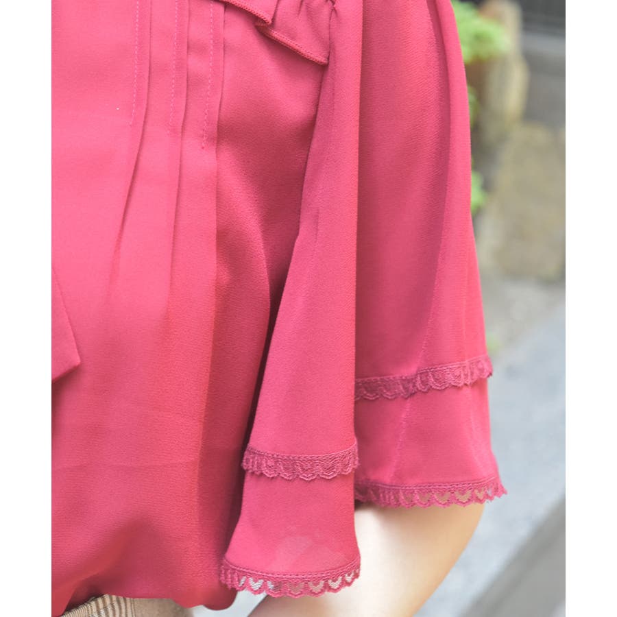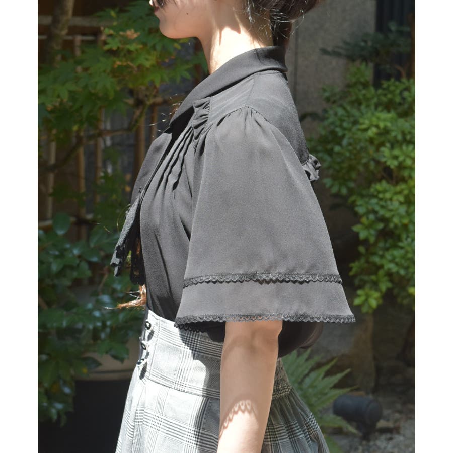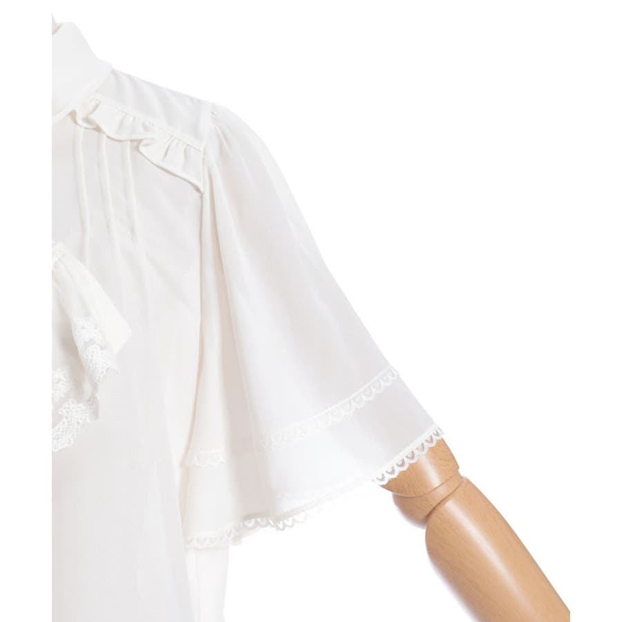 レースで縁取られたリボンは、フロントに華やかさをプラスしながら顔まわりを印象的に。フレアスリーブが程よい抜け感を演出し、暑い時季でも軽やかに着用いただけます。