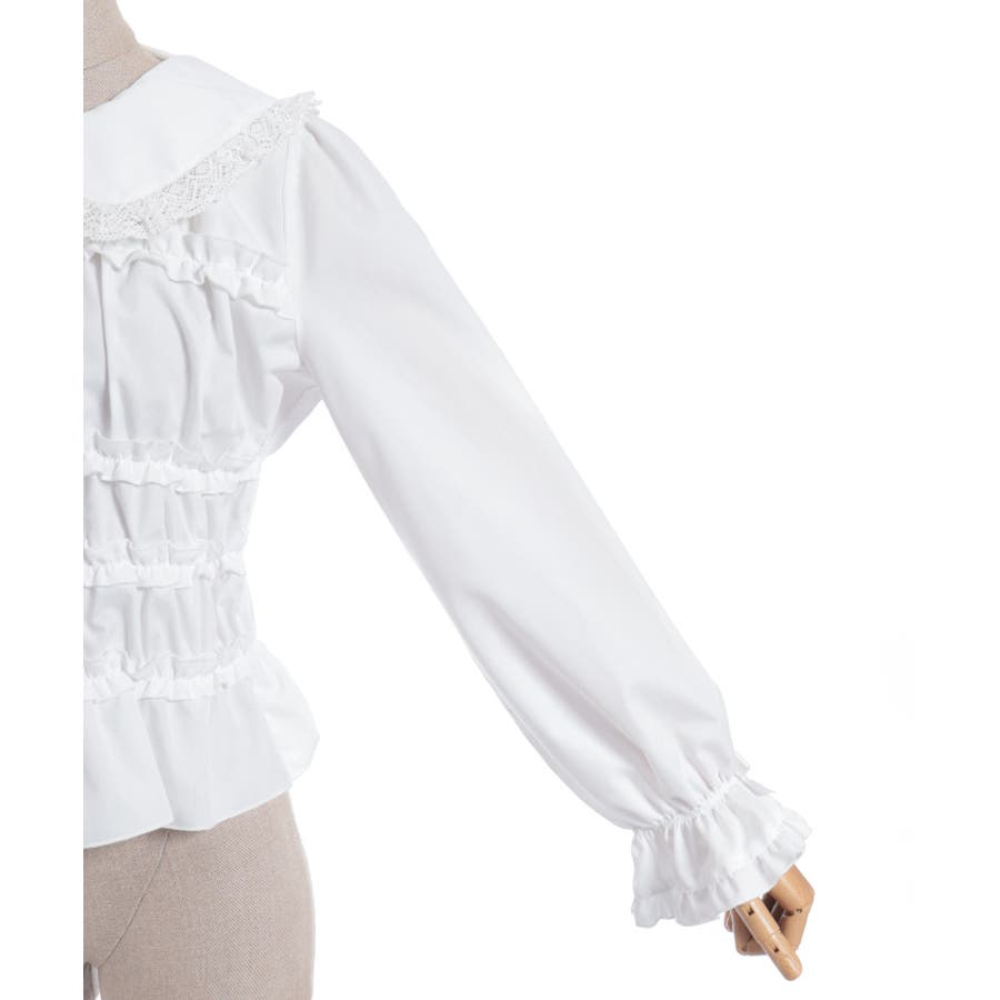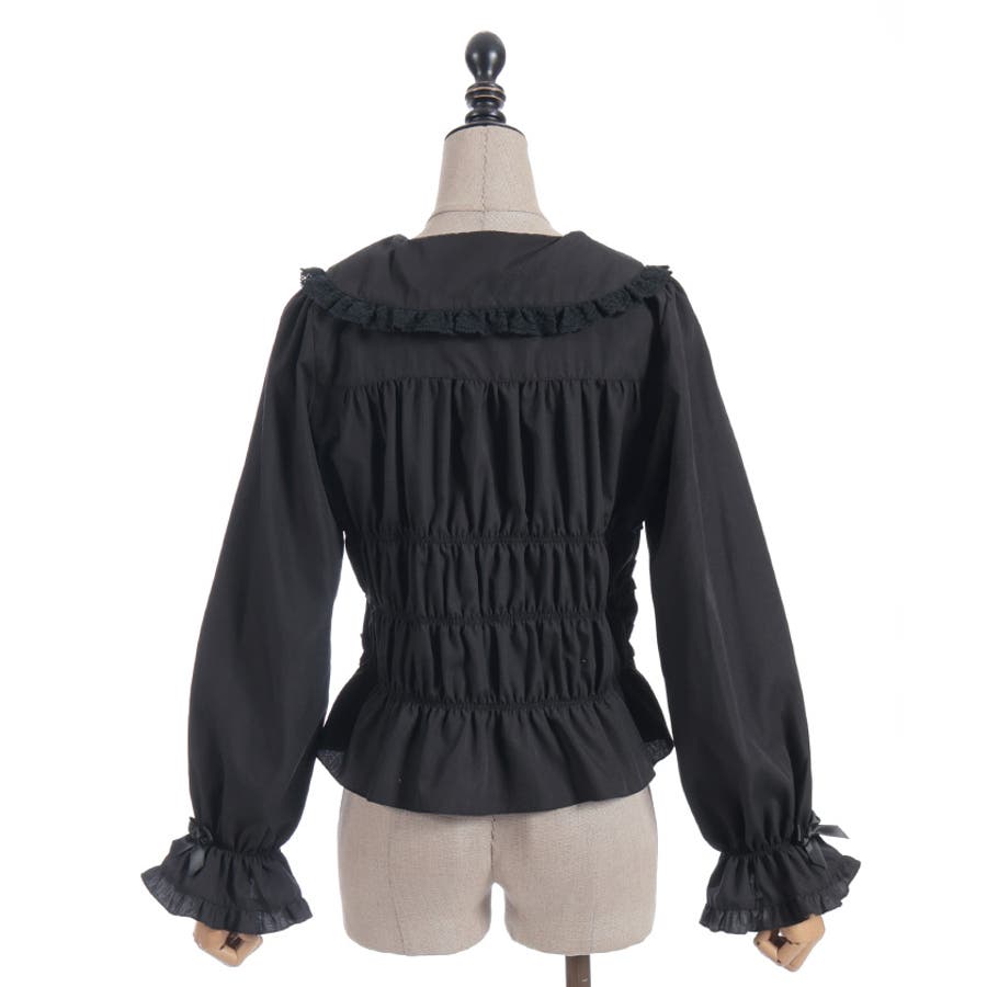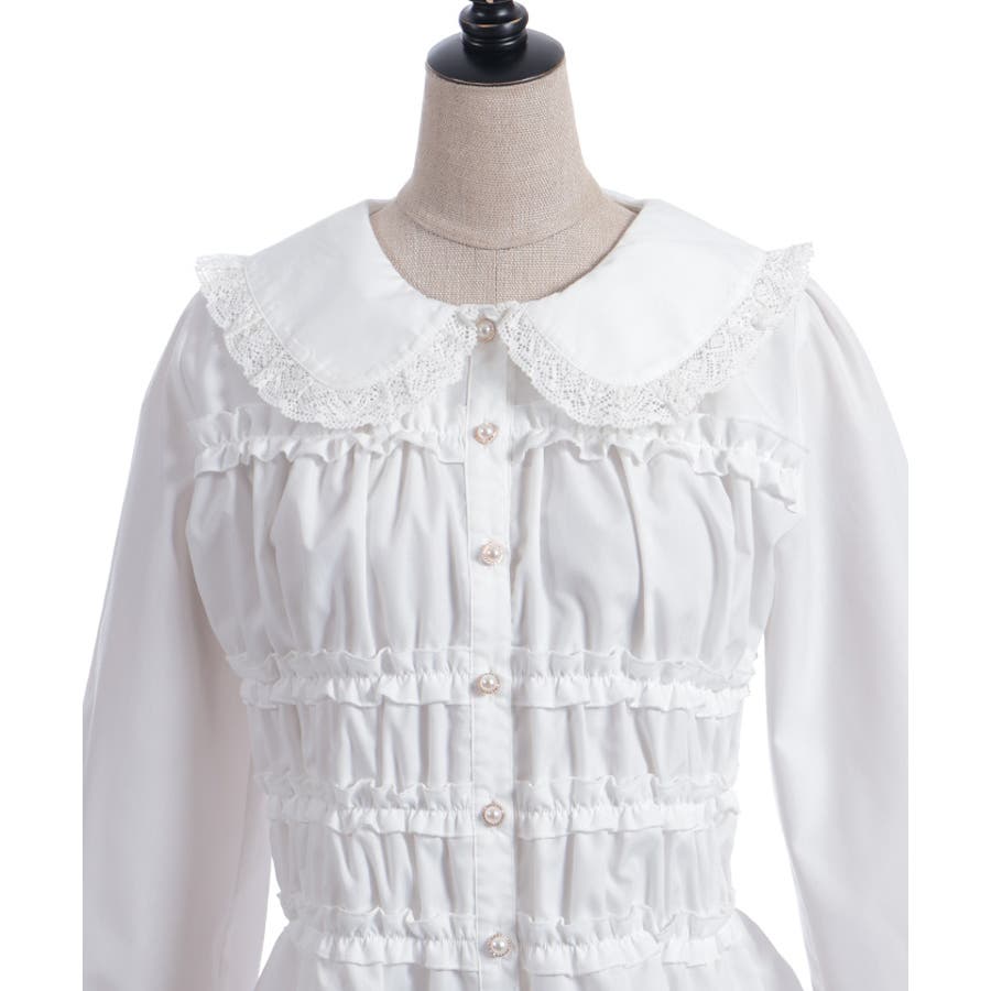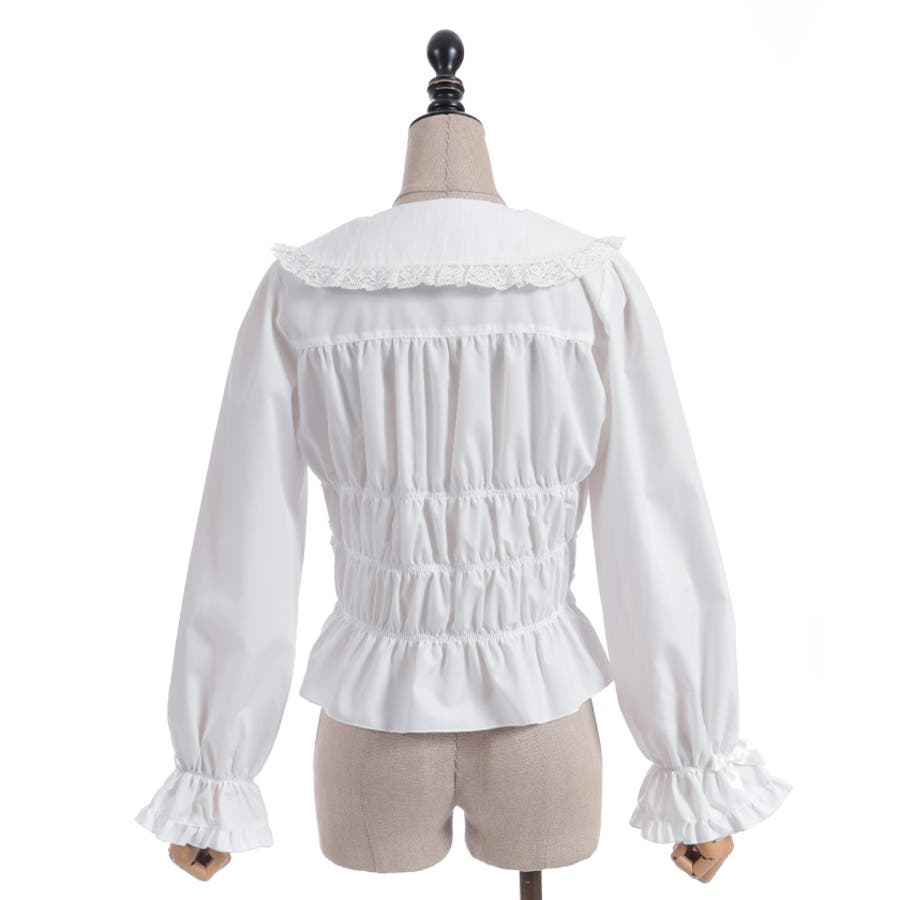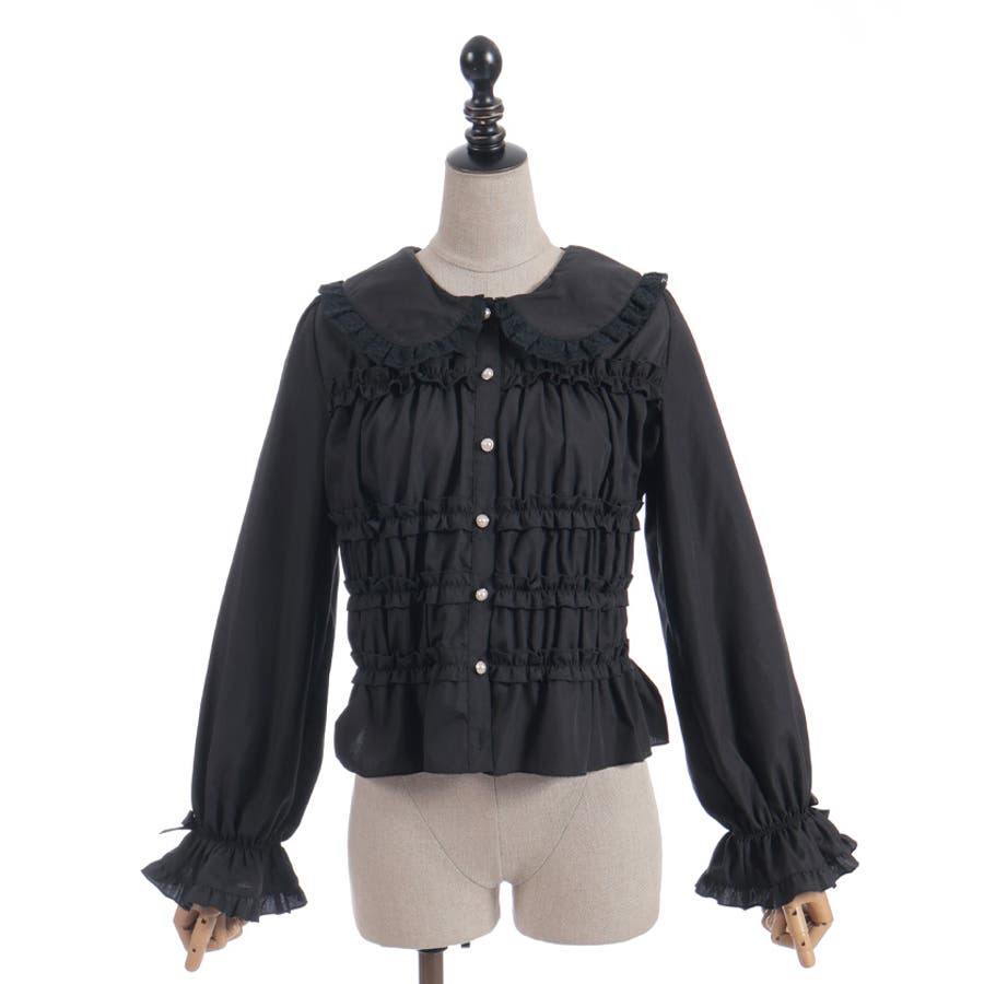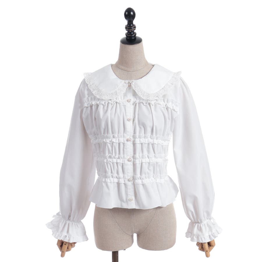シャーリングのシルエットがクラシカルな丸襟のブラウス