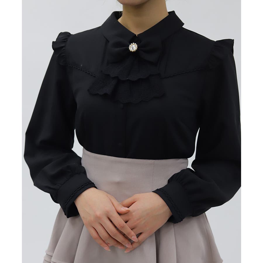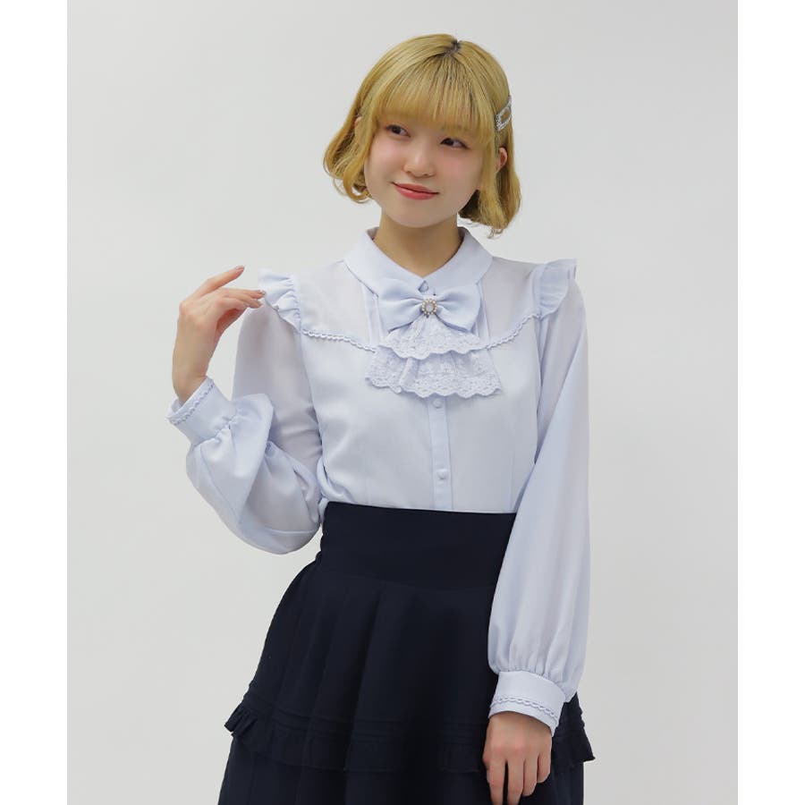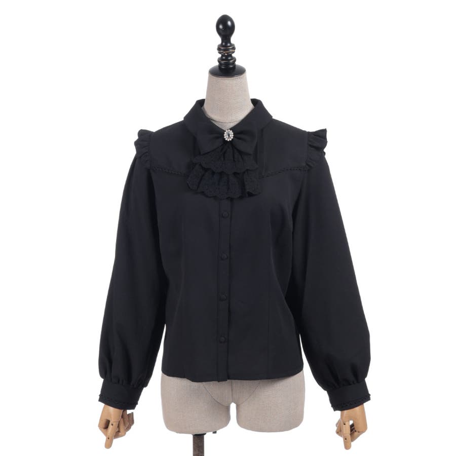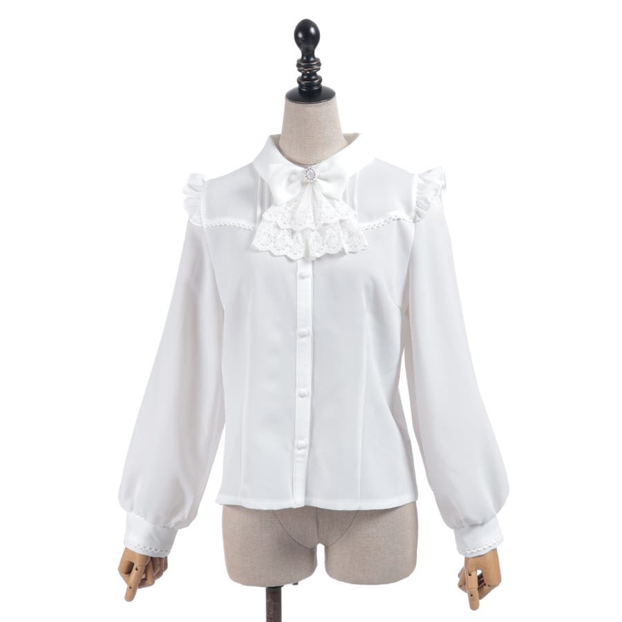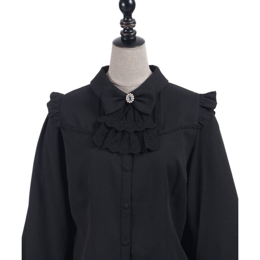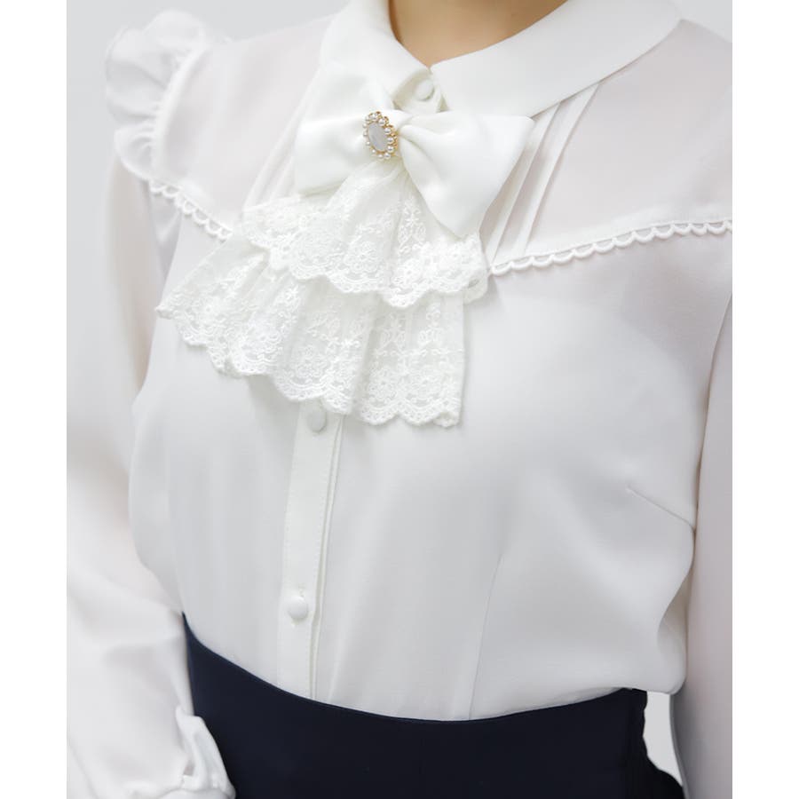 レースフリルが立体感のある、リボンジャボのブローチがセットになったブラウスです。