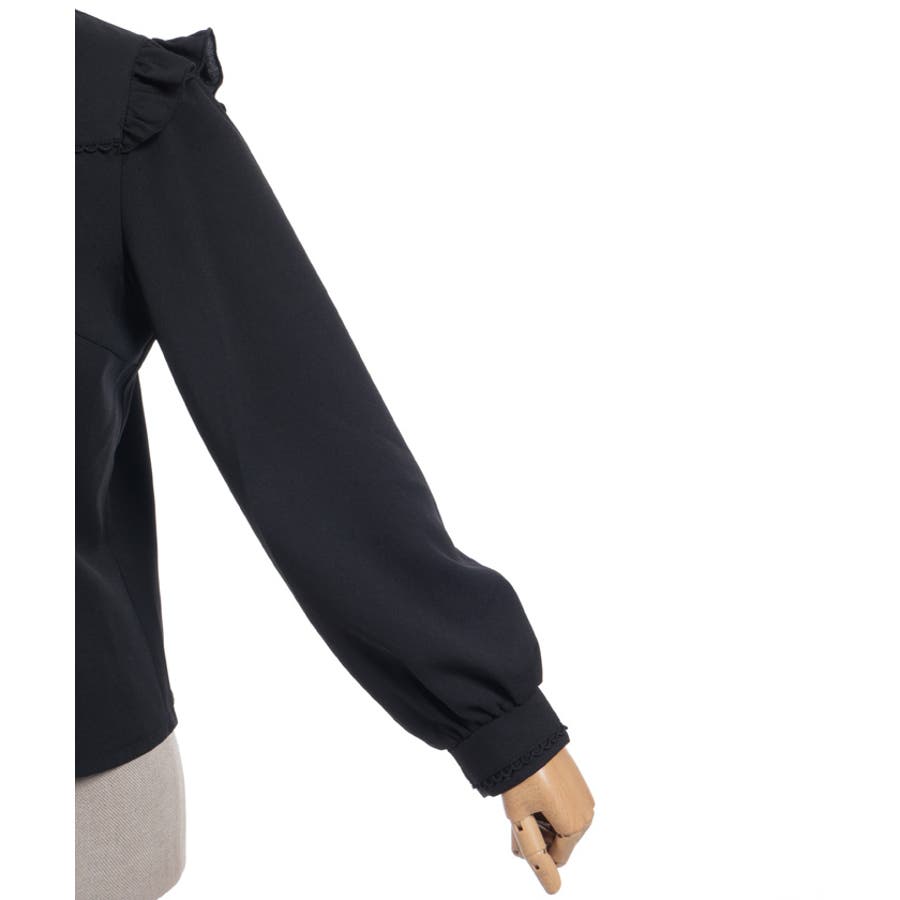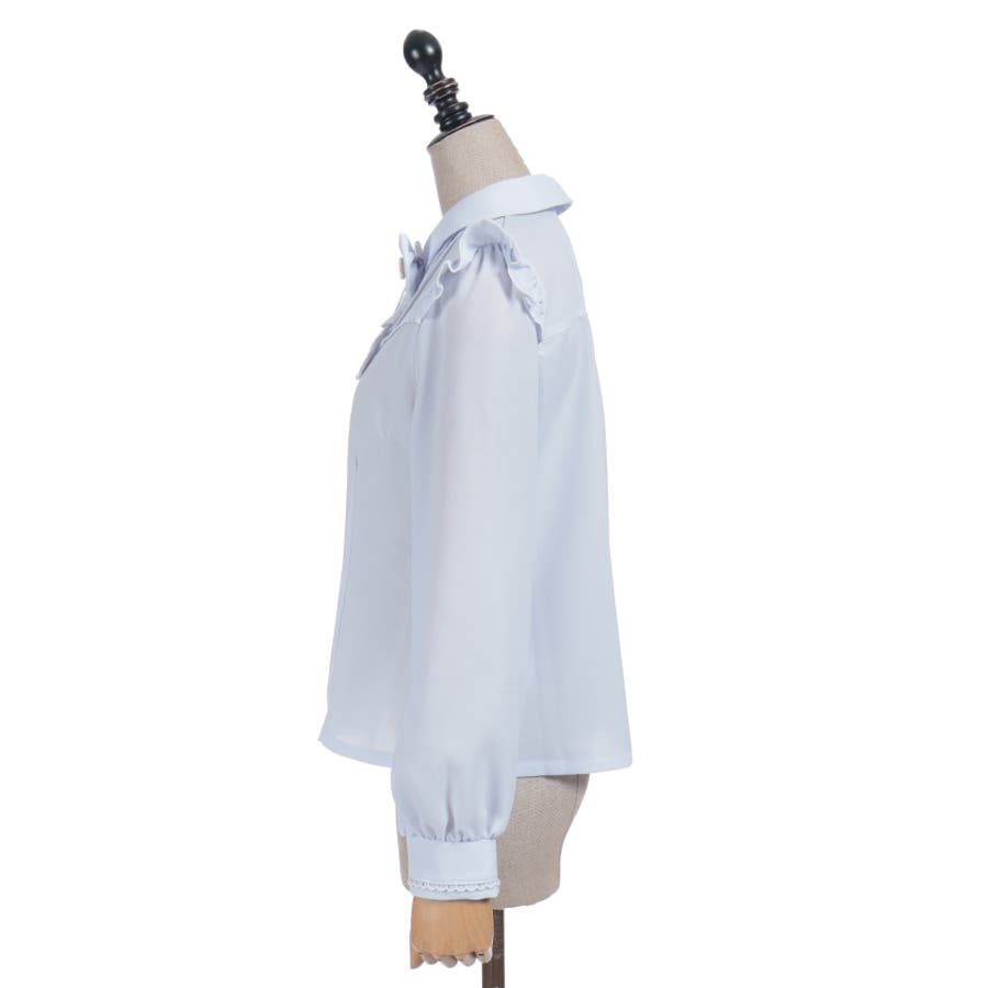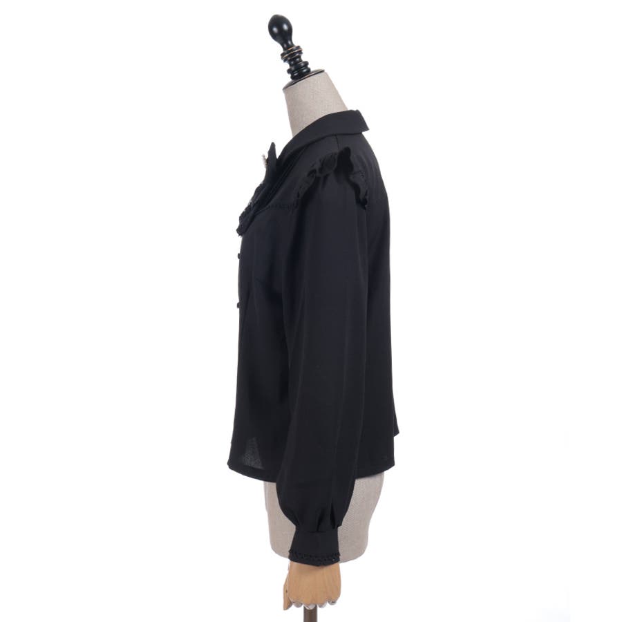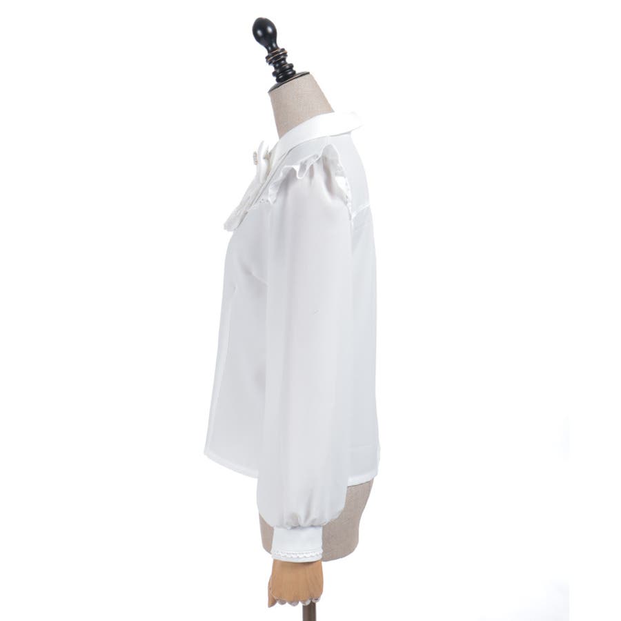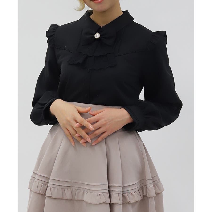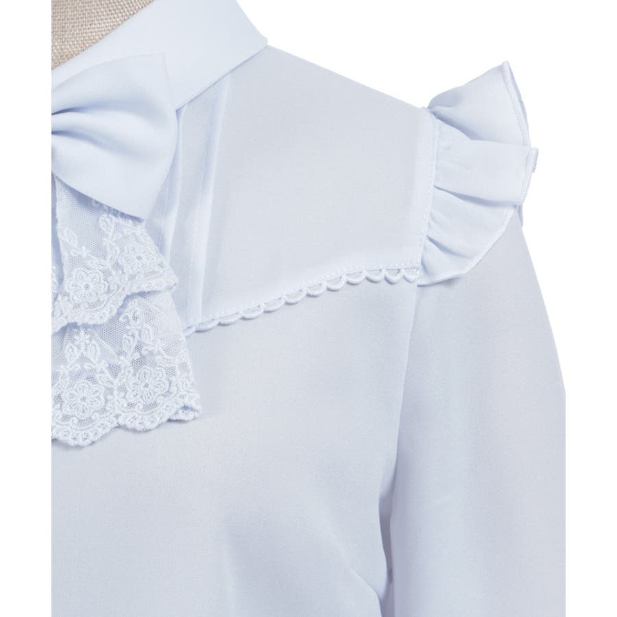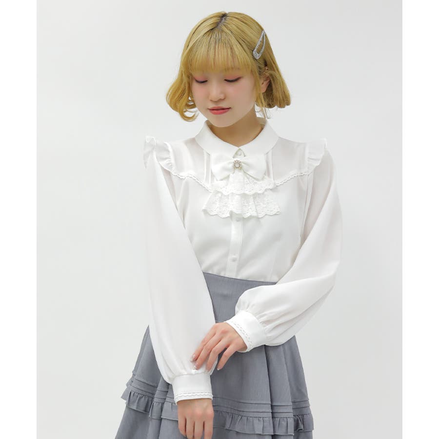 レースフリルが立体感のある、リボンジャボのブローチがセットになったブラウスです。