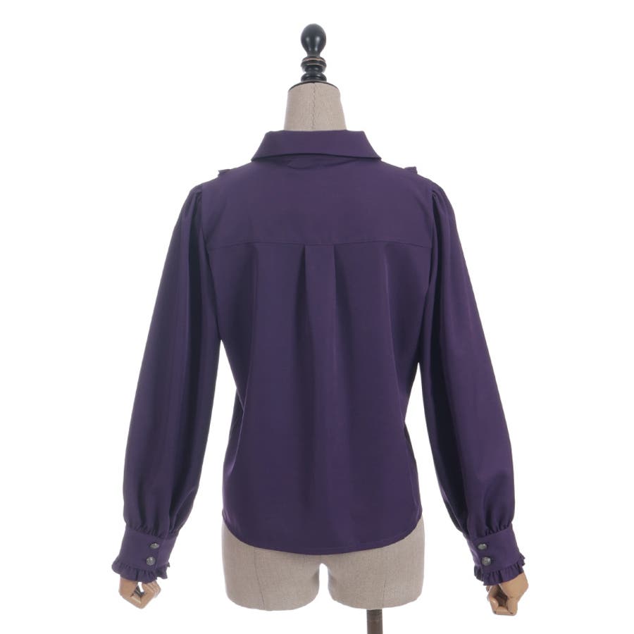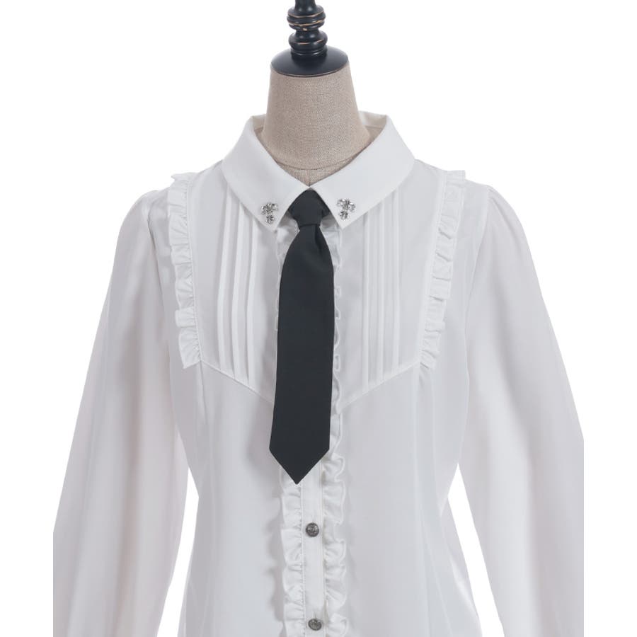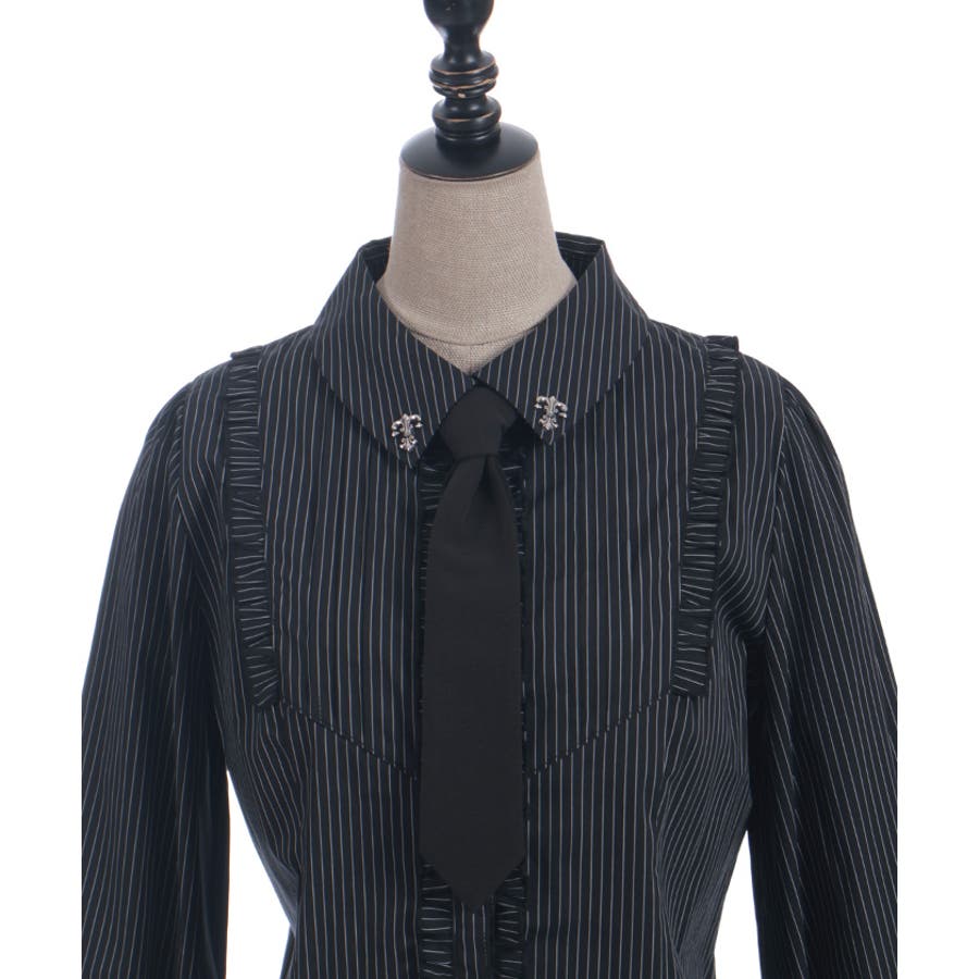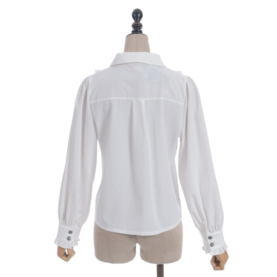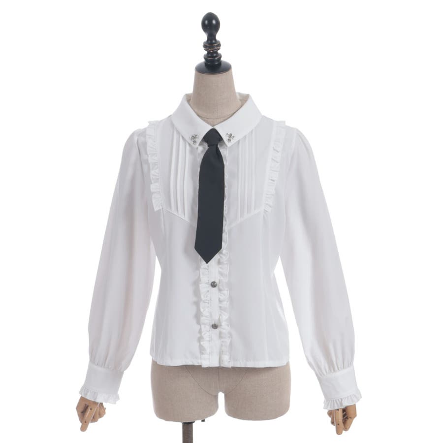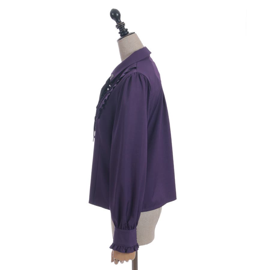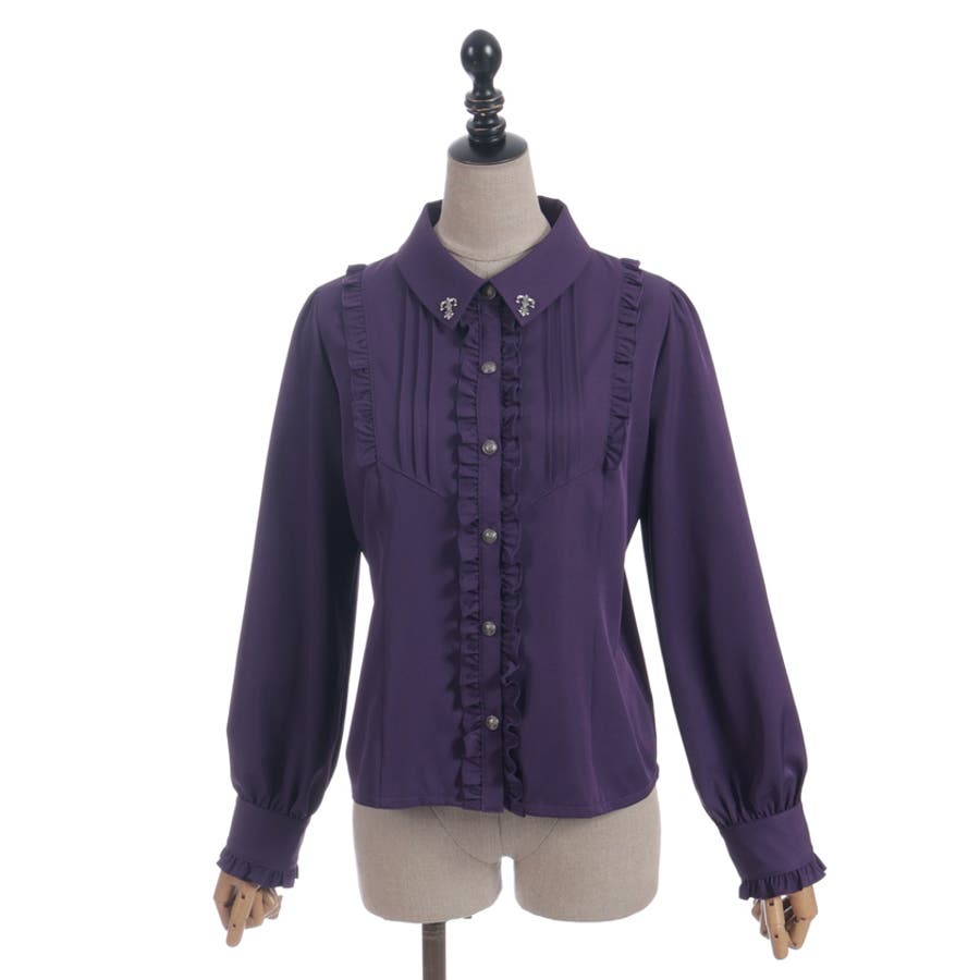 襟にあしらった金具パーツが目を惹くブラウスです。