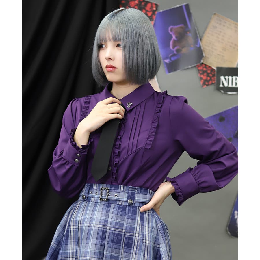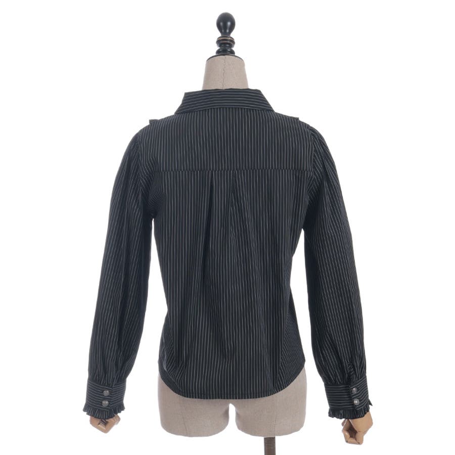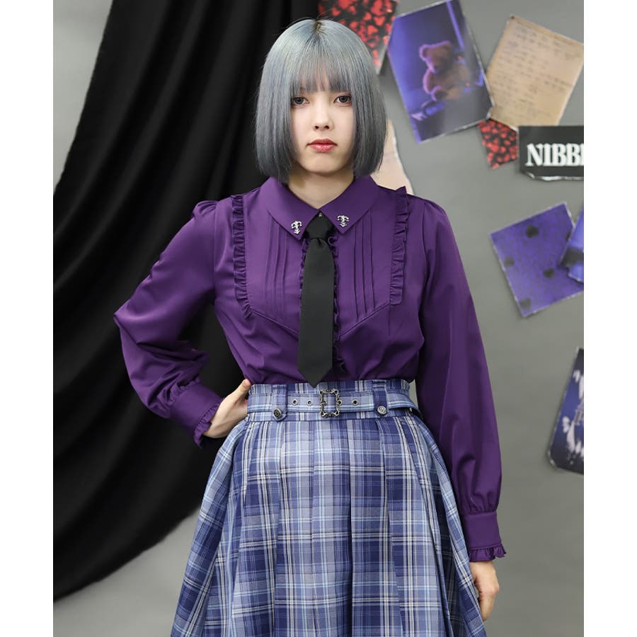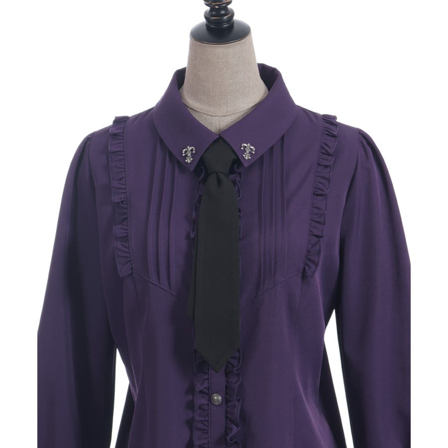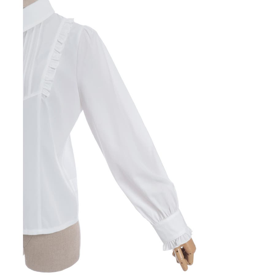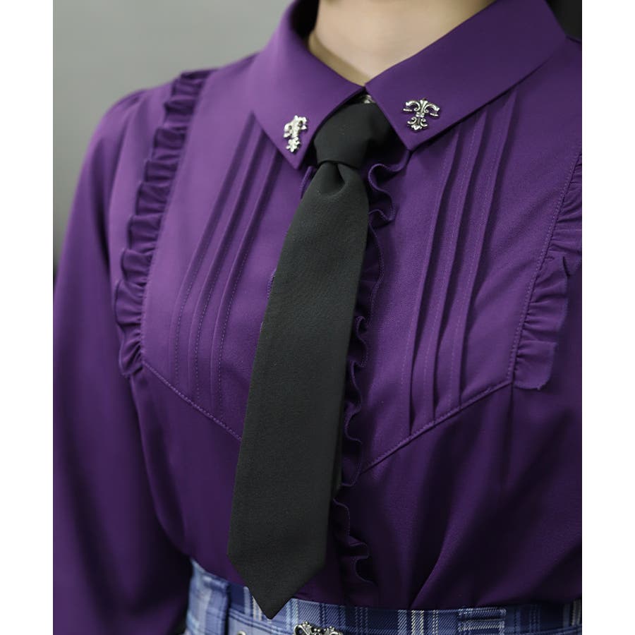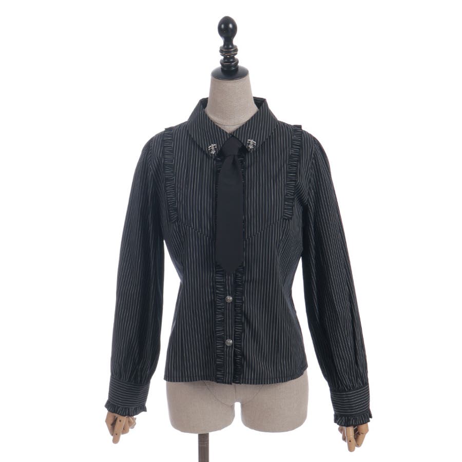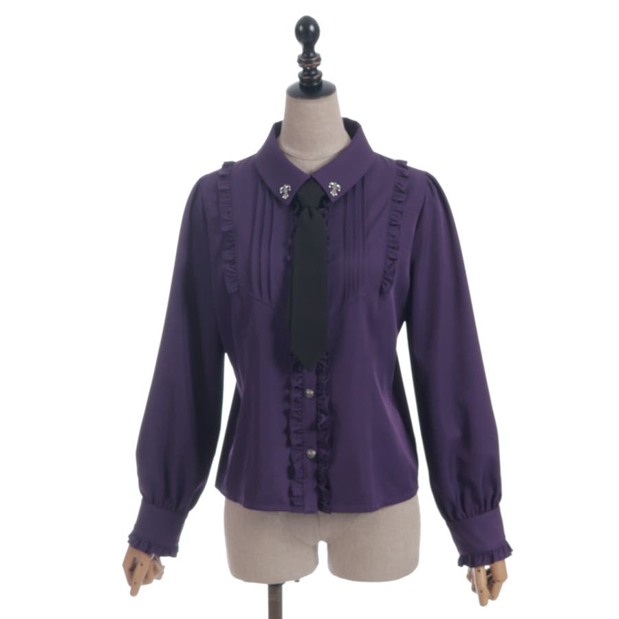襟にあしらった金具パーツが目を惹くブラウスです。