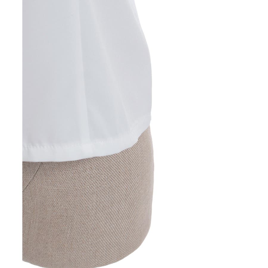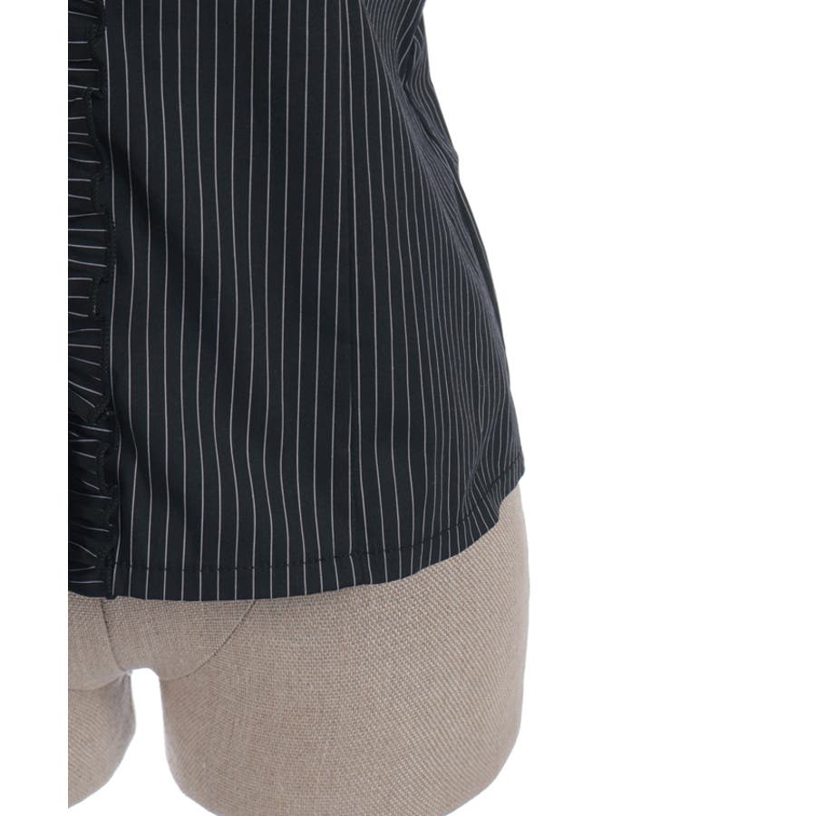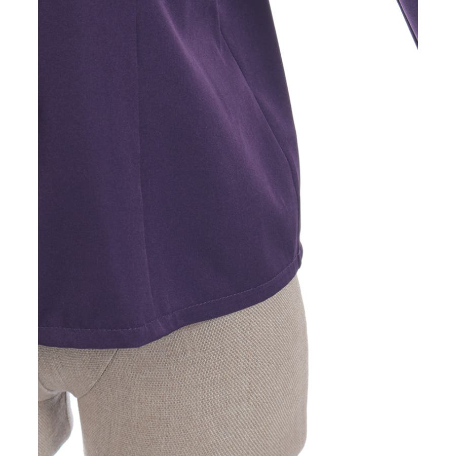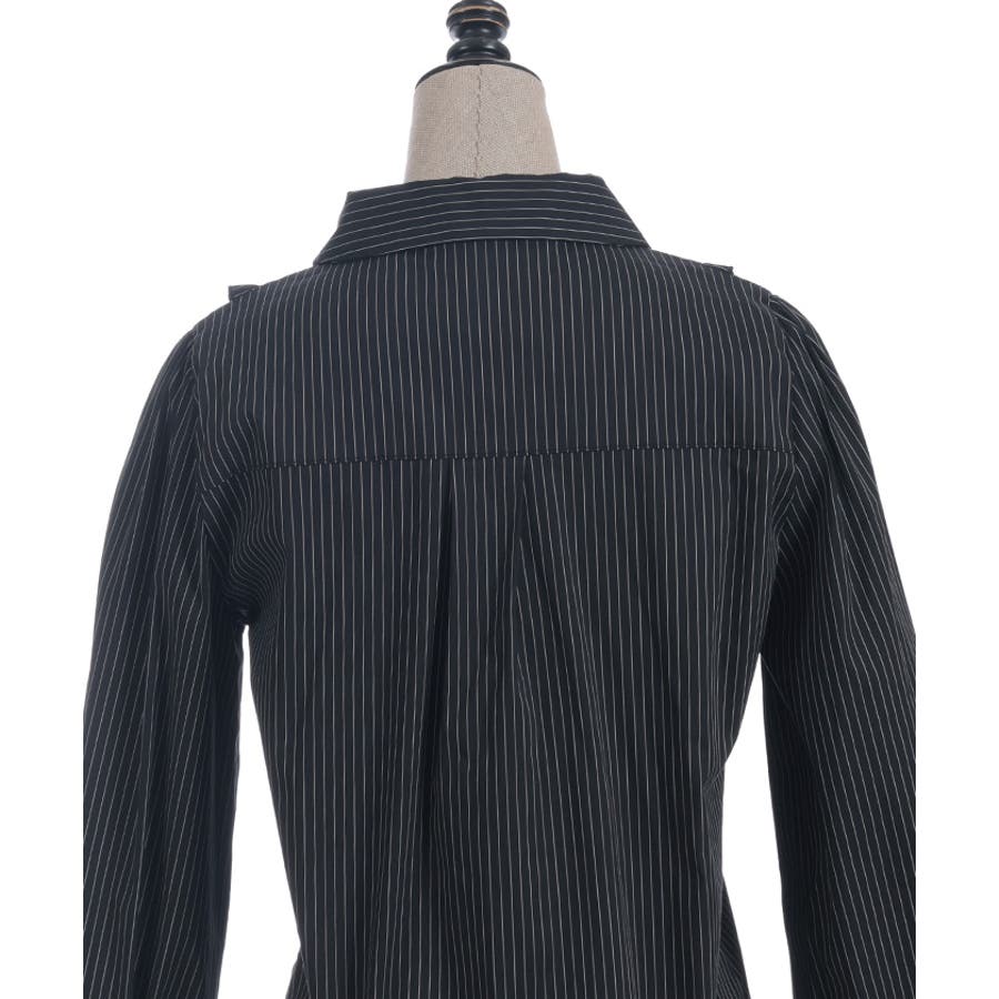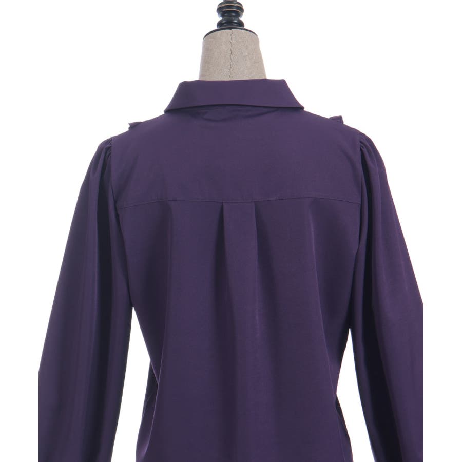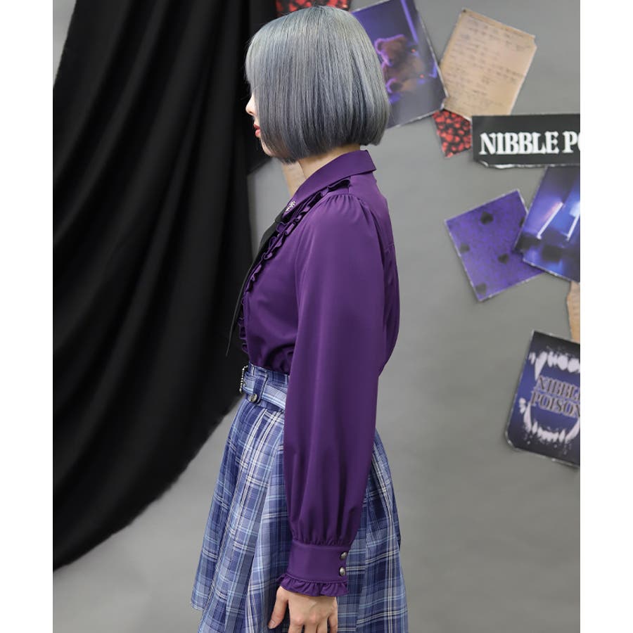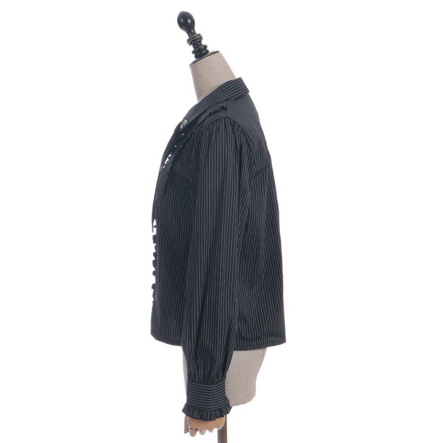 襟にあしらった金具パーツが目を惹くブラウスです。