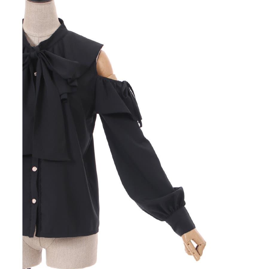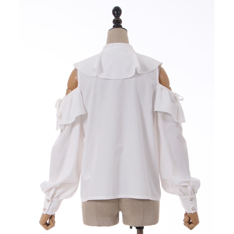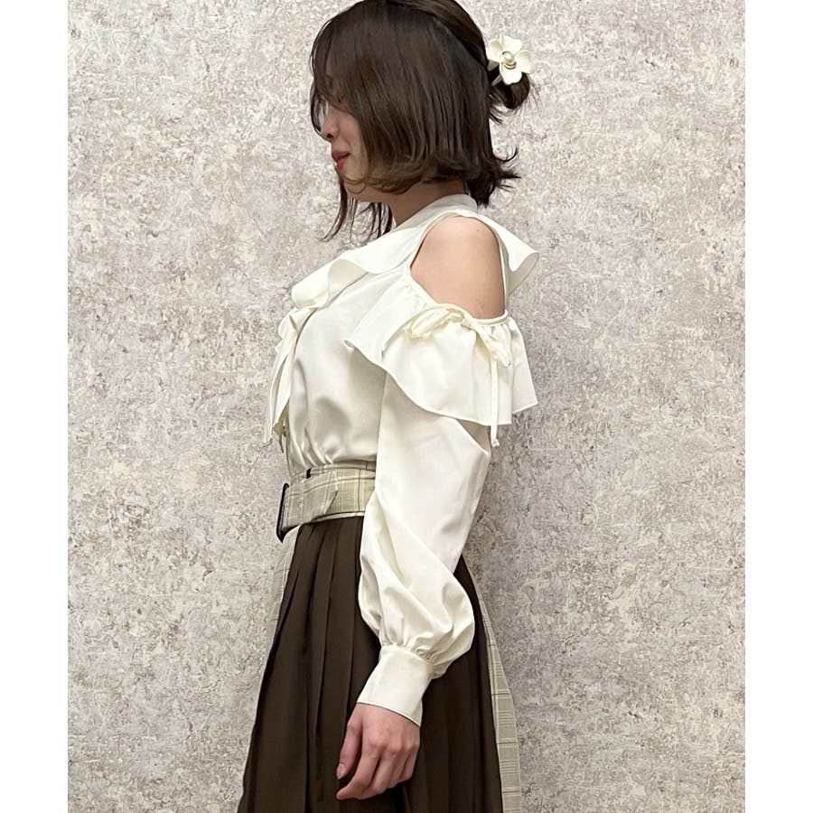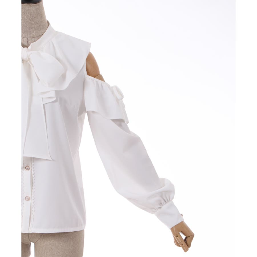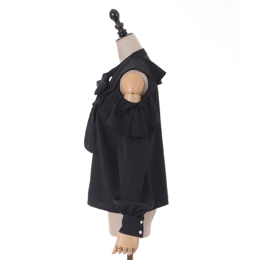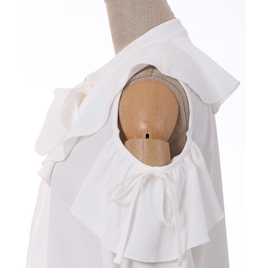 肩の内側にループがついており、袖側についている紐でオフショルに出来る2wayブラウス。紐はループに通した状態でオフショルにもできるように長めにお作りしています。大きめボウタイリボンでガーリーに着こなせます。襟元のフリルはニットカーデなどを羽織った際に出せるようになっています。