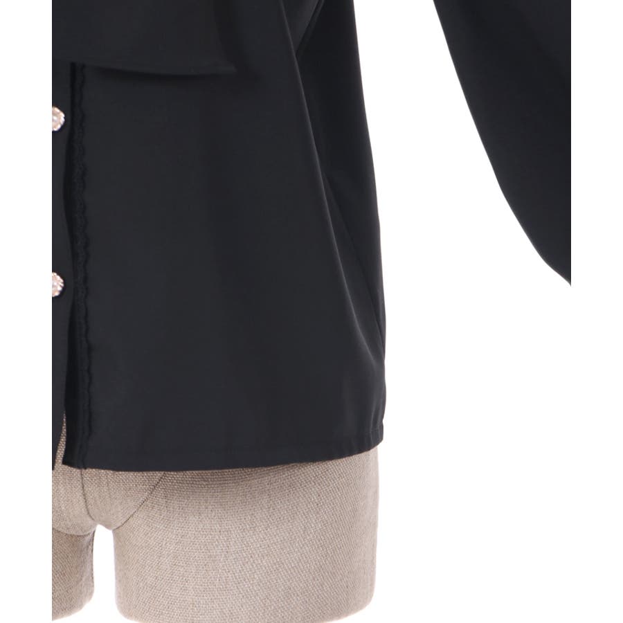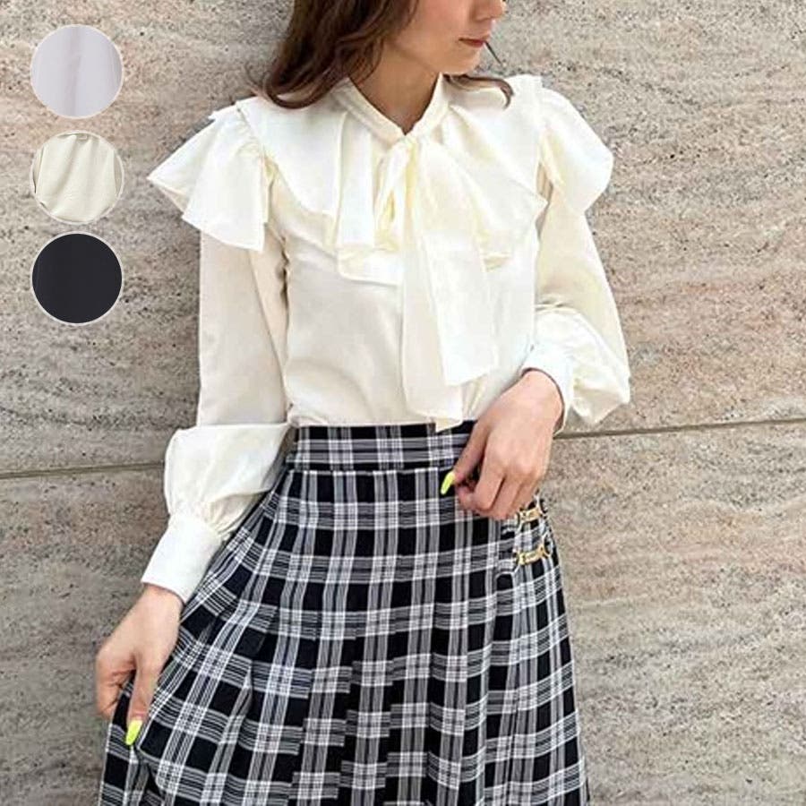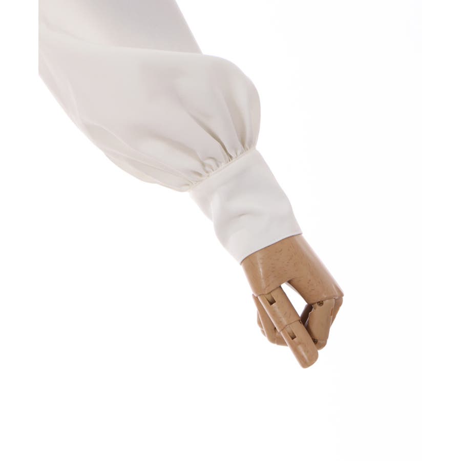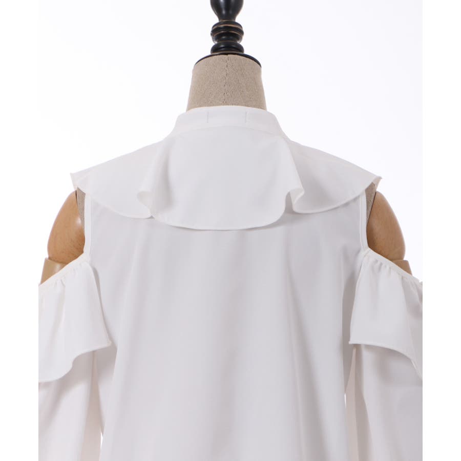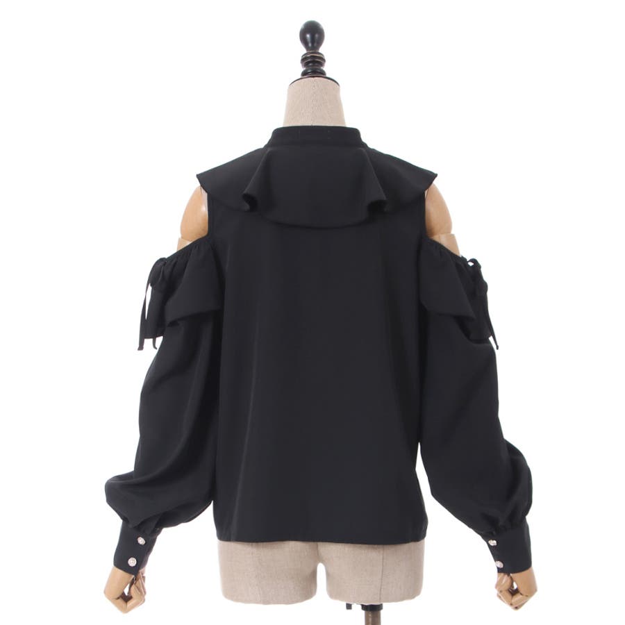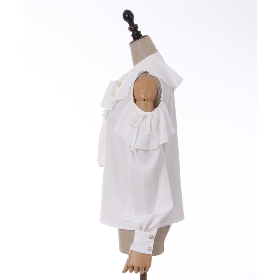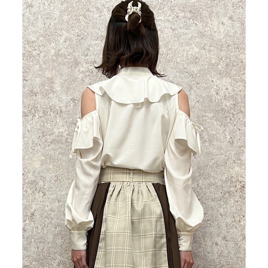 肩の内側にループがついており、袖側についている紐でオフショルに出来る2wayブラウス。紐はループに通した状態でオフショルにもできるように長めにお作りしています。大きめボウタイリボンでガーリーに着こなせます。襟元のフリルはニットカーデなどを羽織った際に出せるようになっています。