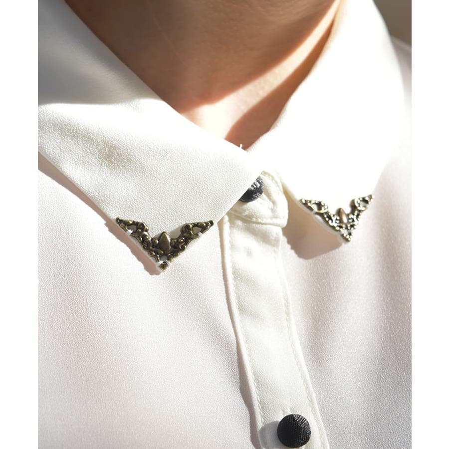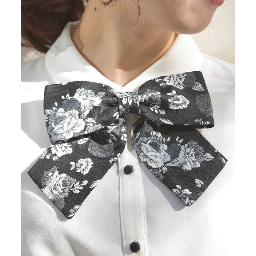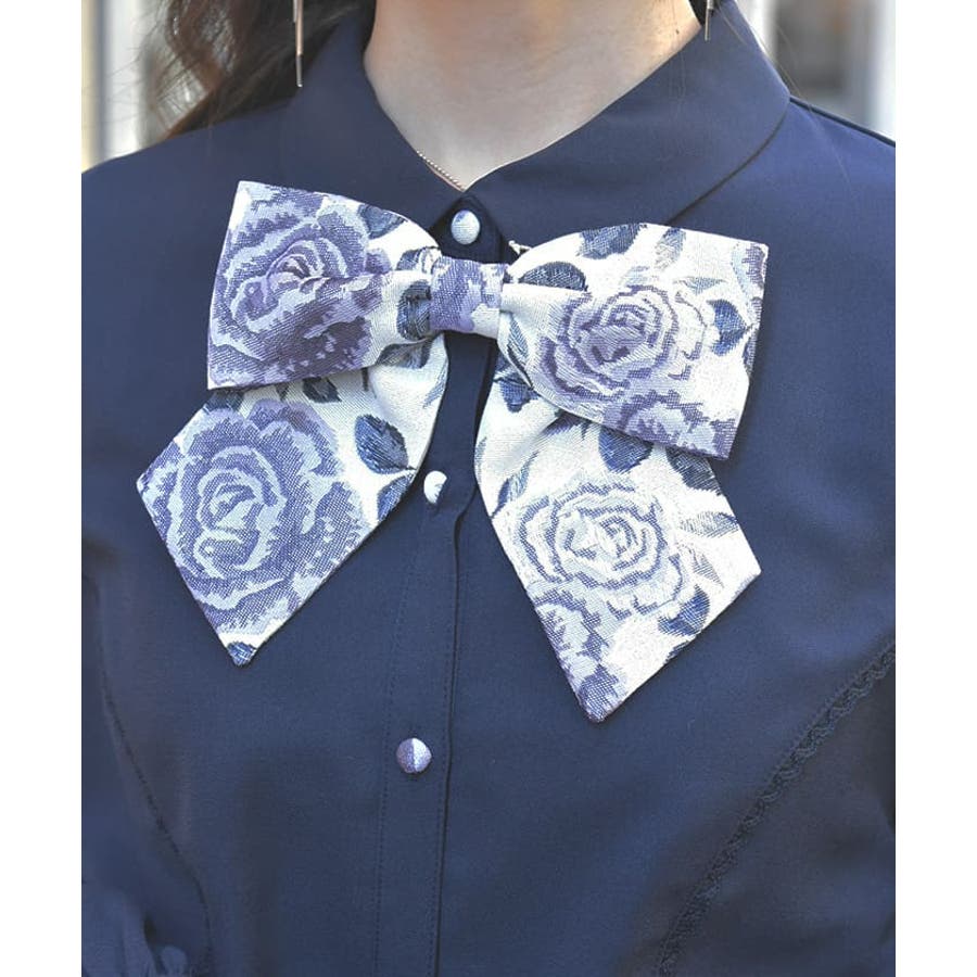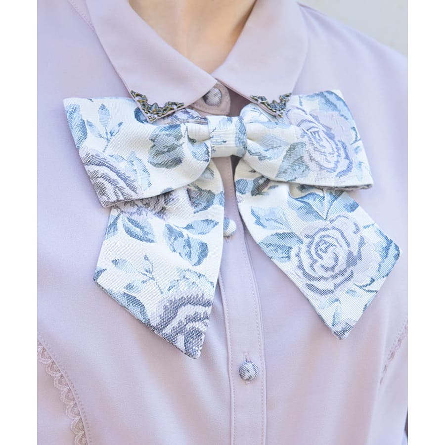 配色感のある花柄のリボンブローチをあしらい、襟先の小ぶりなメッキパーツが目を惹くデザインになっています。