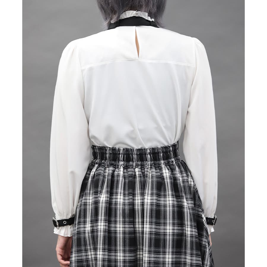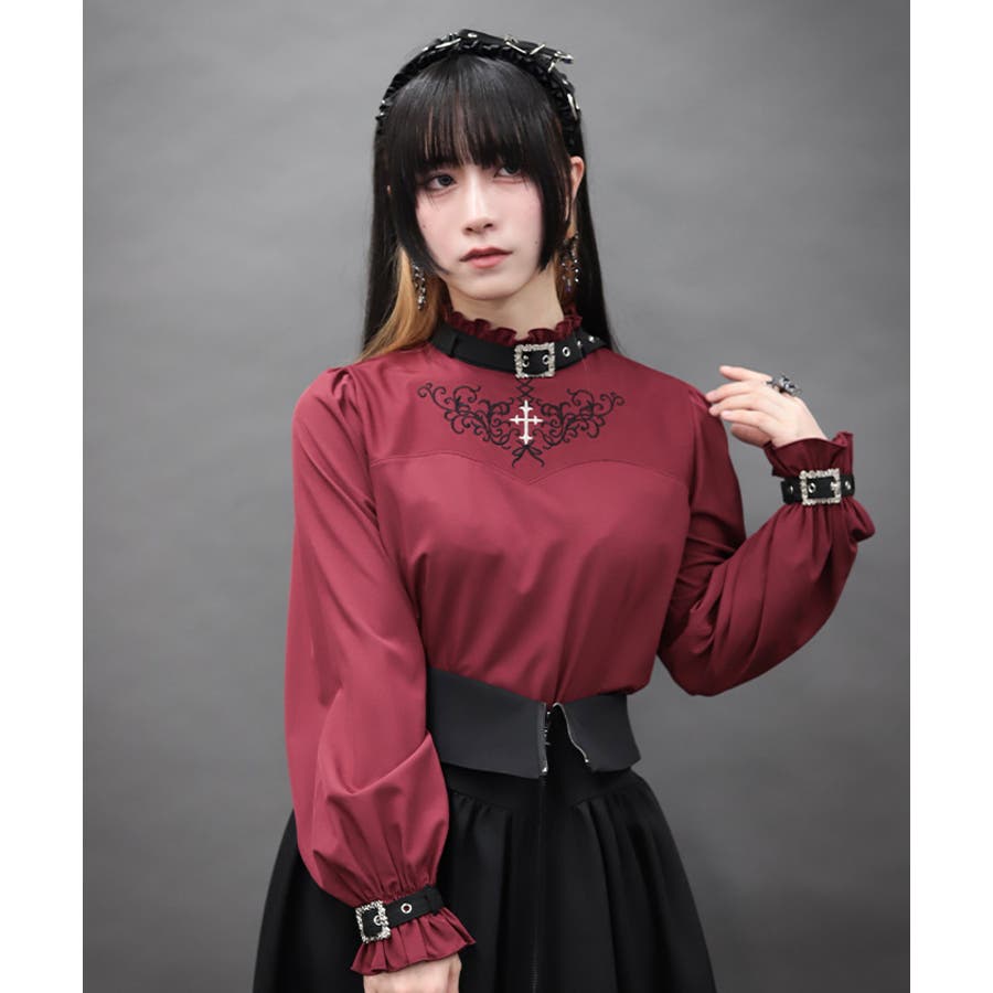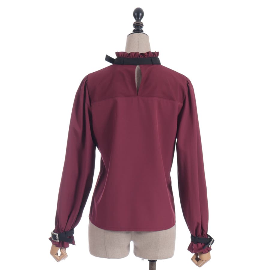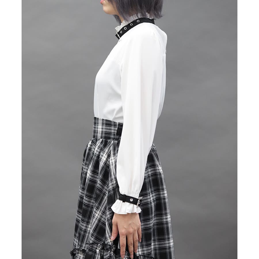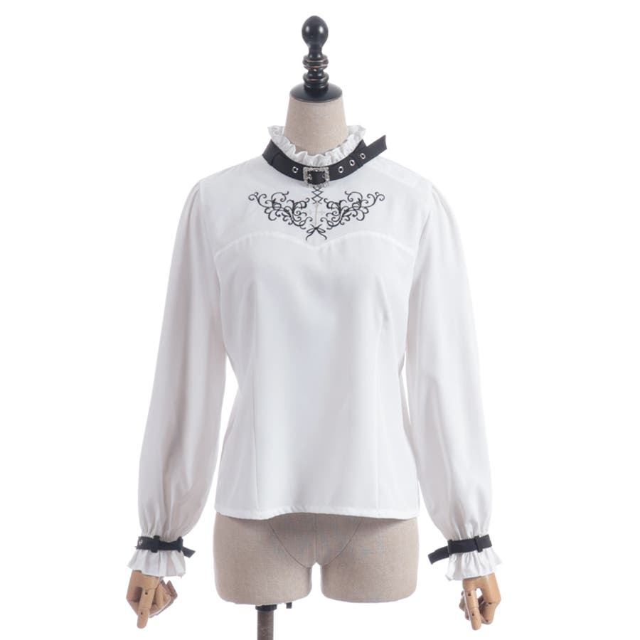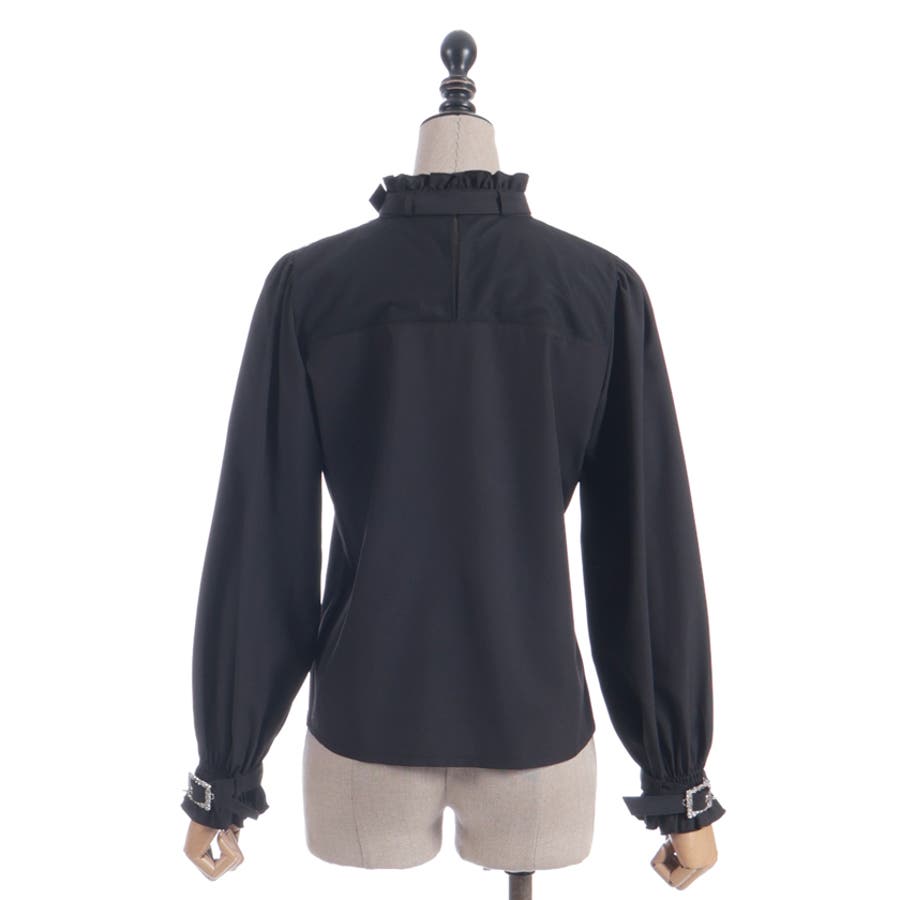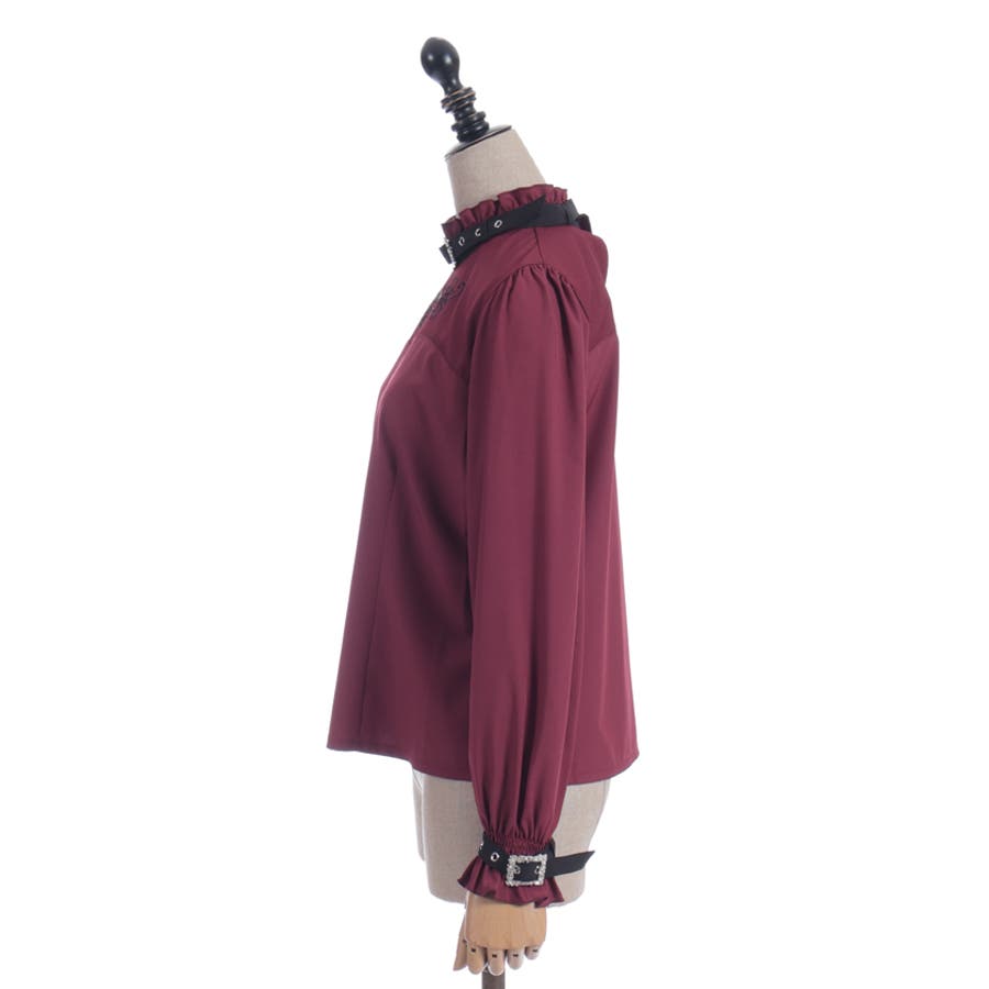 首元と袖口にベルトをあしらった辛口デザインのブラウスです。