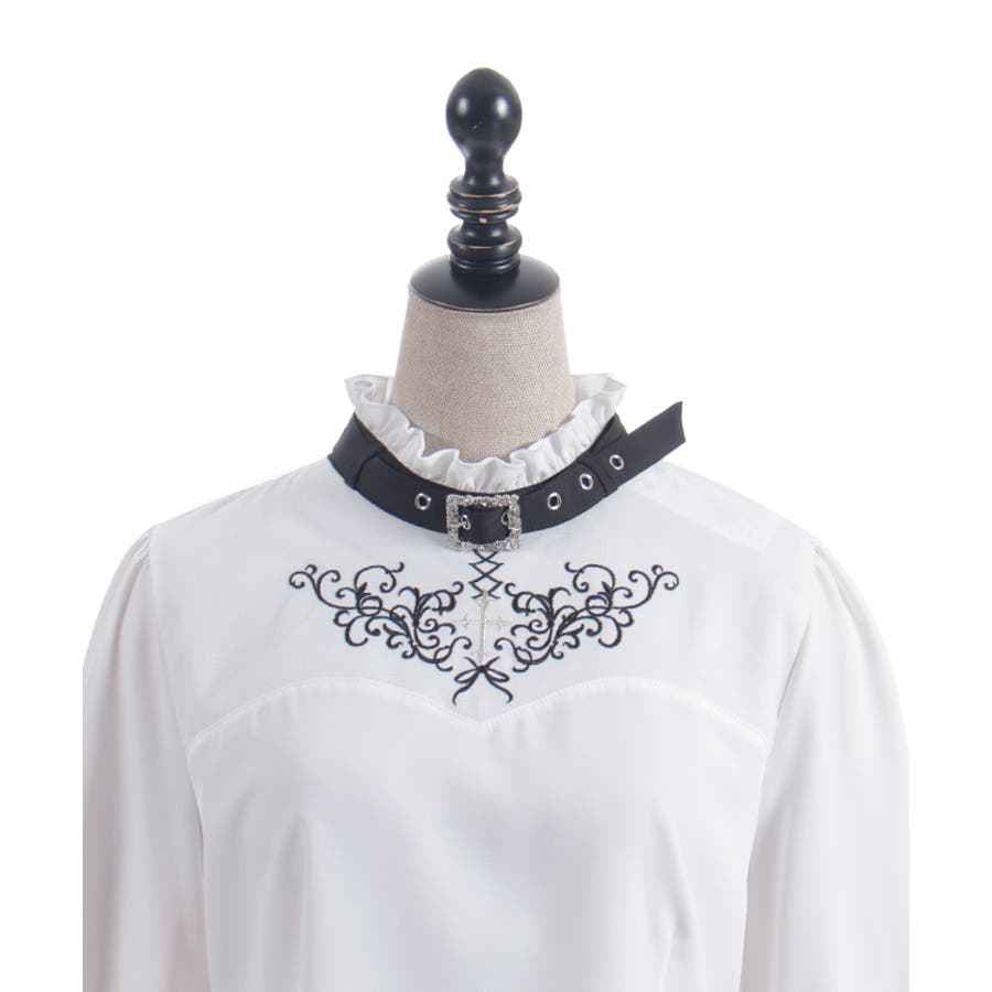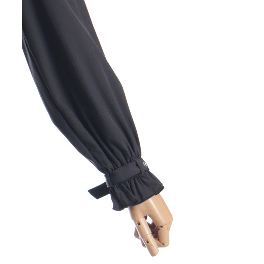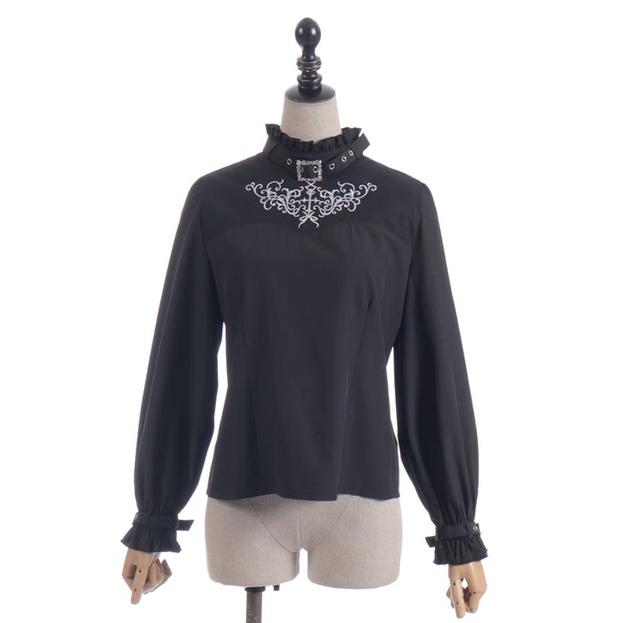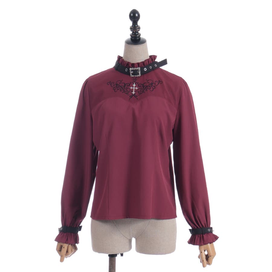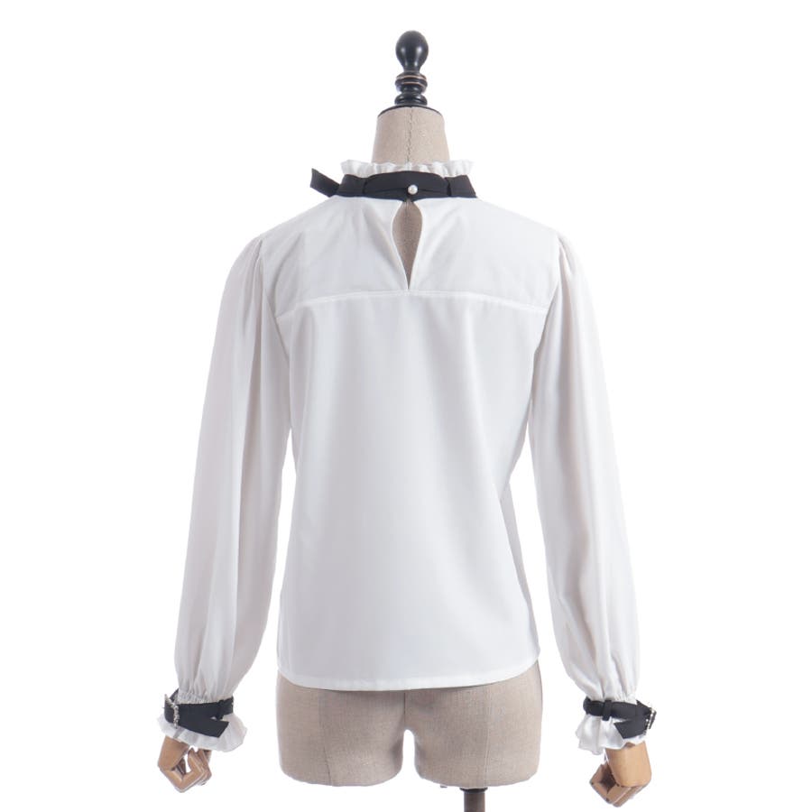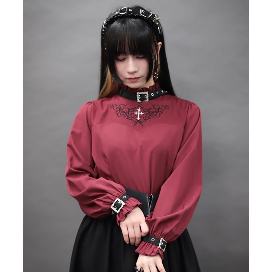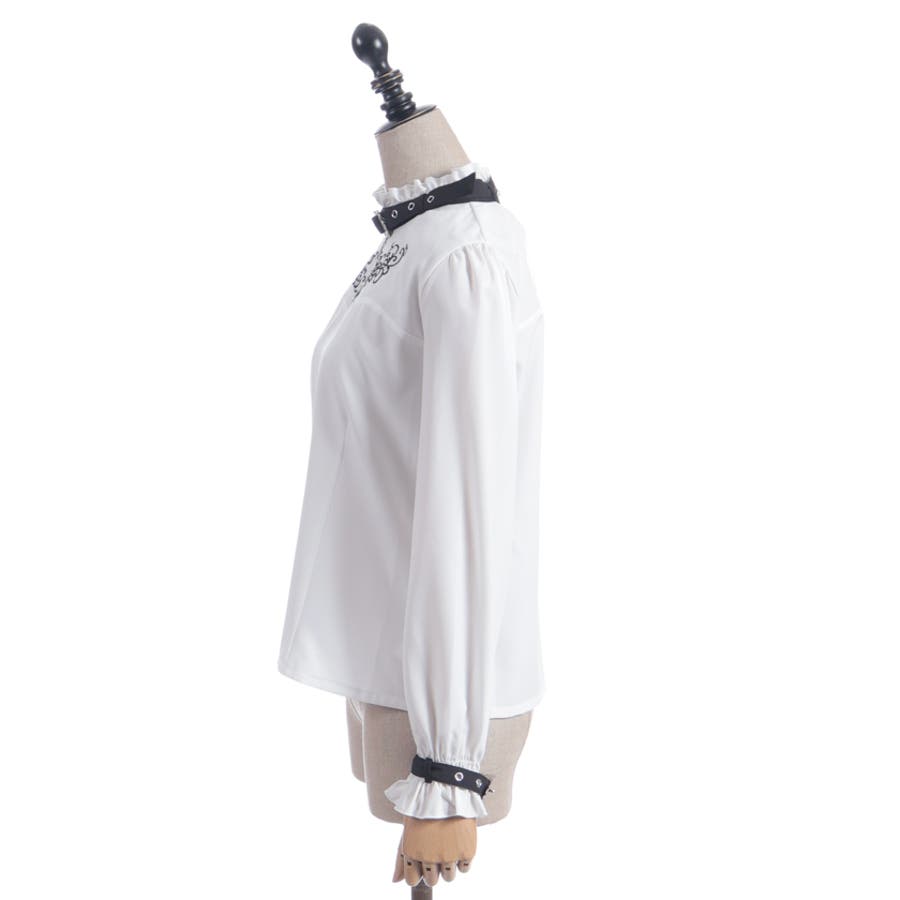 首元と袖口にベルトをあしらった辛口デザインのブラウスです。
