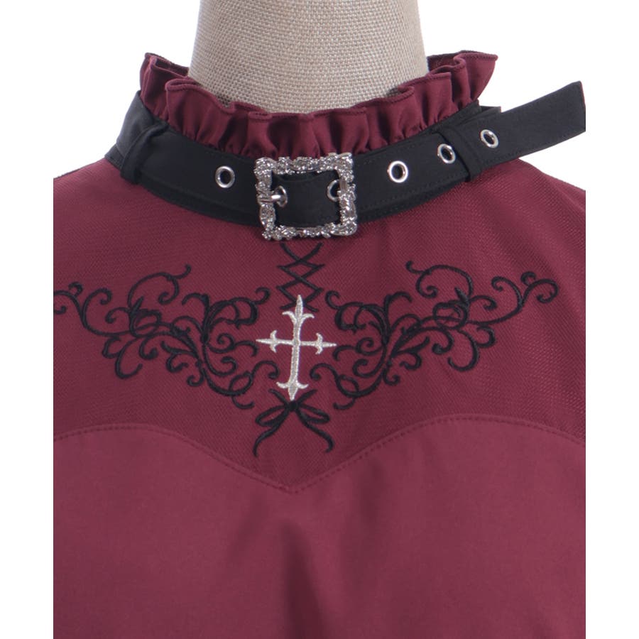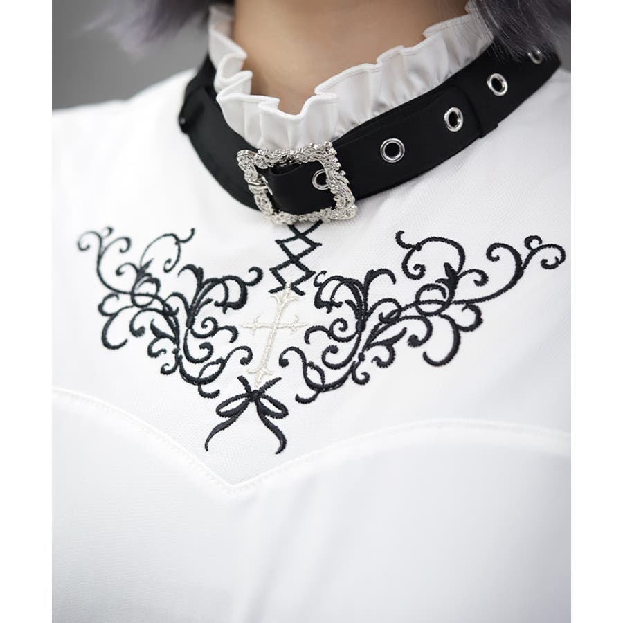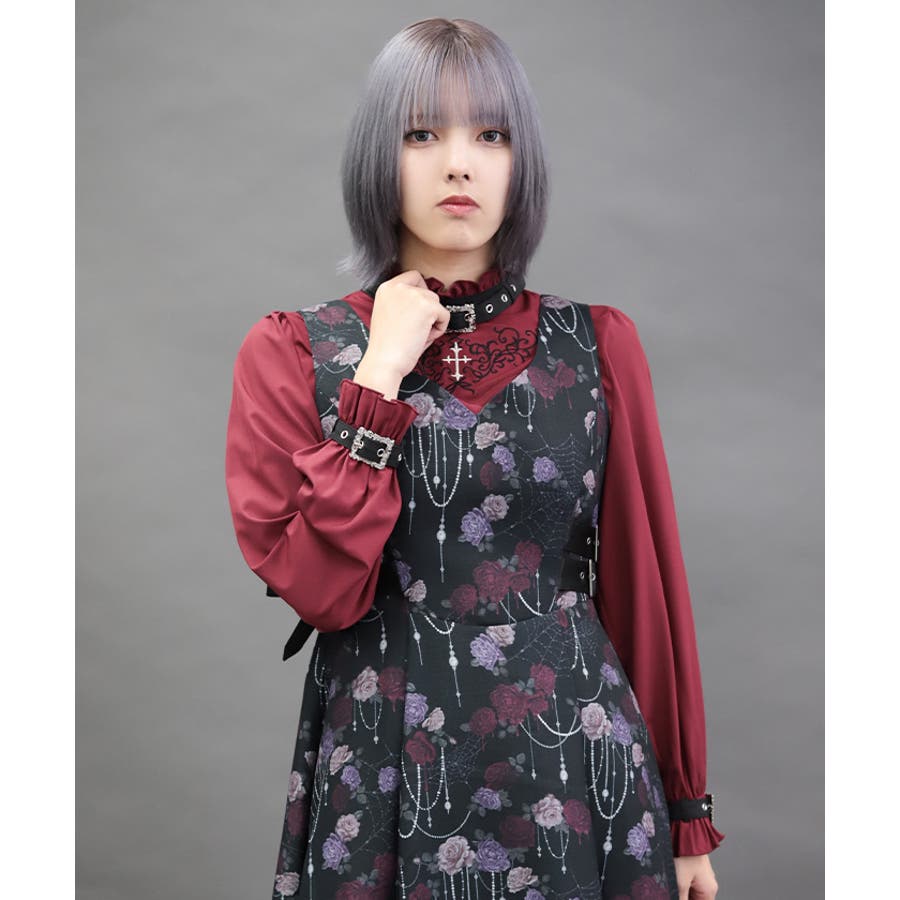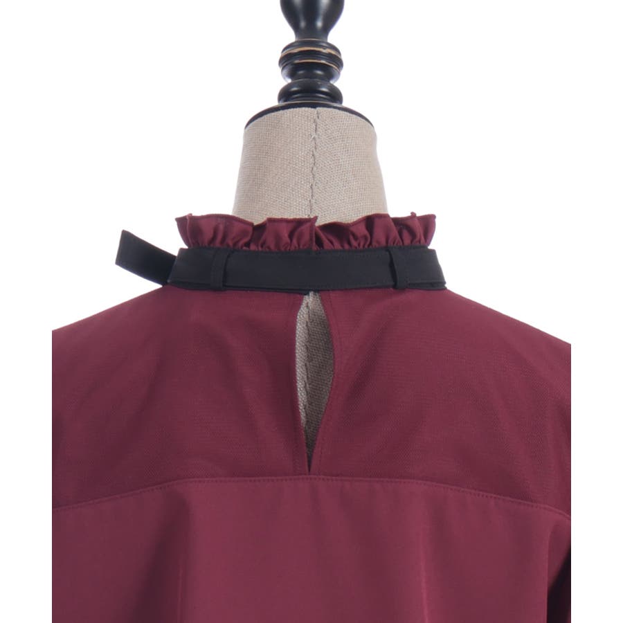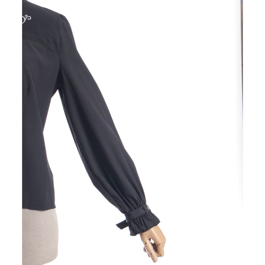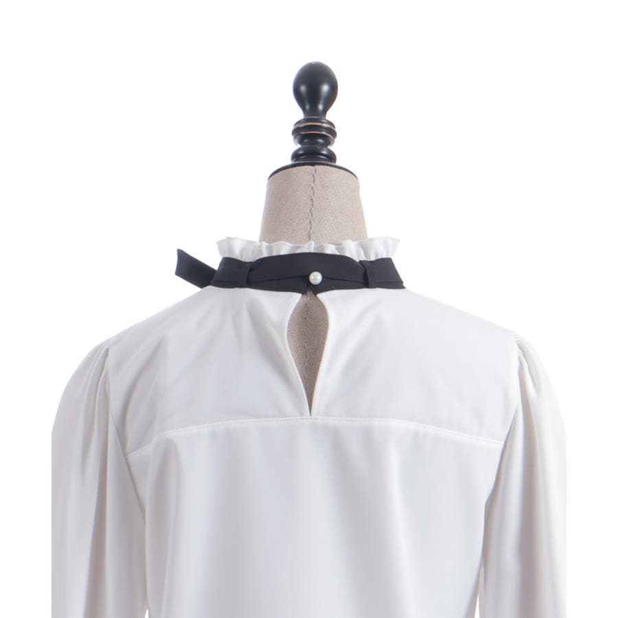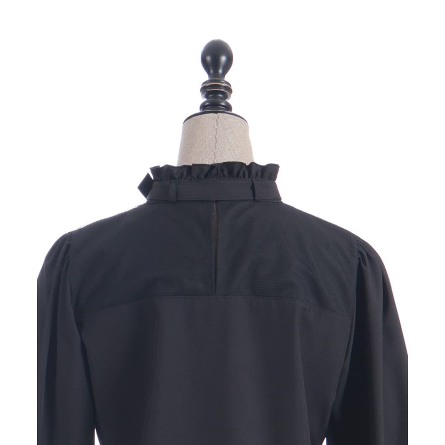 首元と袖口にベルトをあしらった辛口デザインのブラウスです。