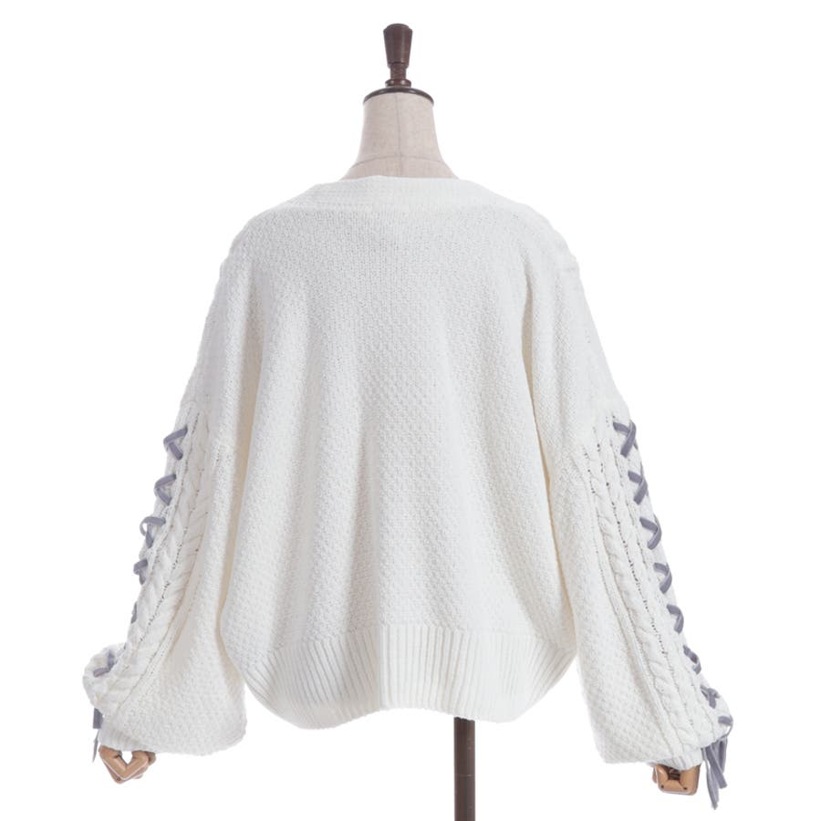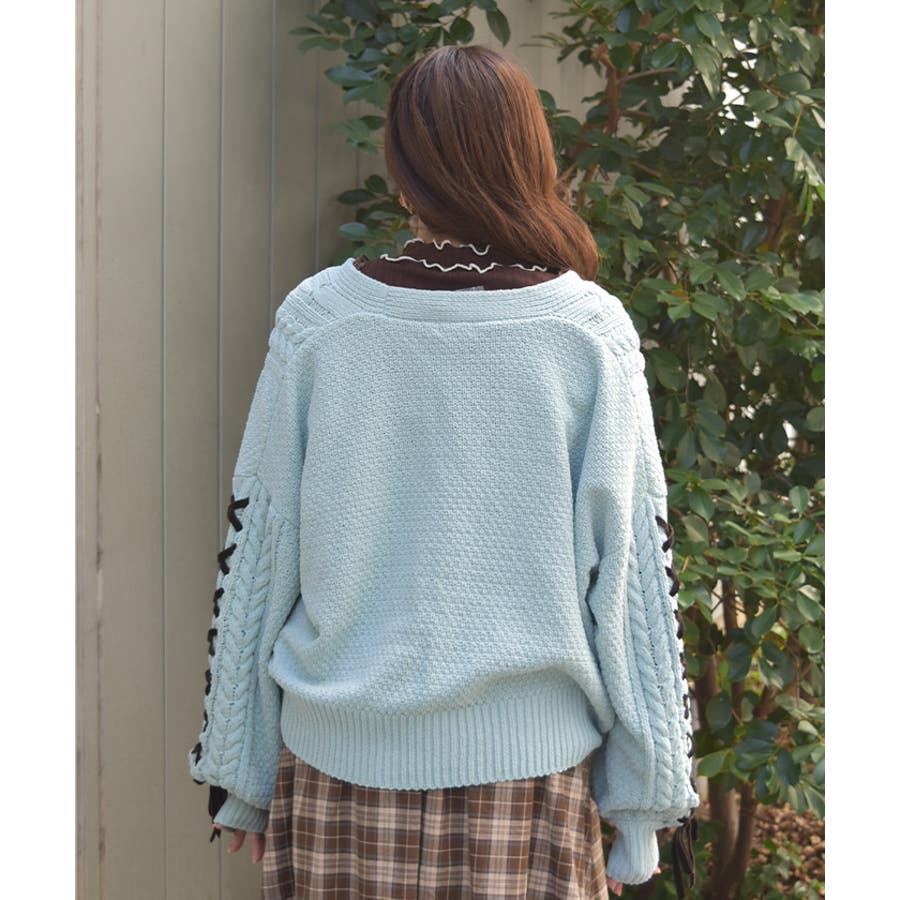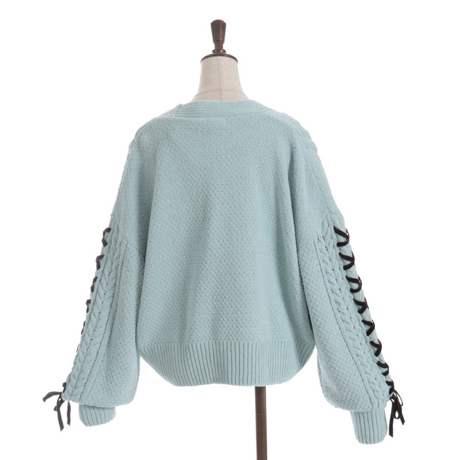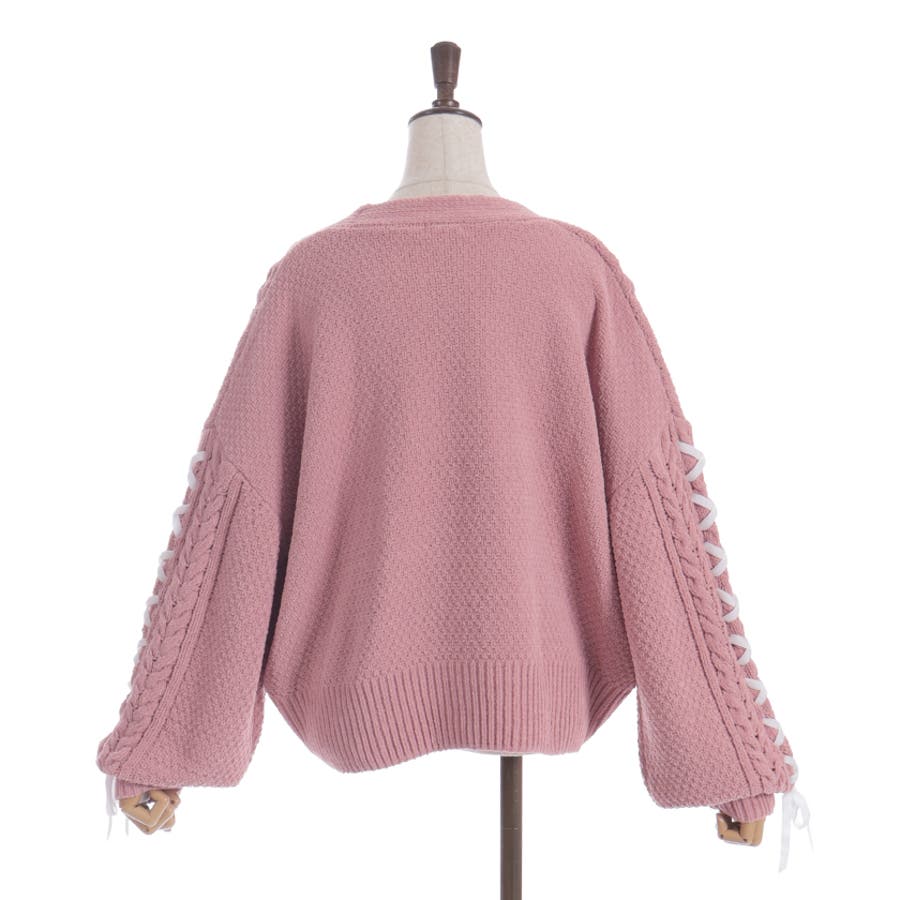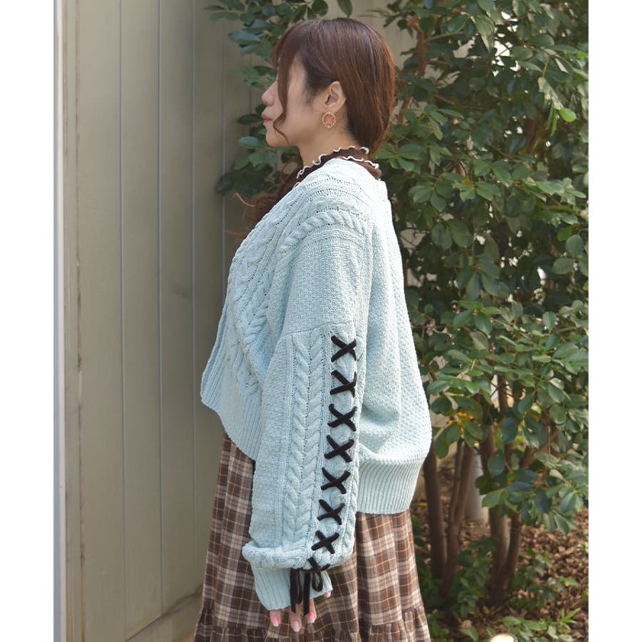 レースアップの袖デザインがポイントのニットカーディガンです。